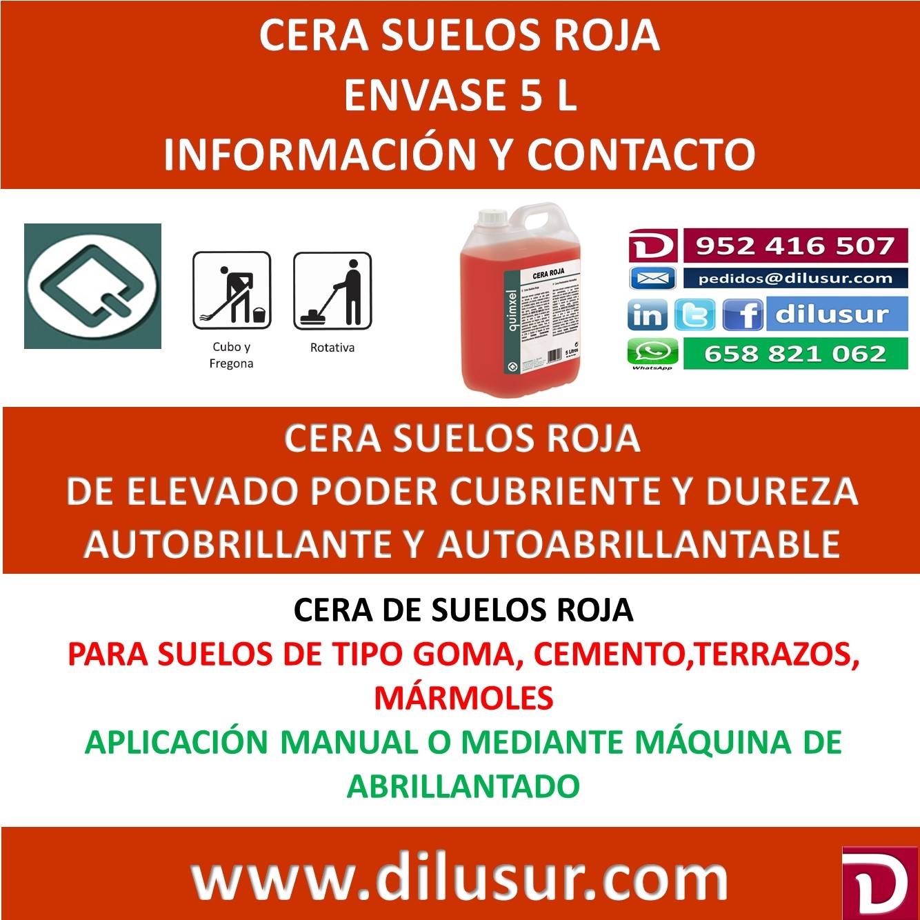Cera suelos roja, de elevado poder cubriente y dureza, con características autobrillantes y autoabrillantables para suelos de tipo goma, cemento, asfalto, terrazos, mármoles, etc. De alto poder penetrante y de fijación, confiriendo un brillo y realzando el tono de color. Aplicable a suelos de tipo rojizo.