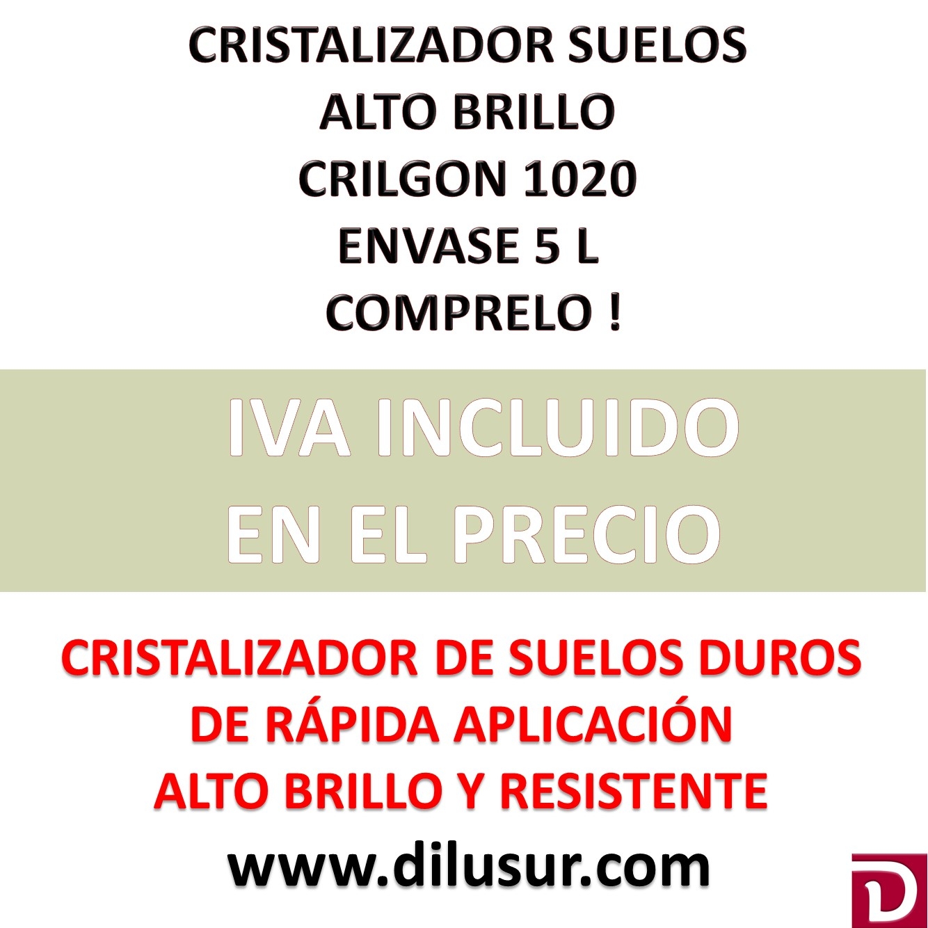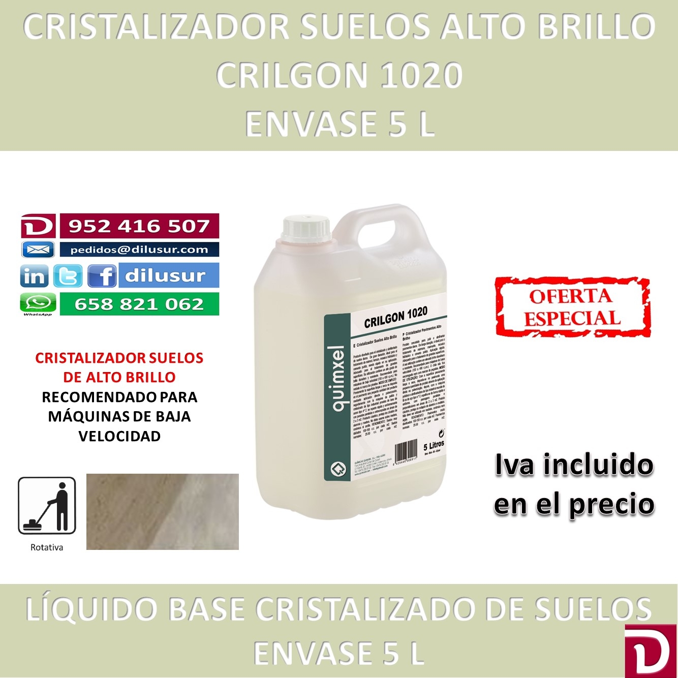 Cristalizador de suelos alto brillo, para cristalizado y abrillantado en suelos duros ( mármol, terrazo, etc). De gran duración. Para el tratamiento de grandes superficies. Recomendado para máquinas de baja velocidad. Envase 5 L. Iva incluido
