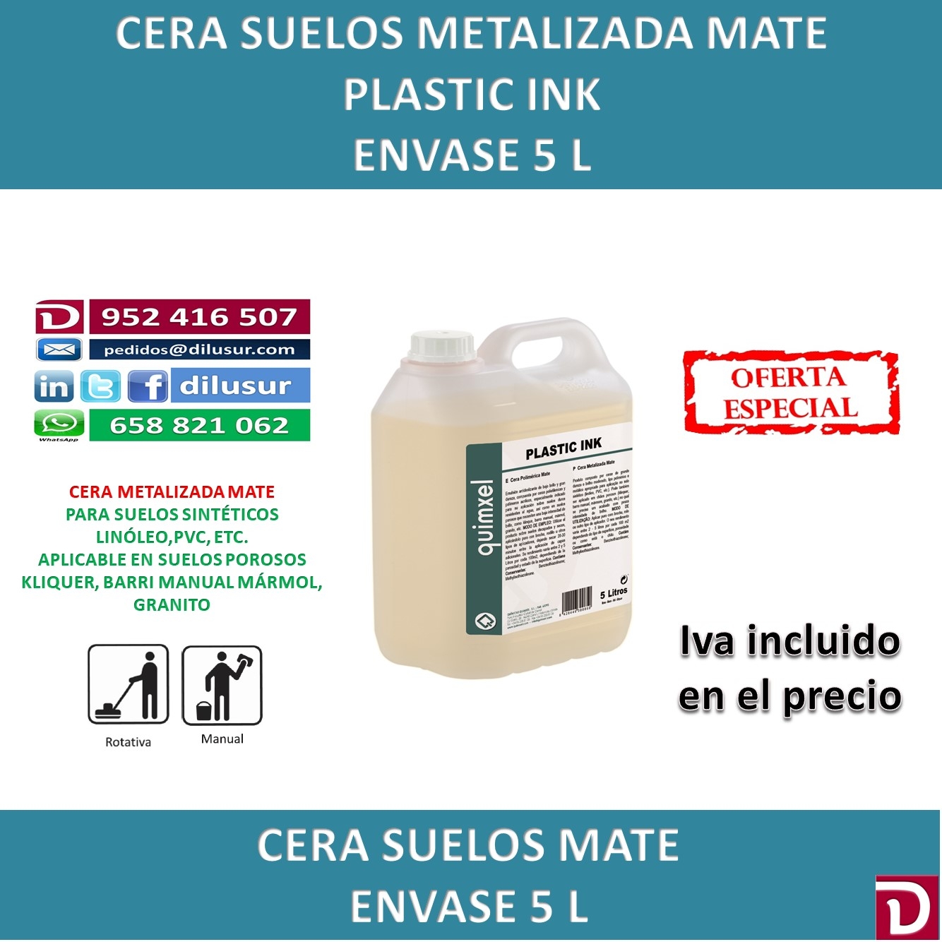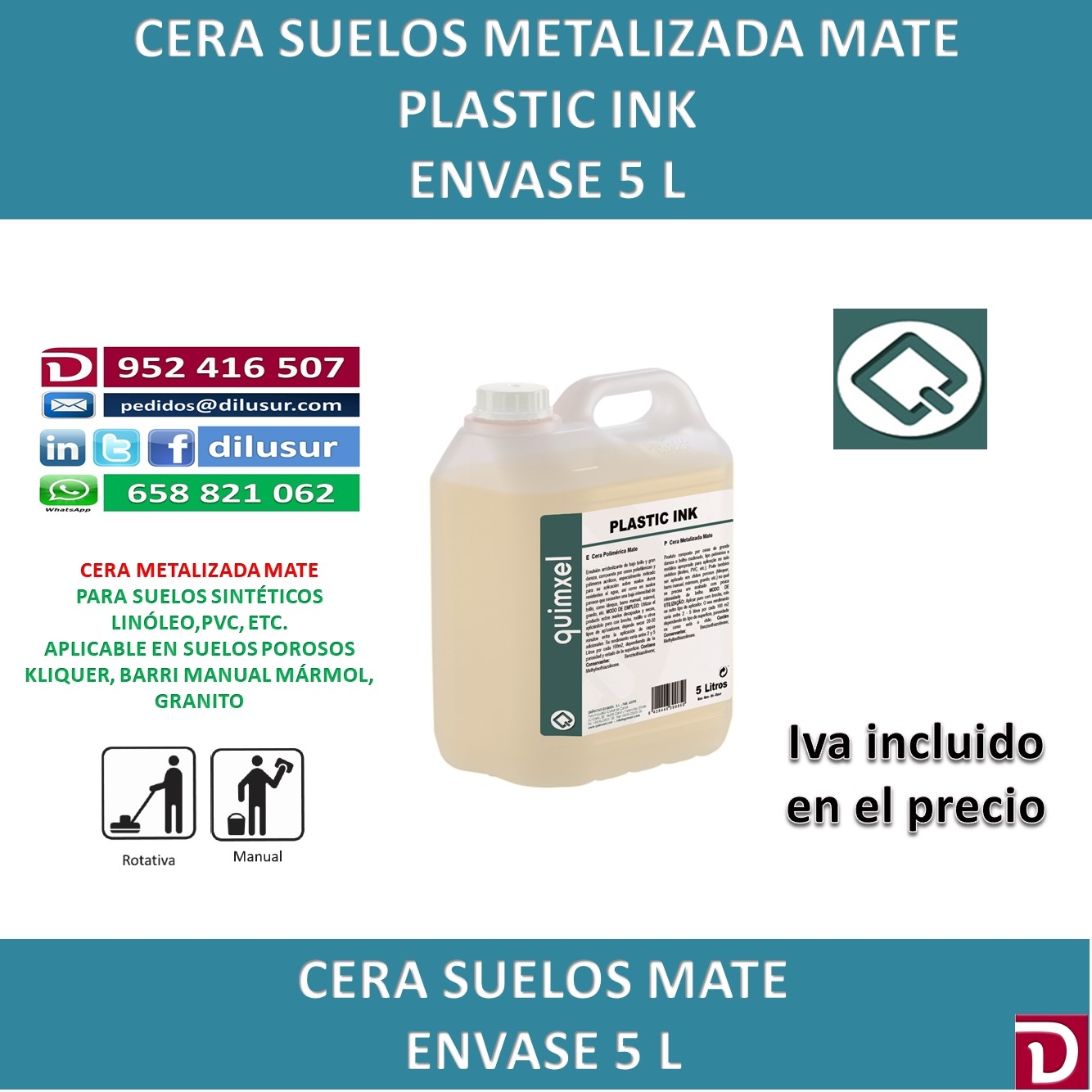 Cera metalizada mate, de gran dureza y brillo moderado, para suelos sintéticos, linóleo, pvc, etc. También se puede aplicar en sulos porosos, klinquer, barro manual, mármol, granito, etc. Acabado con baja intensidad de brillo. Envase 5 L. IVA incluido