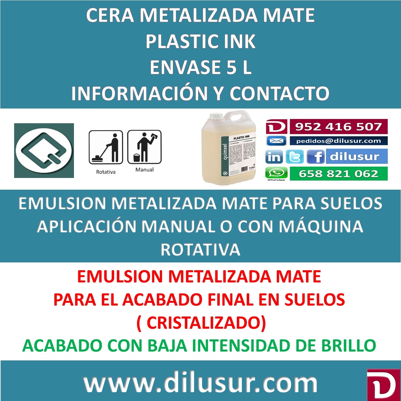 Producto compuesto pòr ceras de gran dureza y brillo moderado, de tipo polimérico y metalizado indicado para su aplicación sobre suelos sintéticos ( linóleo, pvc, etc). Puede ser aplicado en suelos porosos ( klinquer, barro manual, mármol, granito etc. ).