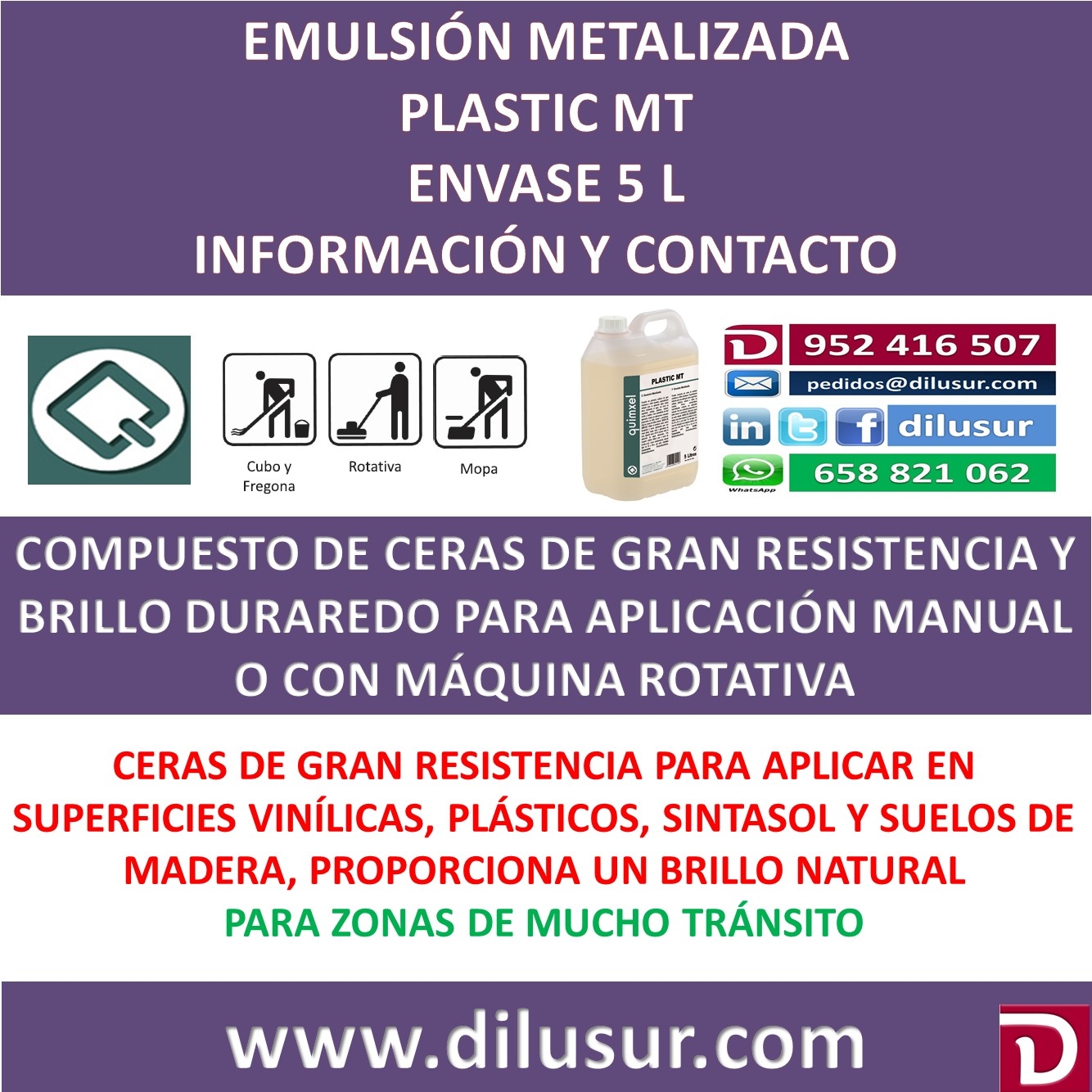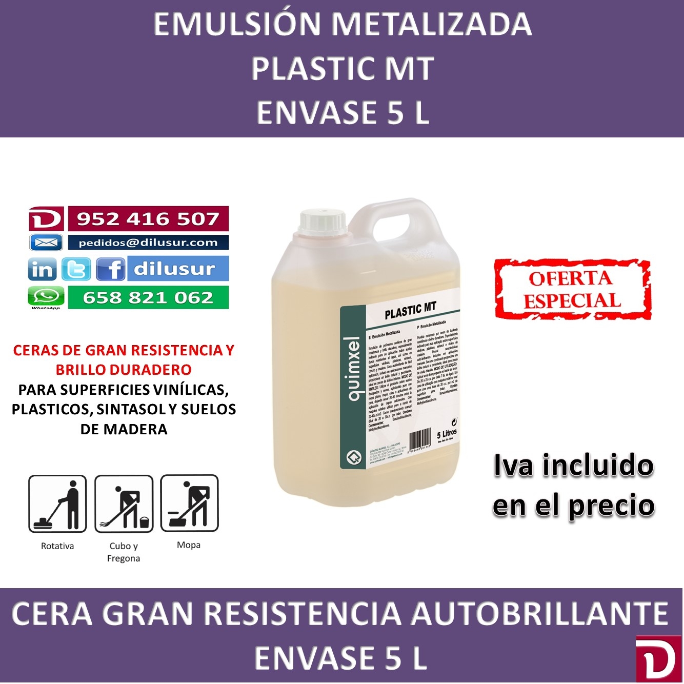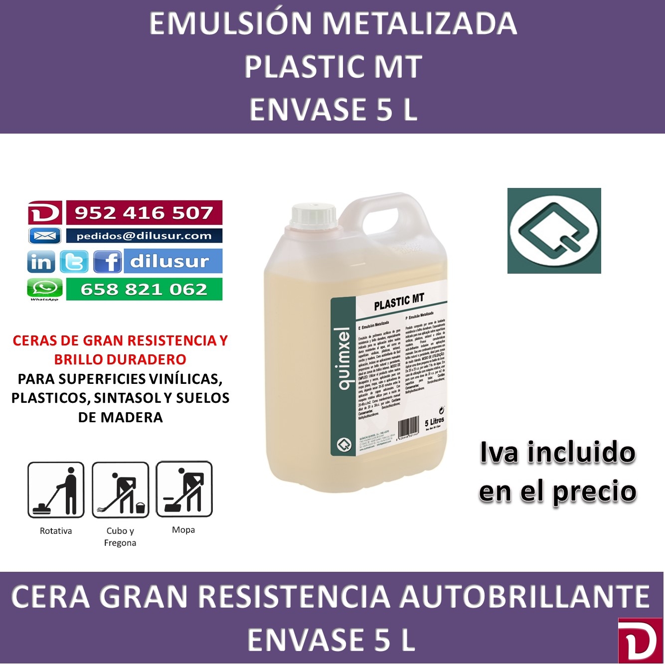 Emulsion metalizada compuesta a base de ceras de gran resistencia y brillo duradero, aplicar sobre superficies vinílicas, plásticos, sintasol y suelos de madera. Su uso continuado proporciona un brillo natural y persistente. Envase 5 L. Iva incluido