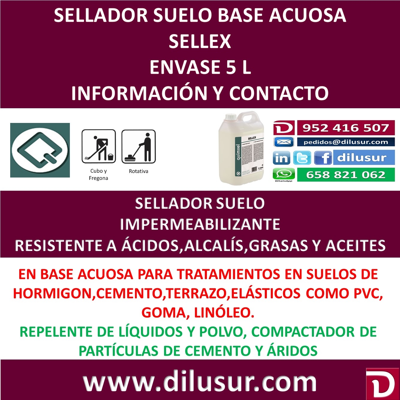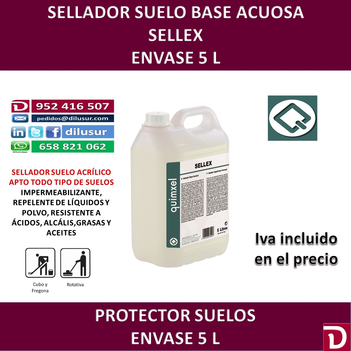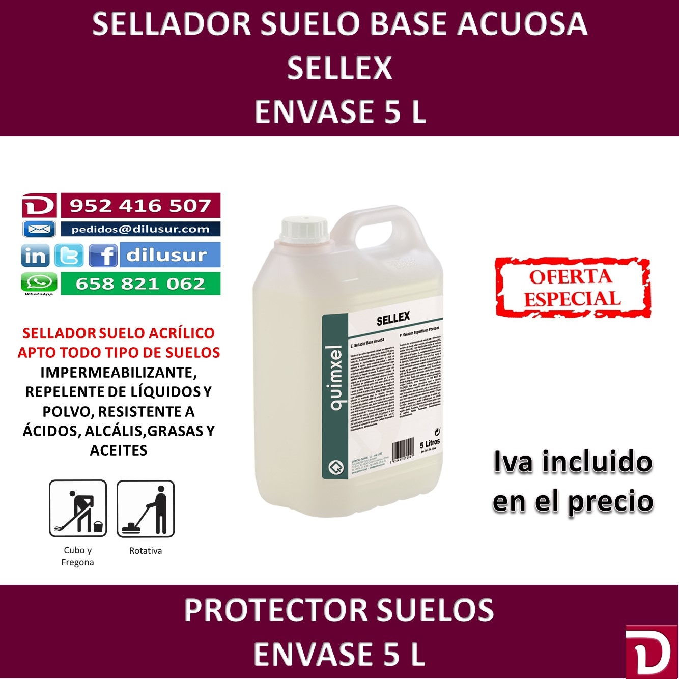 Sellador de suelos acrílico para todo tipo de suelos.Impermeabilizante, repelente de líquidos y polvo, Adecuado en naves industriales, almacenes, supermercados y garajes.Resistente frente a ácidos, alcális, a grasas y aceites.Envase 5 L. Iva incluido