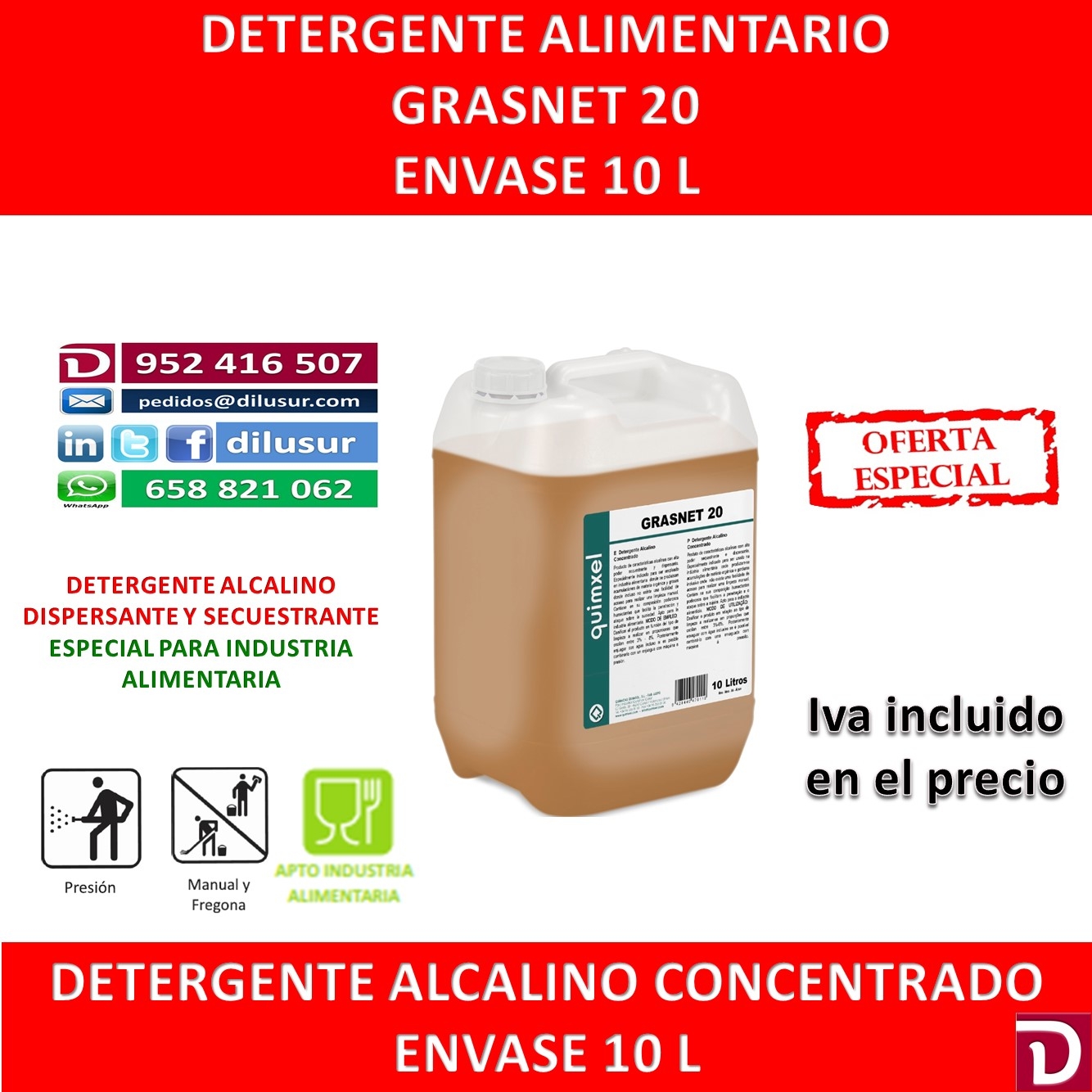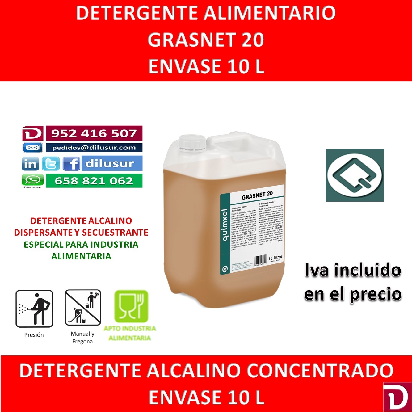 Detergente alcalino concentrado, de alto poder secuestrante y dispersante para la industria alimentaria, alli donde se acumule materia orgánica y grasas. Envase 10 L, Iva incluido.