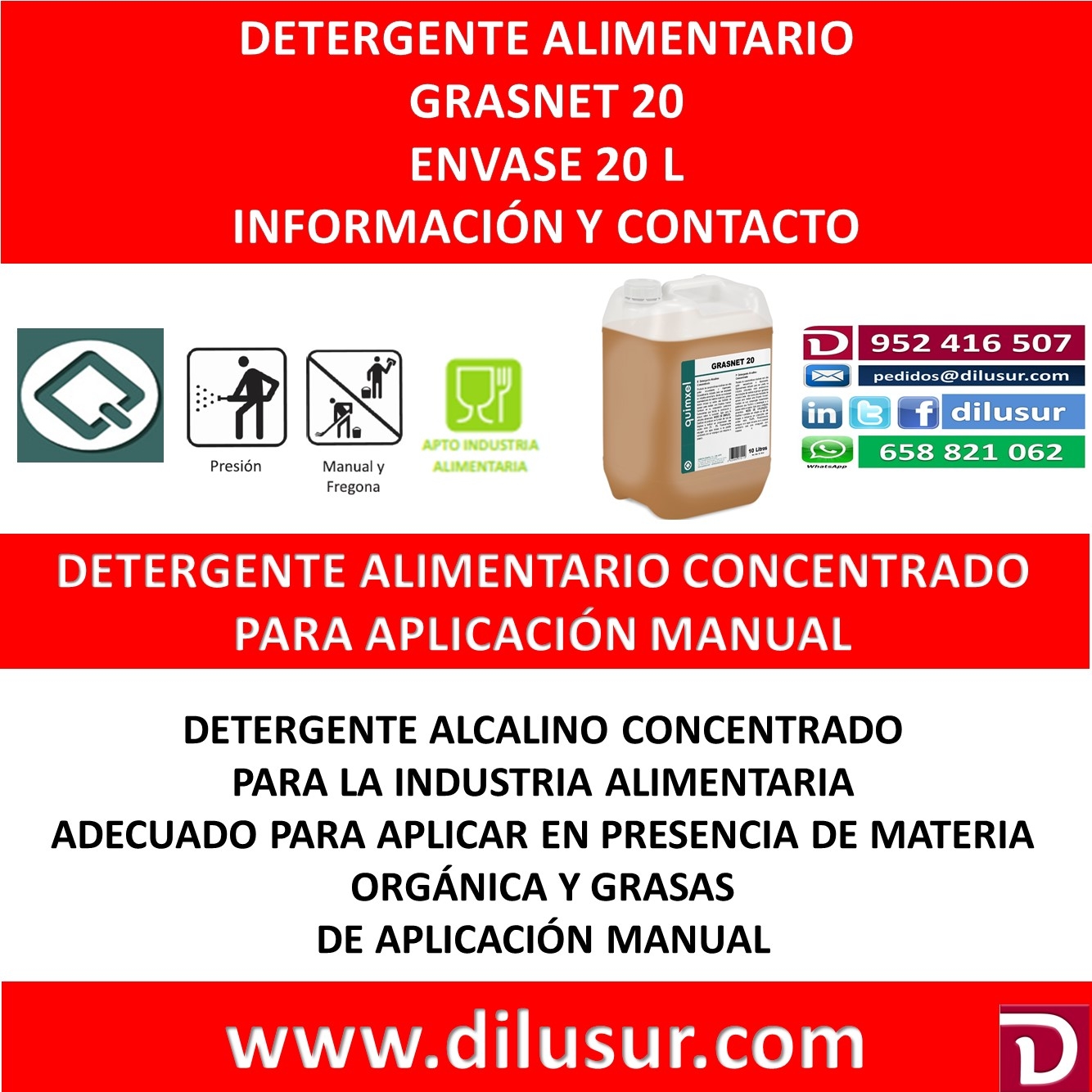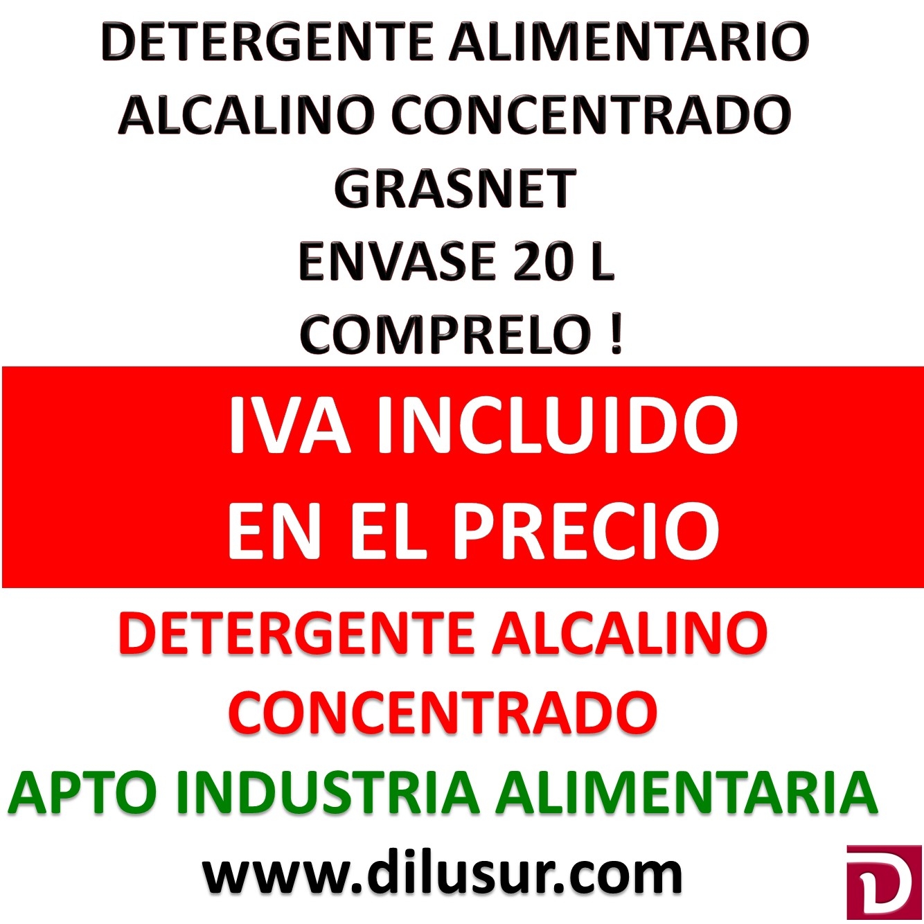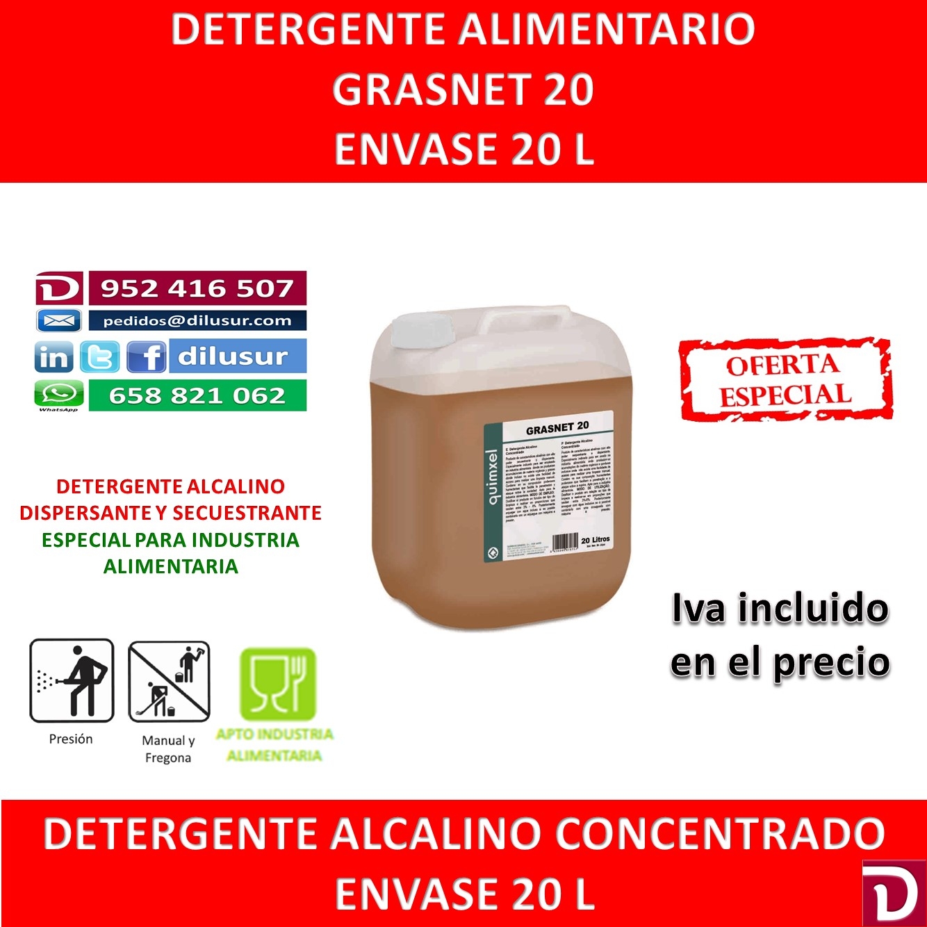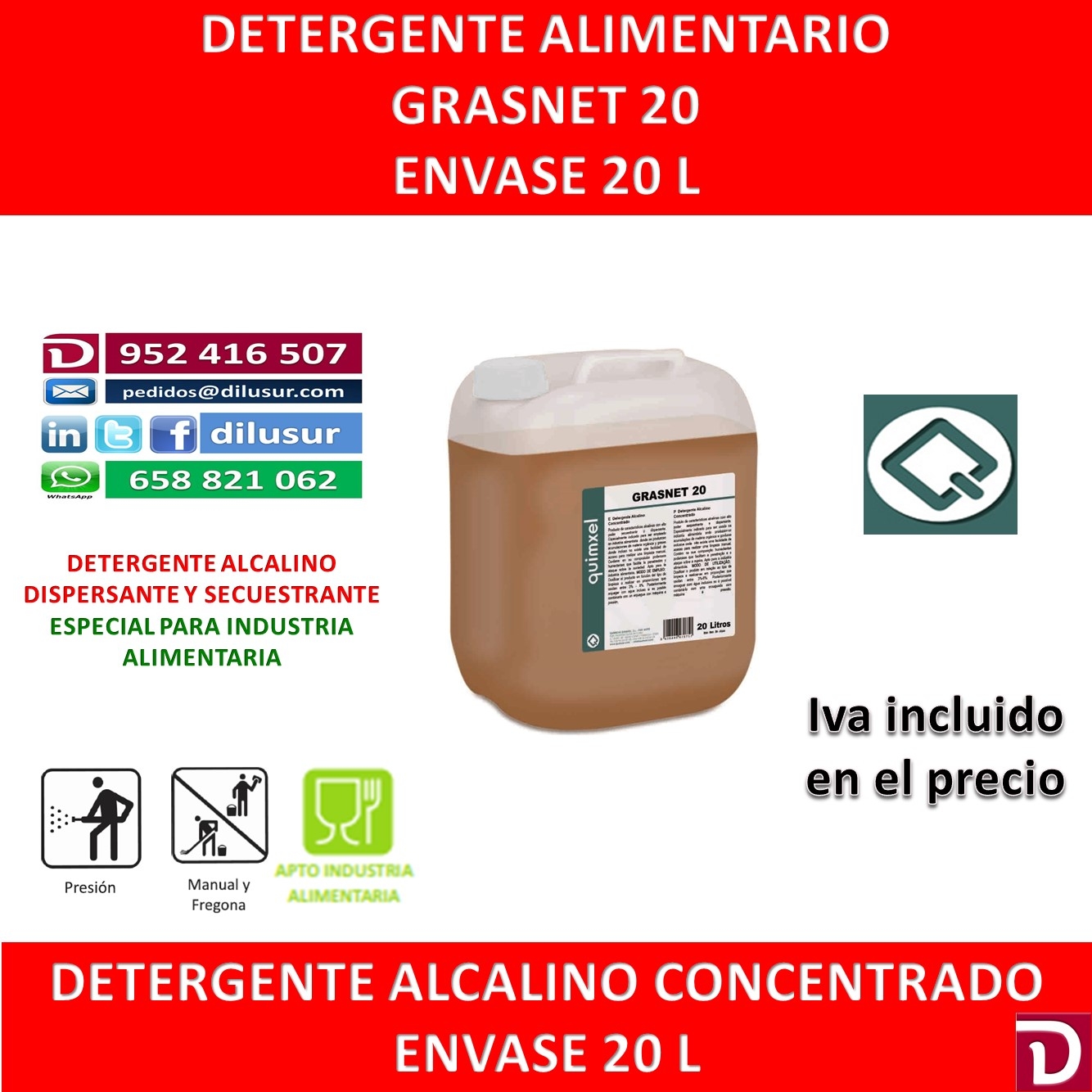 Detergente alcalino concentrado, de alto poder secuestrante y dispersante para la industria alimentaria, alli donde se acumule materia orgánica y grasas. Envase 20 L, Iva incluido.