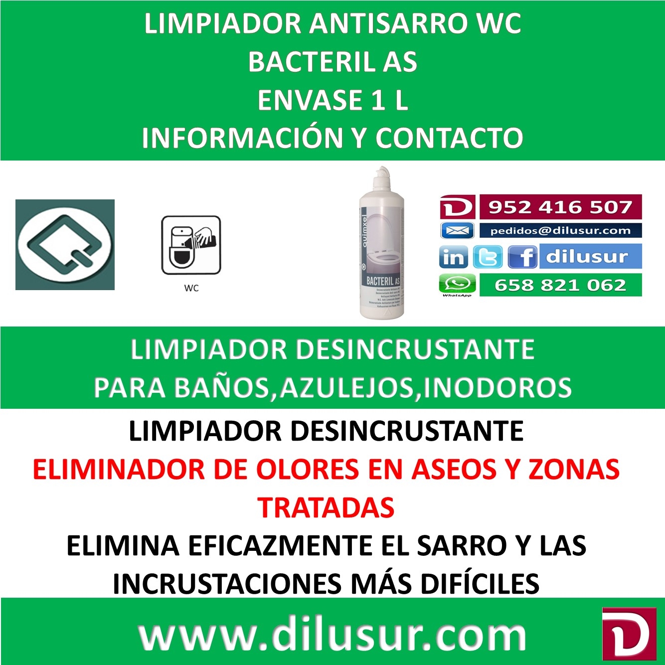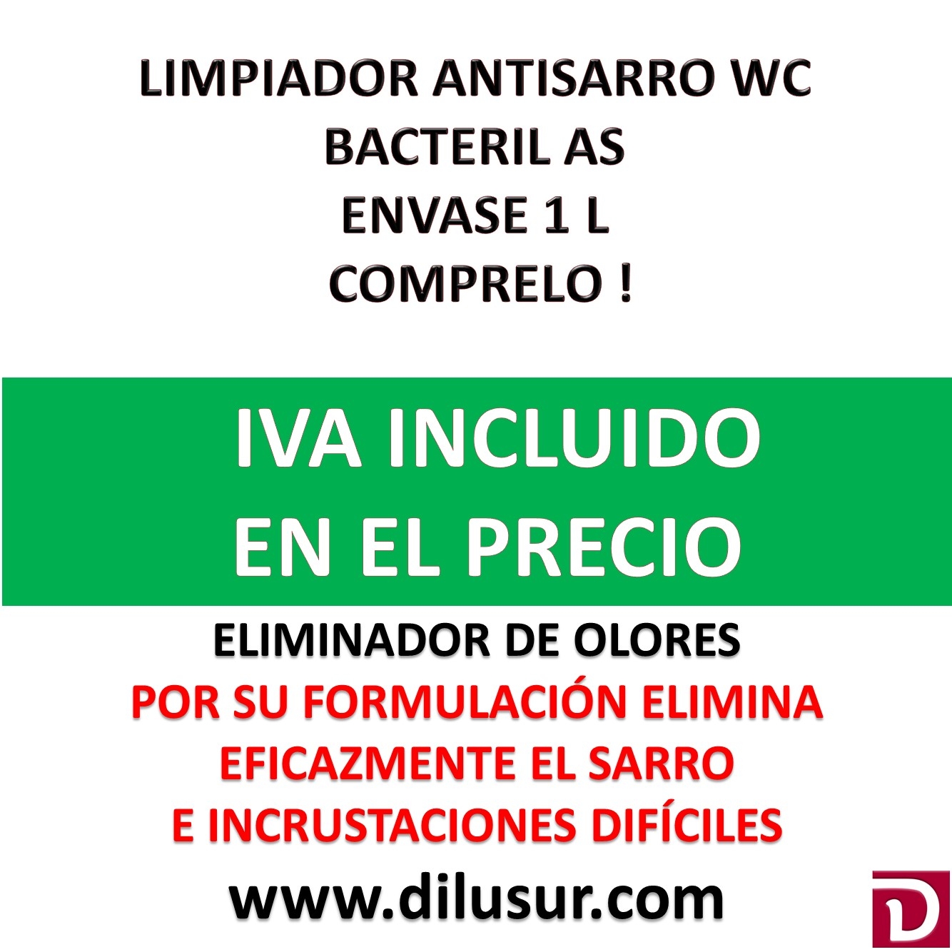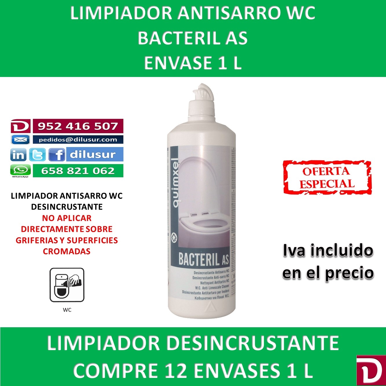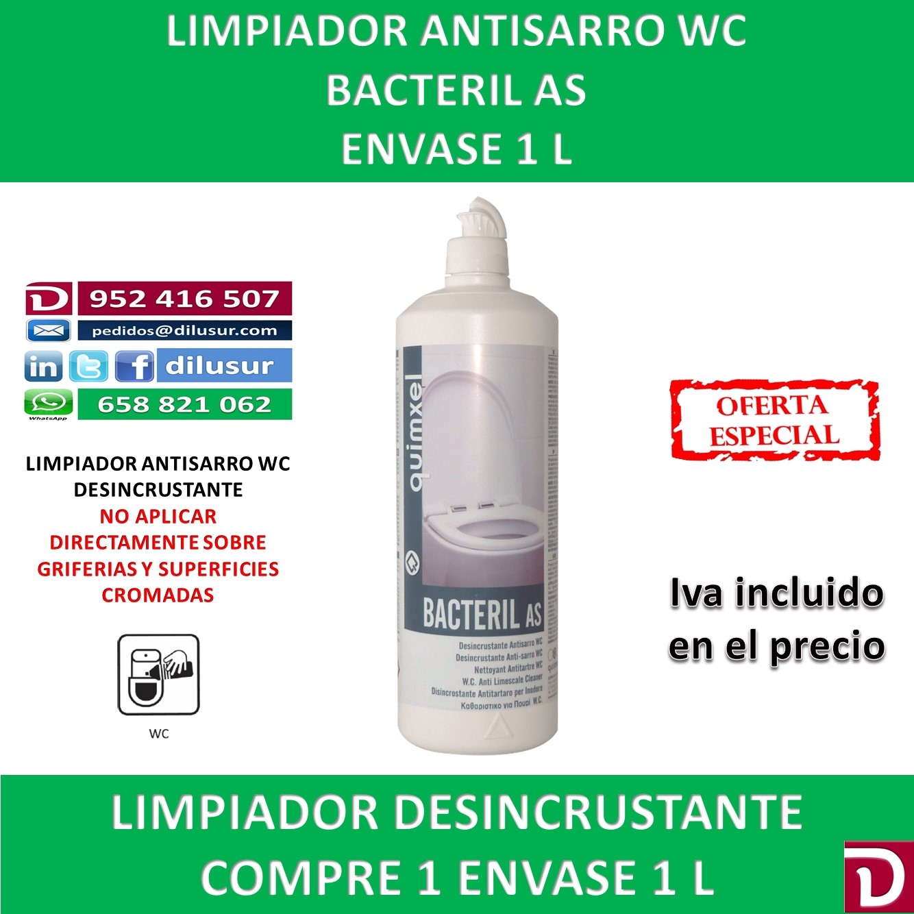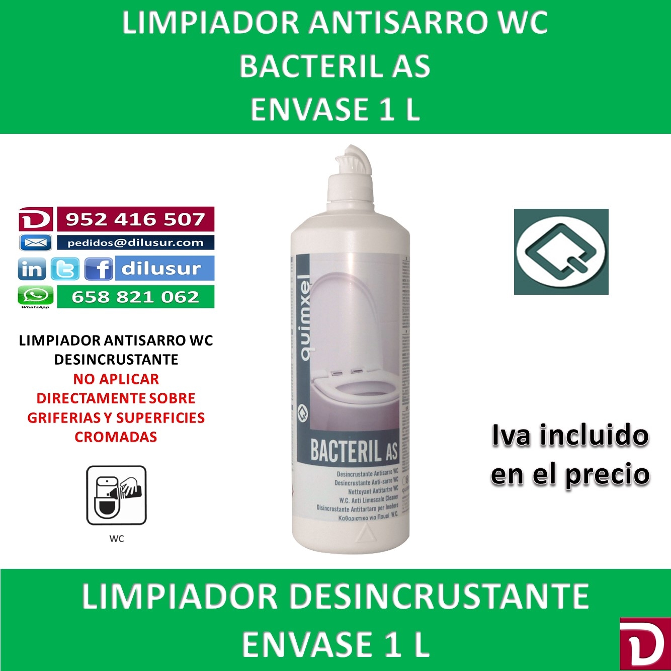 Limpiador antisarro WC, creado para la desincrustación y limpieza, reductor de malos olores en aseos o zonas tratadas. Elimina el sarro e incrustaciones difíciles. No aplicar directamente sobre griferias y cromados. Envase 1 L. Iva incluido