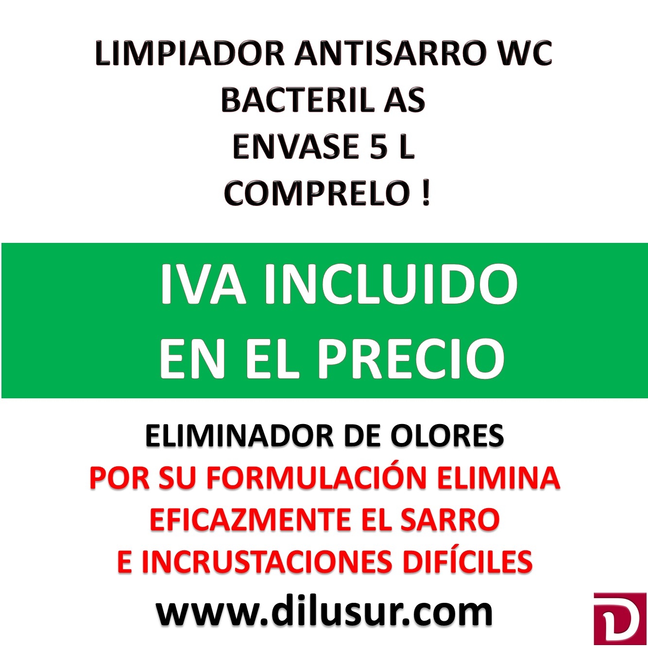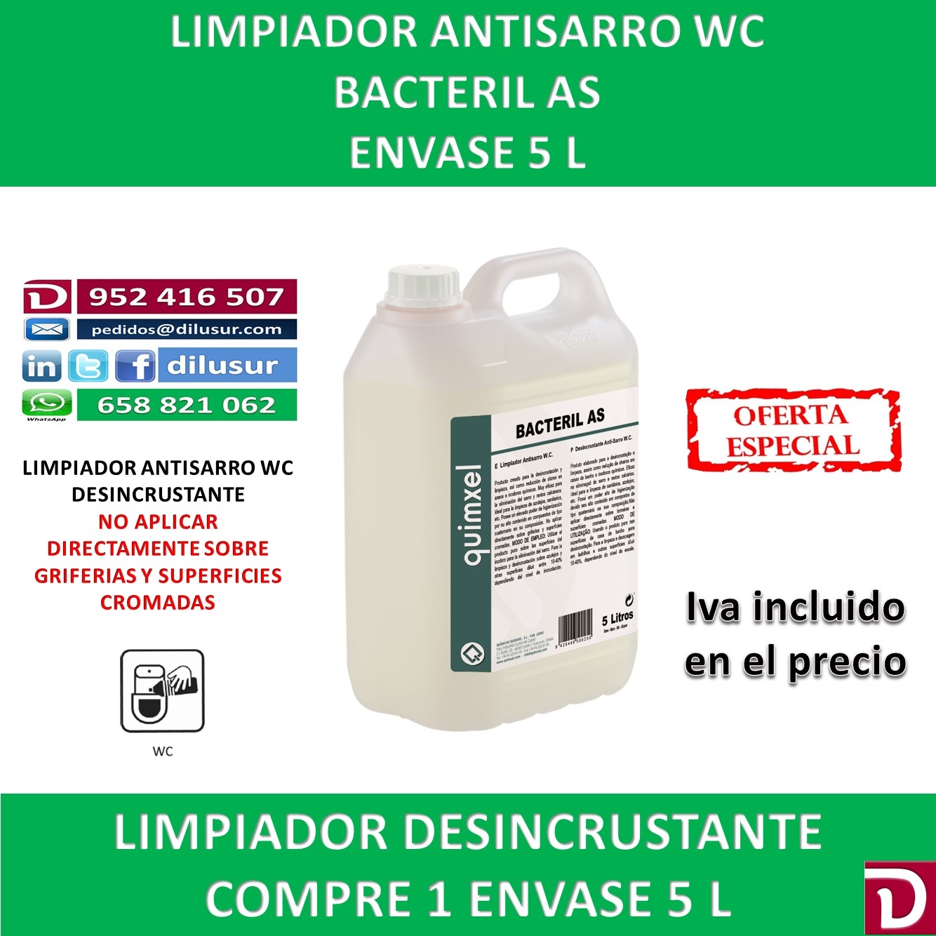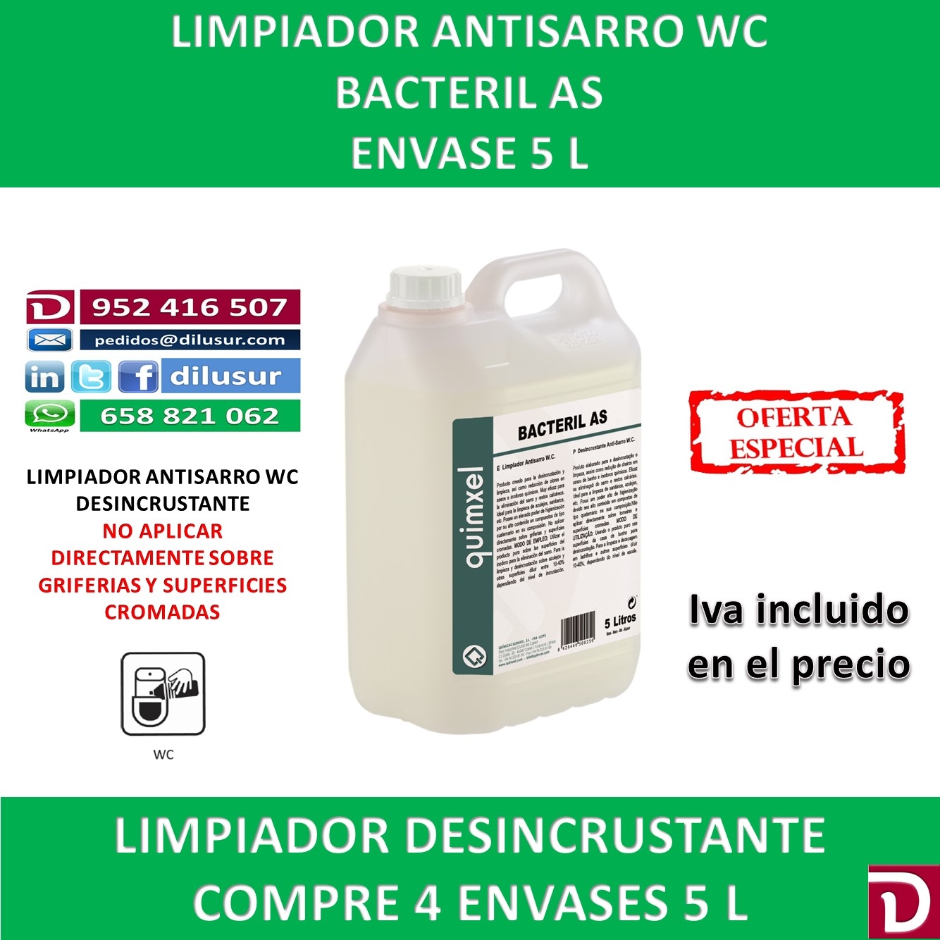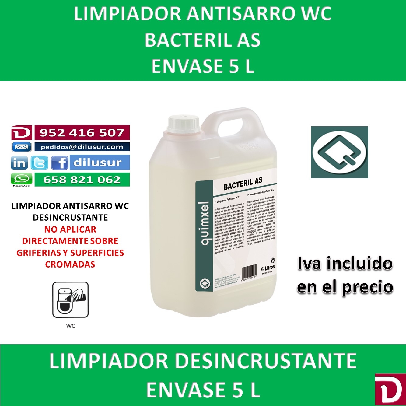 Limpiador antisarro WC, creado para la desincrustación y limpieza, reductor de malos olores en aseos o zonas tratadas. Elimina el sarro e incrustaciones difíciles. No aplicar directamente sobre griferias y cromados. Envase 5 L. Iva incluido