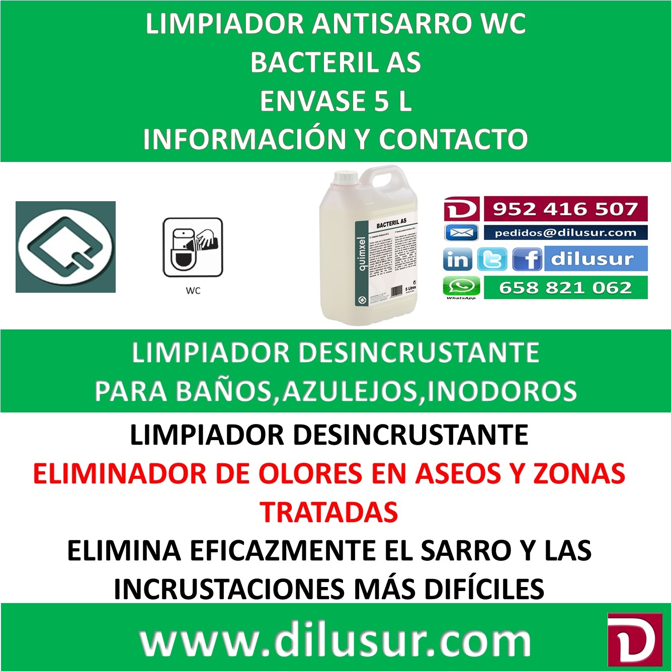 Limpiador antisarro para WC, creado especialmente para la desincrustación y limpieza, asi como para la reducción de olores en aseos o zonas tratadas. De alta eficiencia para la eliminación de sarro e incrustaciones difíciles. Adecuado para la limpieza de azulejos, sanitarios y baños.