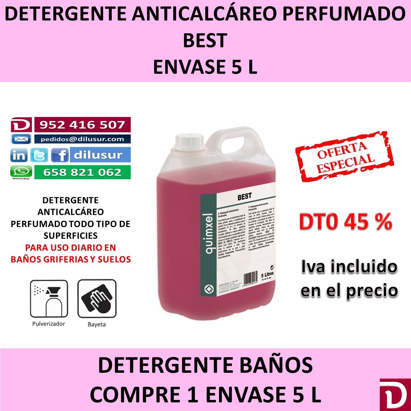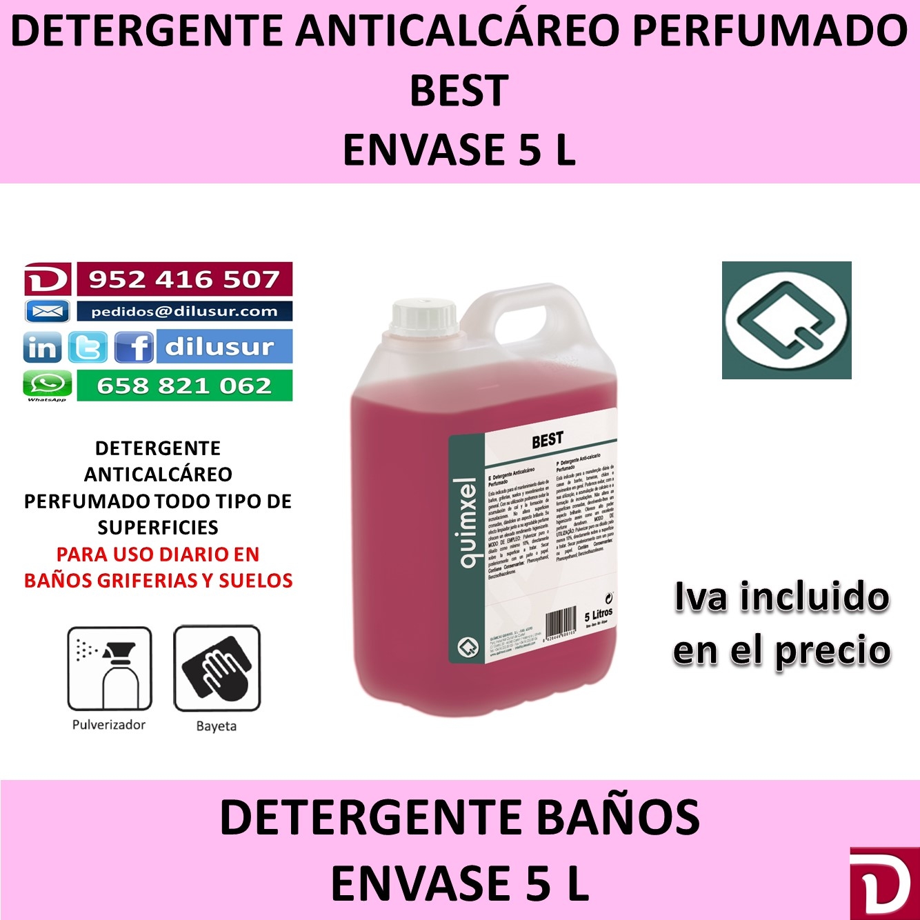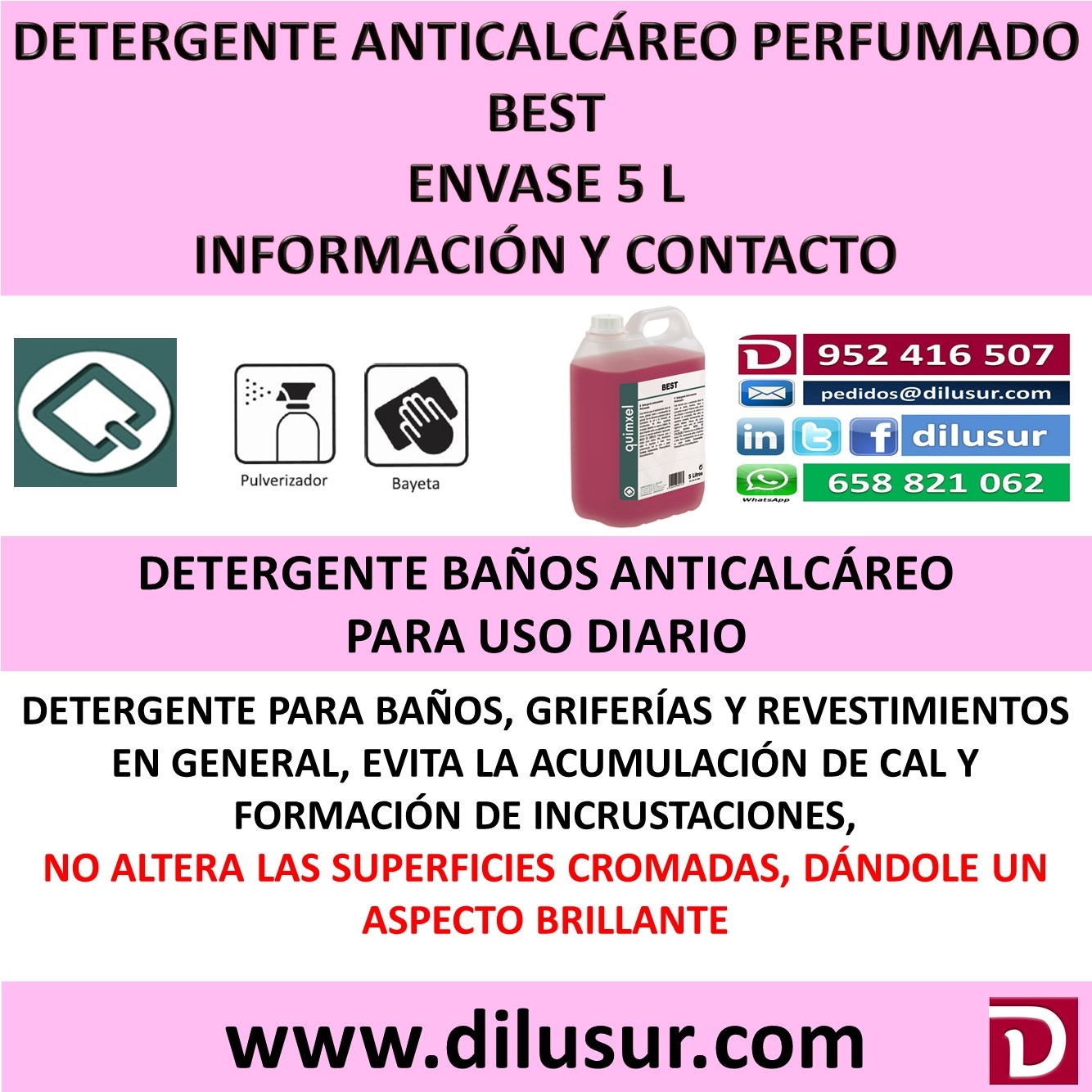 Detergente anticalcáreo perfumado para el mantenimiento diario de baños, griferías, suelos y revestimientos en general, Previene la cal y la formación de incrustaciones. No altera superficies cromadas abrillantándolas. Envase 5 L. Iva incluido