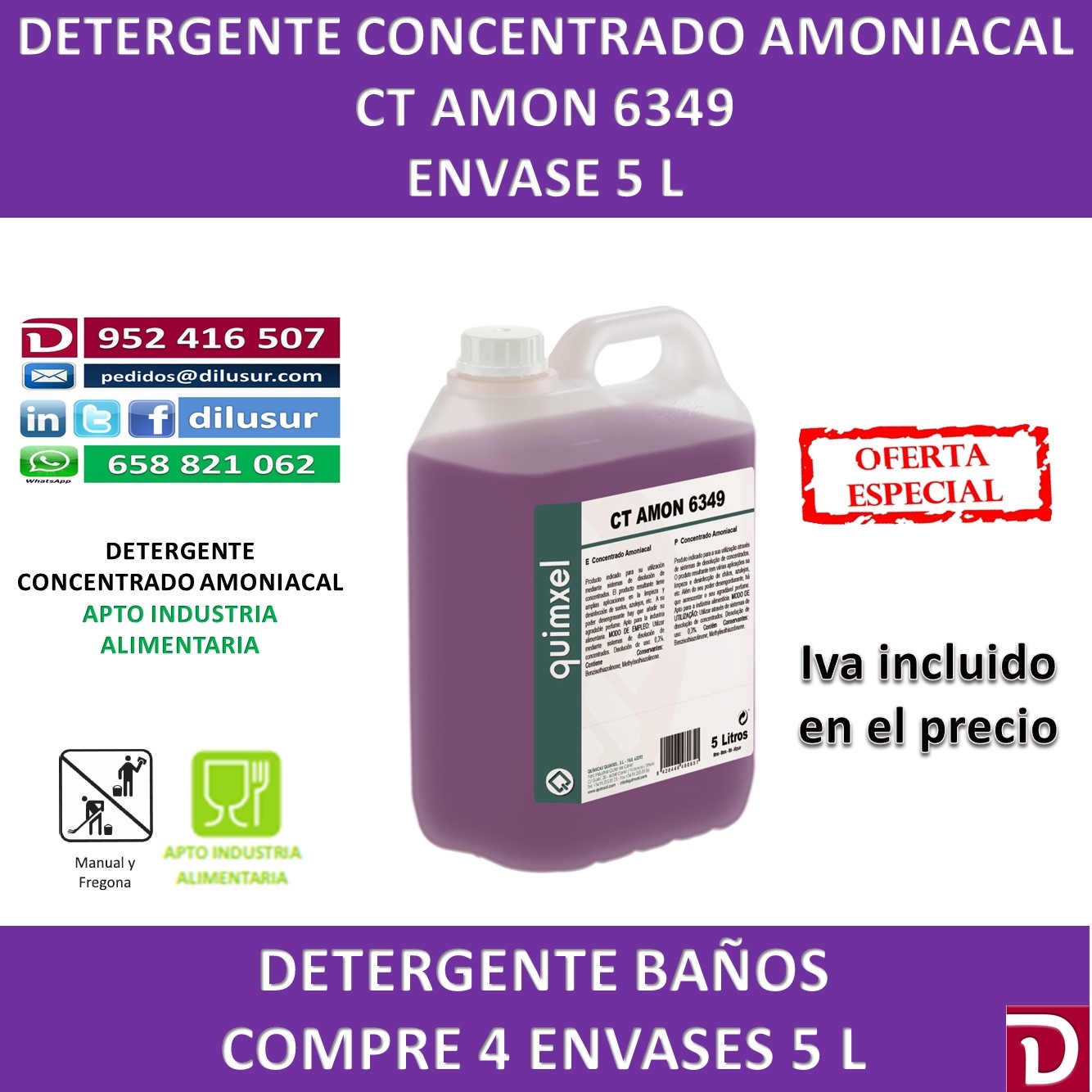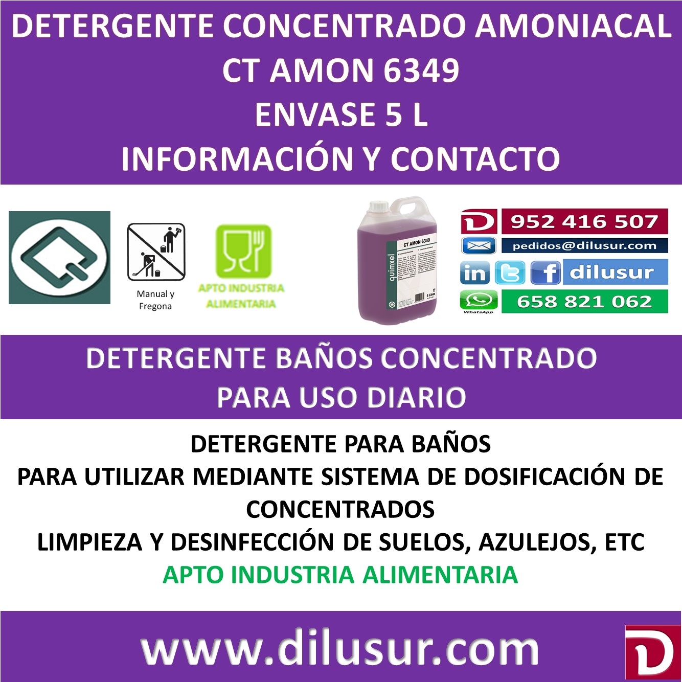 Concentrado amoniacal, para utilizar en sistema de disolución de concentrados. De amplias aplicaciones en la limpieza y desinfección de suelos, azulejos etc. Alto poder desengrasante y agradable perfume. Envase 5 L. Iva incluido