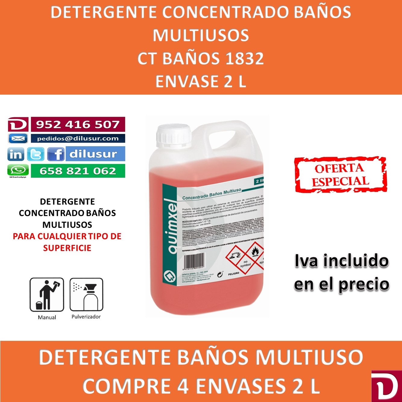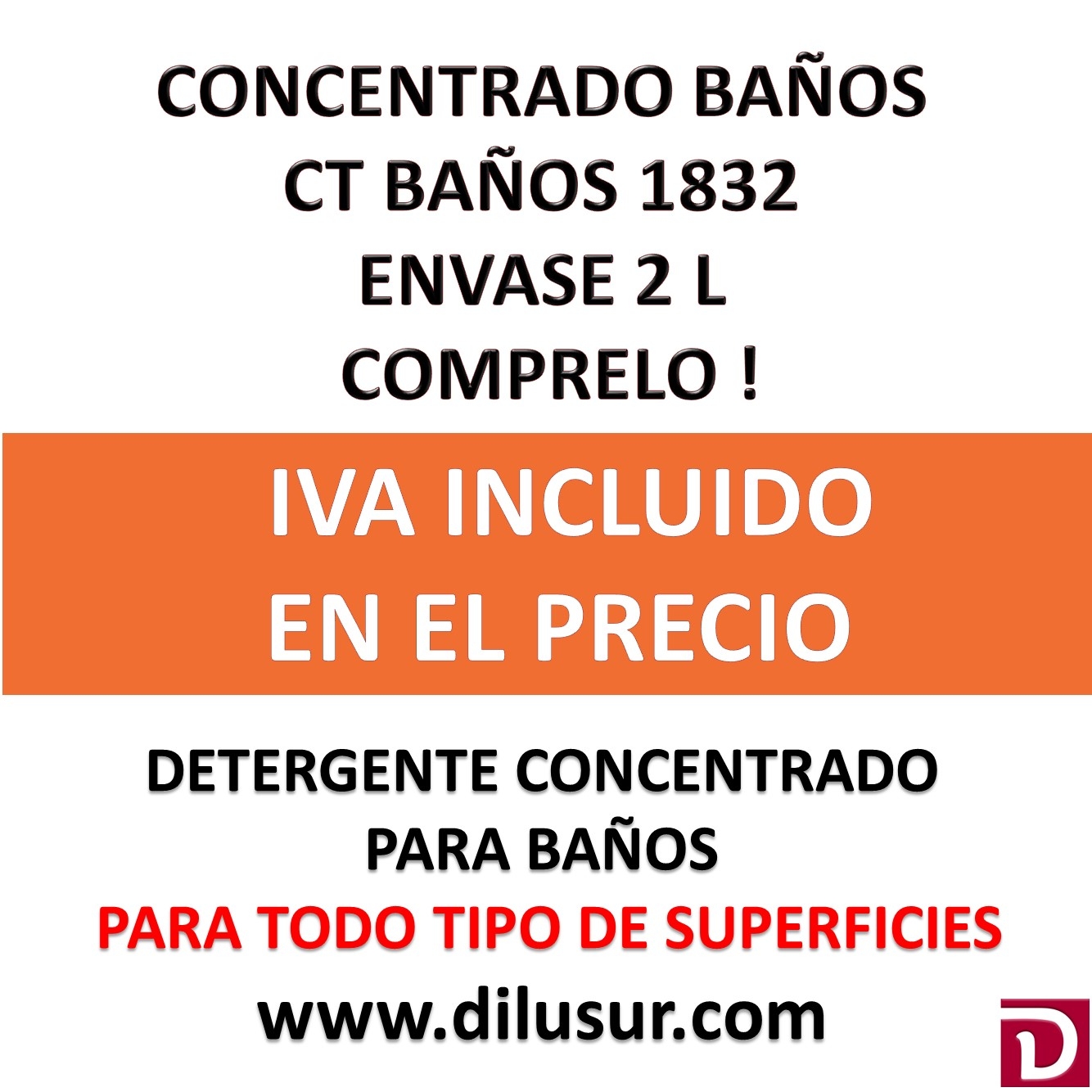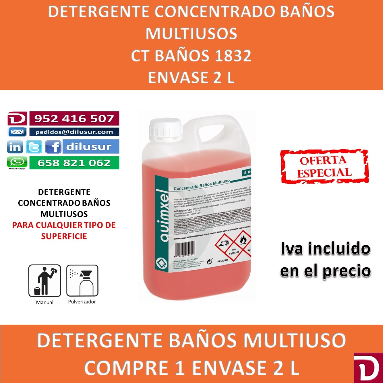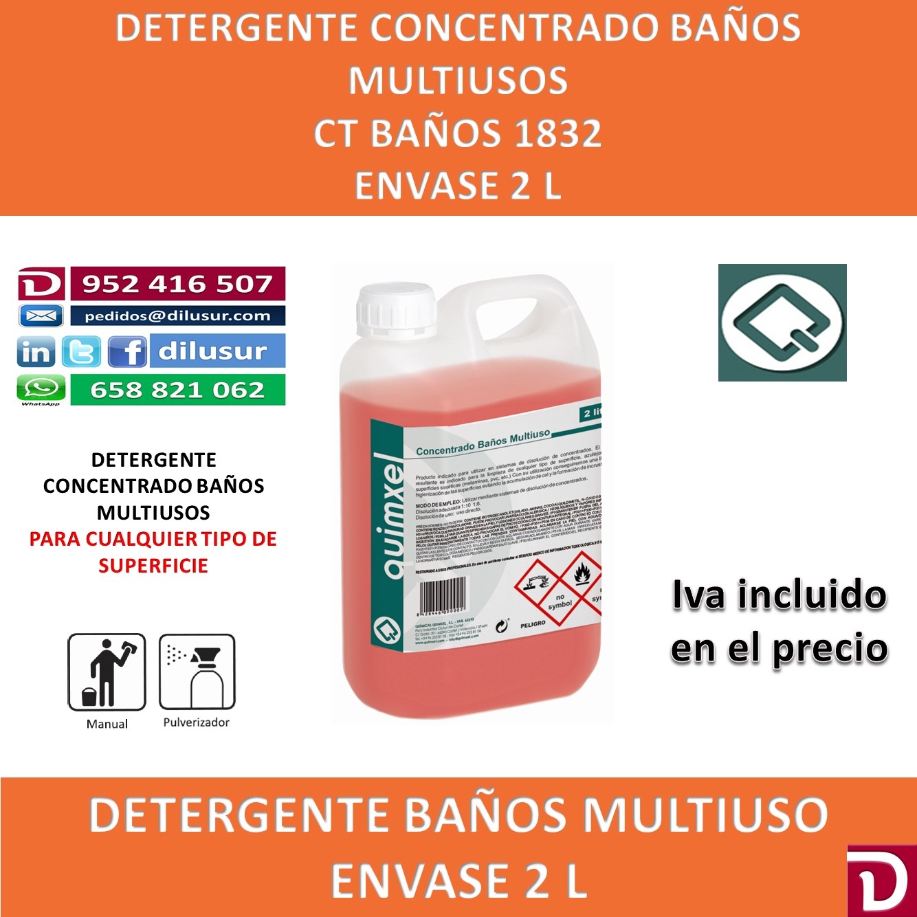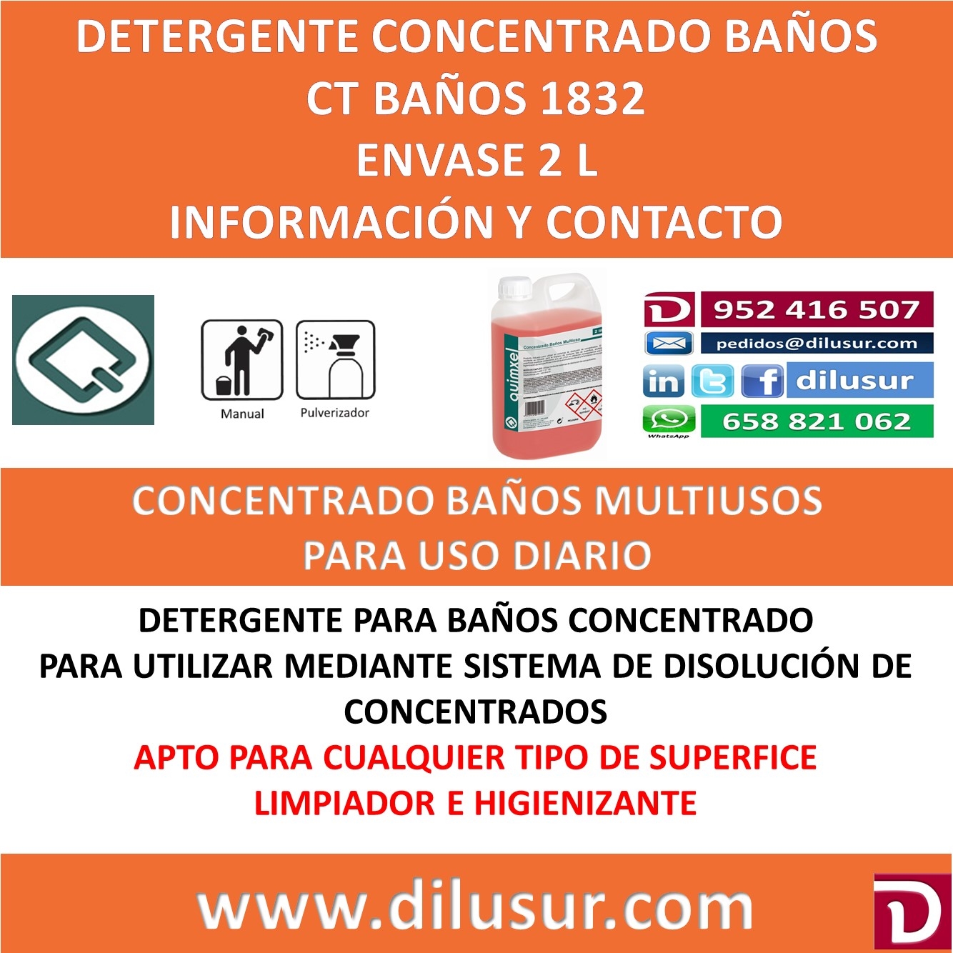 Concentrado baños multiuso para sistemas de disolución de concentrados. Apto para la limpieza de cualquier tipo de superficie, azulejos,baños, superficies sintéticas, ( melaminas, pvc, etc). higienizante. Envase 2 L. Iva incluido