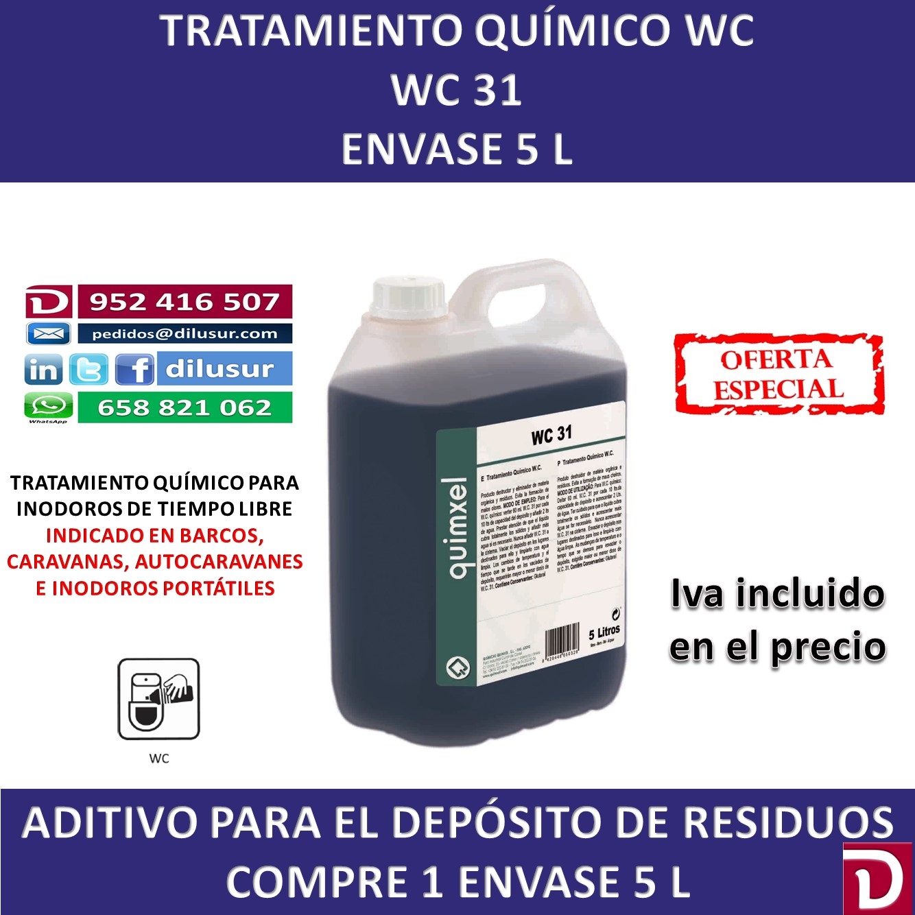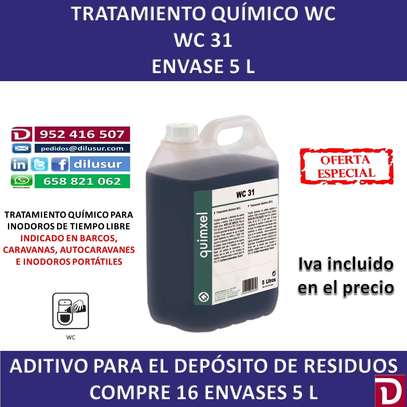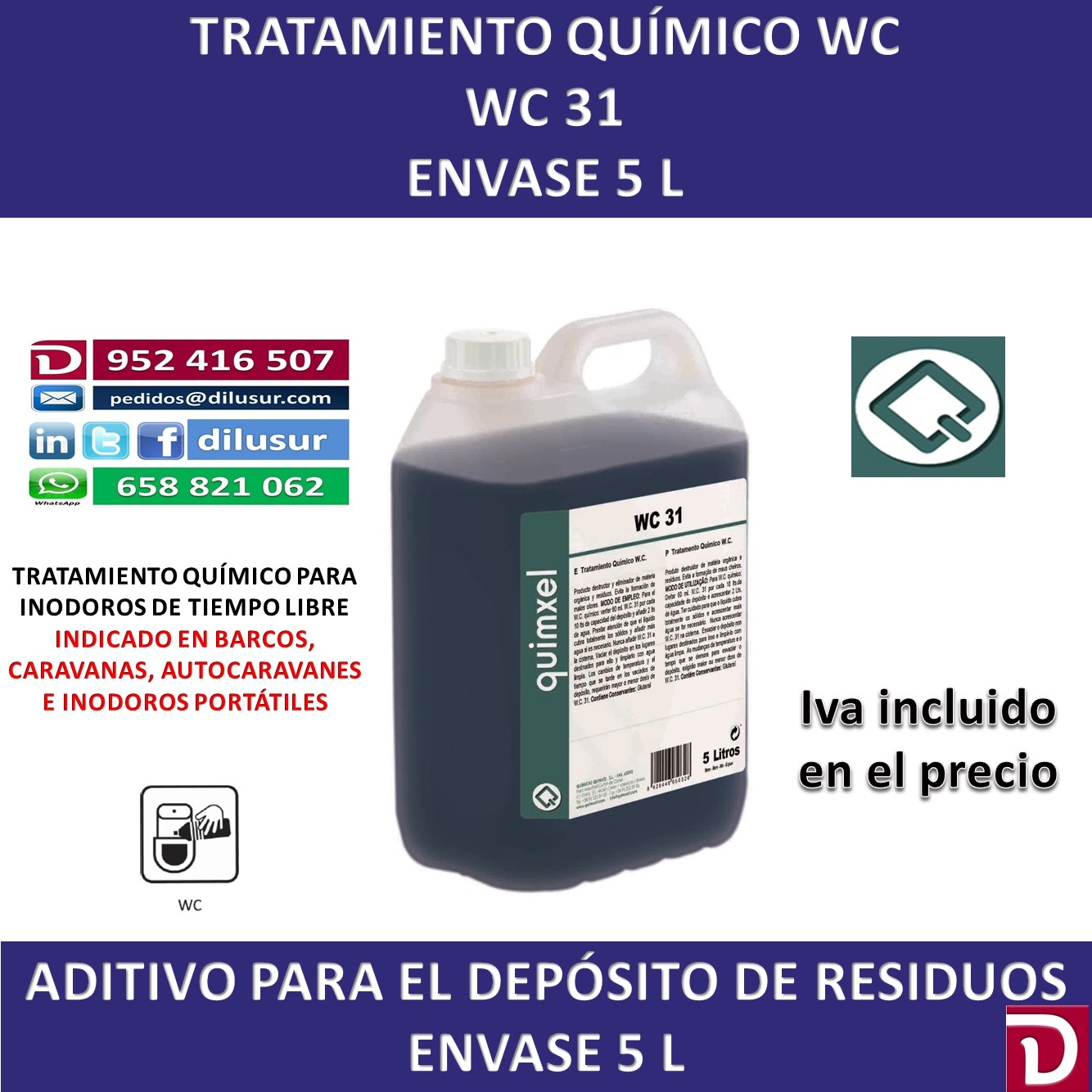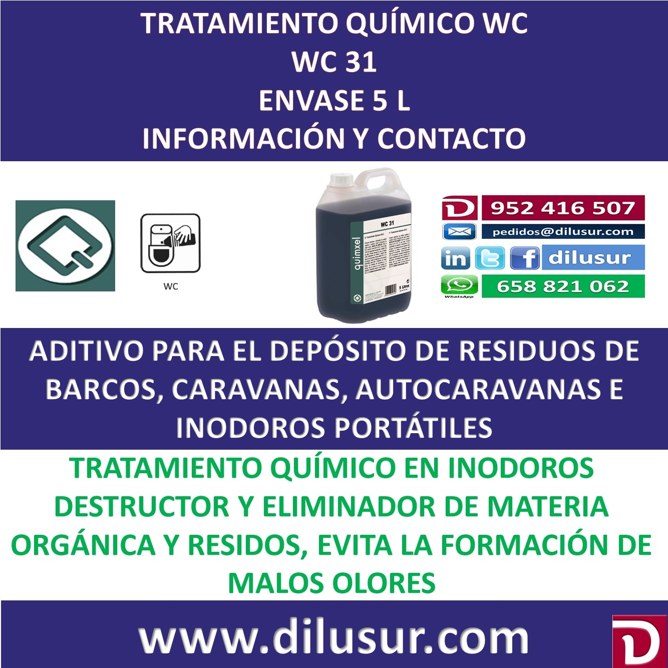 Tratamiento químico WC, destructor y eliminador de materia orgánica y residuos en inodoros químicos . Evita la formación de malos olores. Para embarcaciones, caravanas, autocaravanas, inodoros portátiles con depósitos. Envase 5 L. Iva incluido