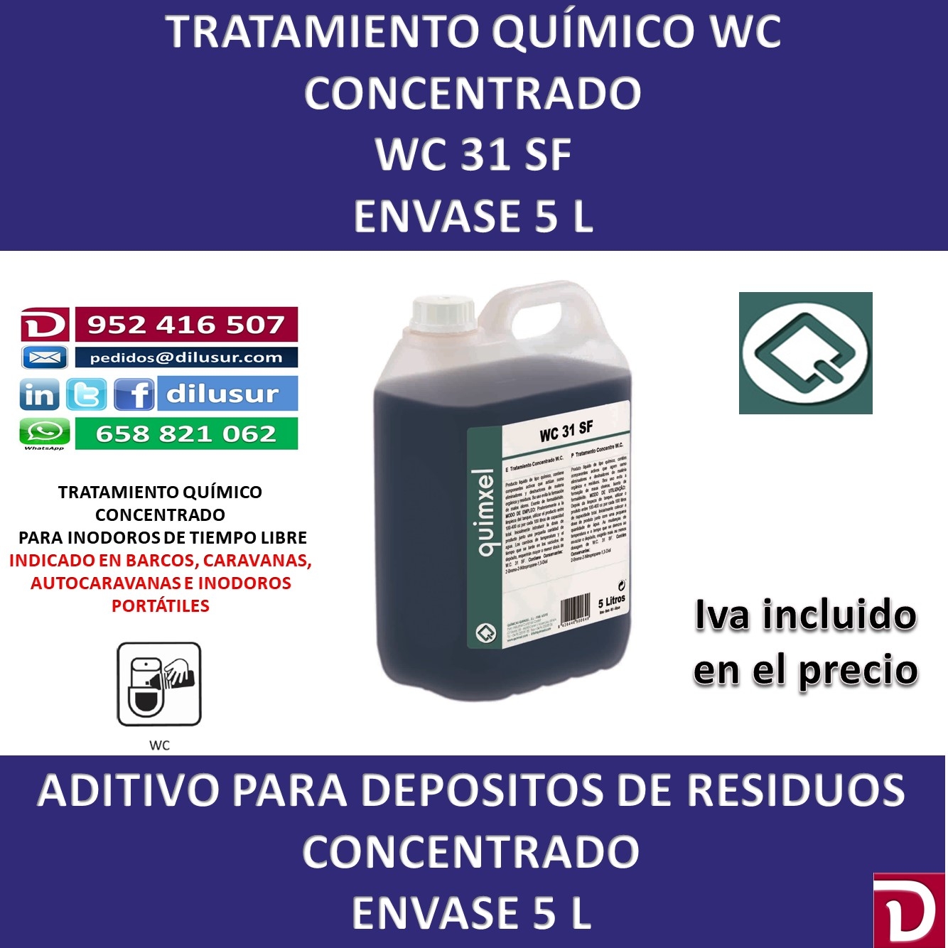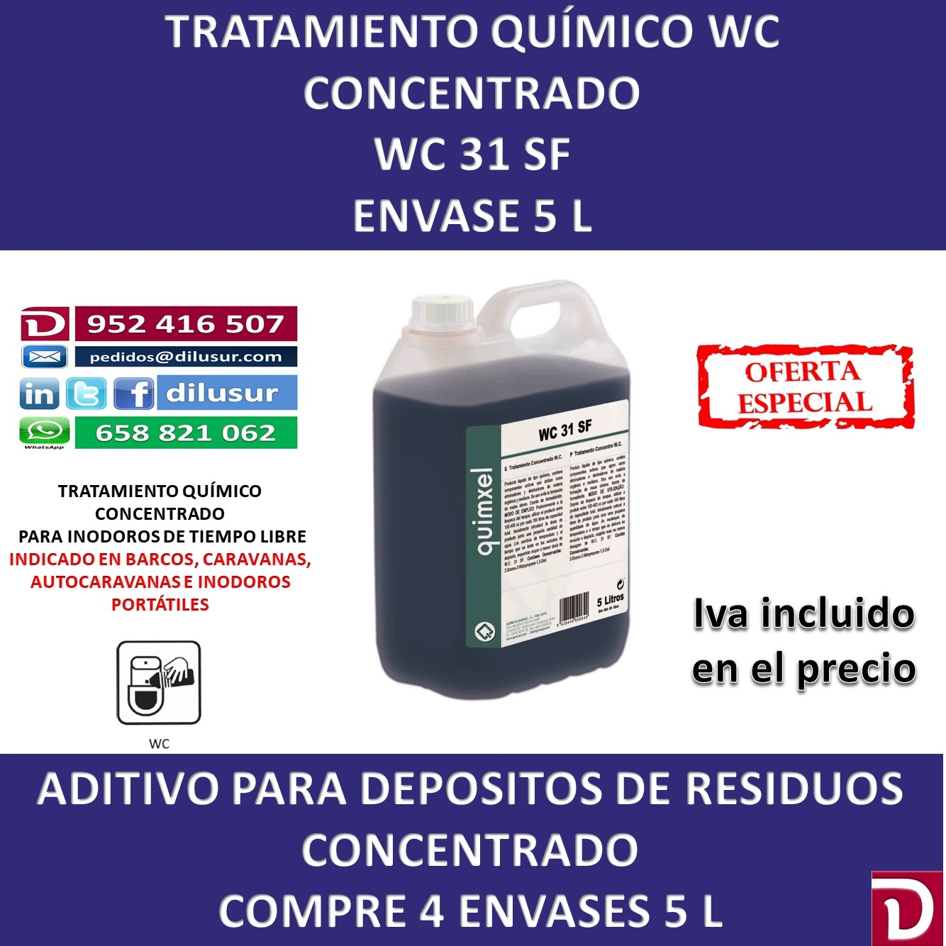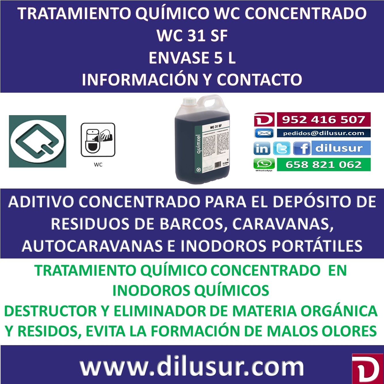 Tratamiento químico concentrado WC, elimina y destruye la materia orgánica y residos, evita los malos olores, Dosificación de uso 100 a 400 cc por cada 100 litros de agua, Adecuado para barcos, caravanas, autocaravanas, etc. Envase 5 L. Iva incluido