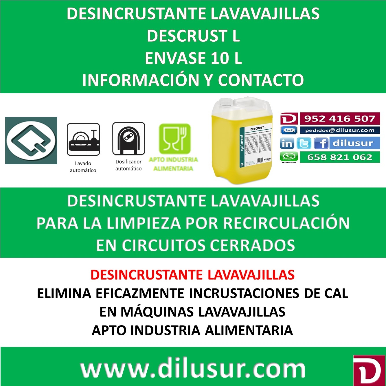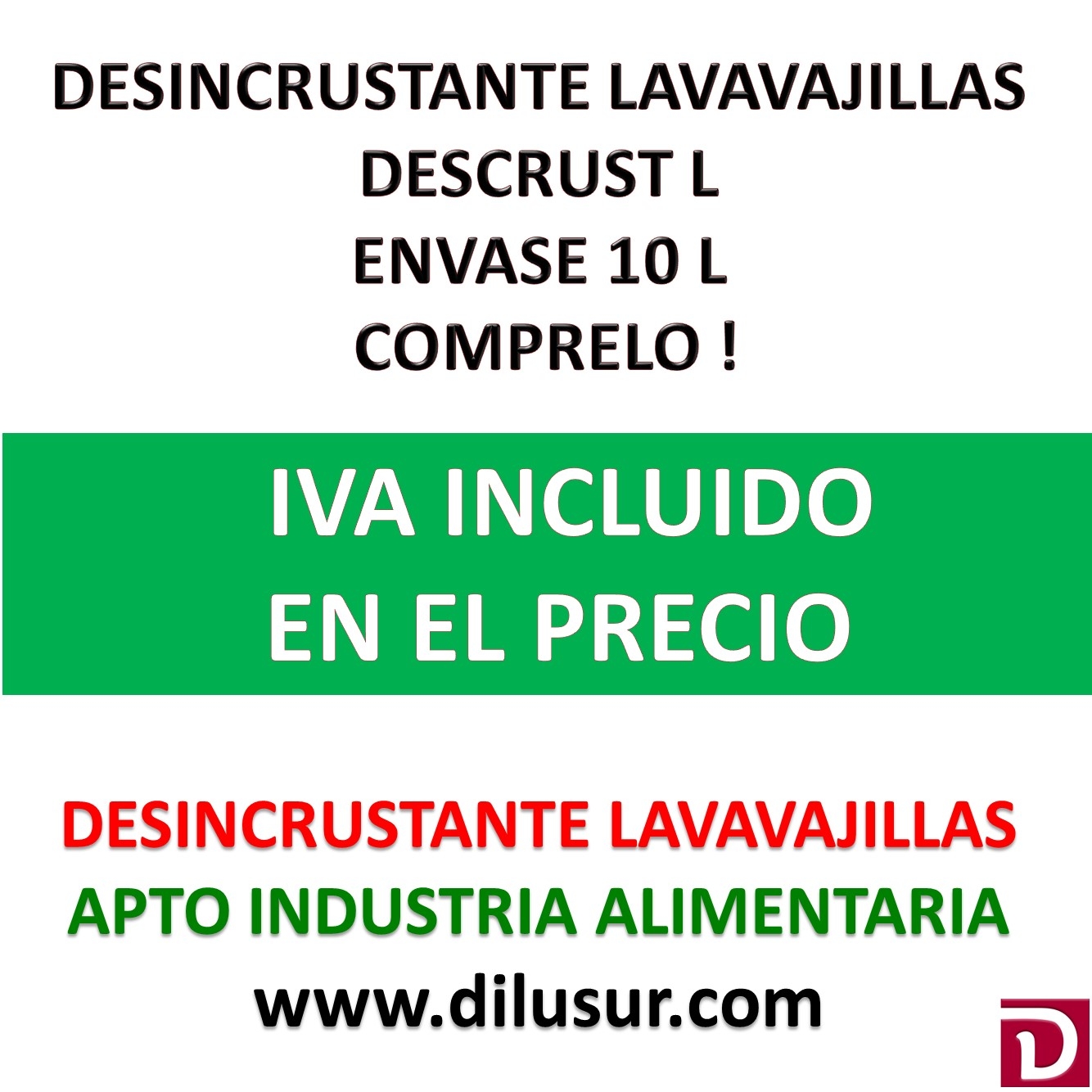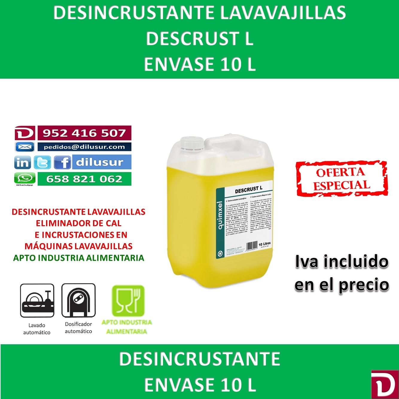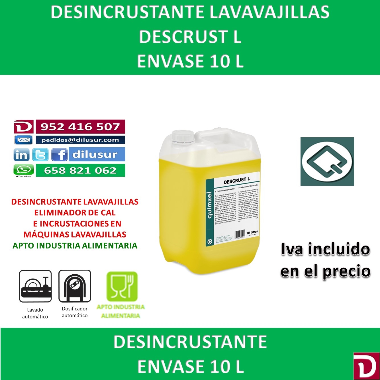 Desincrustante lavavajillas, actúa eficazmente como eliminador de incrustaciones de cal, posee inhibidores de corrosión que evita el ataque sobre los metales. Apto industria alimentaria. Envase 10 L. Iva incluido