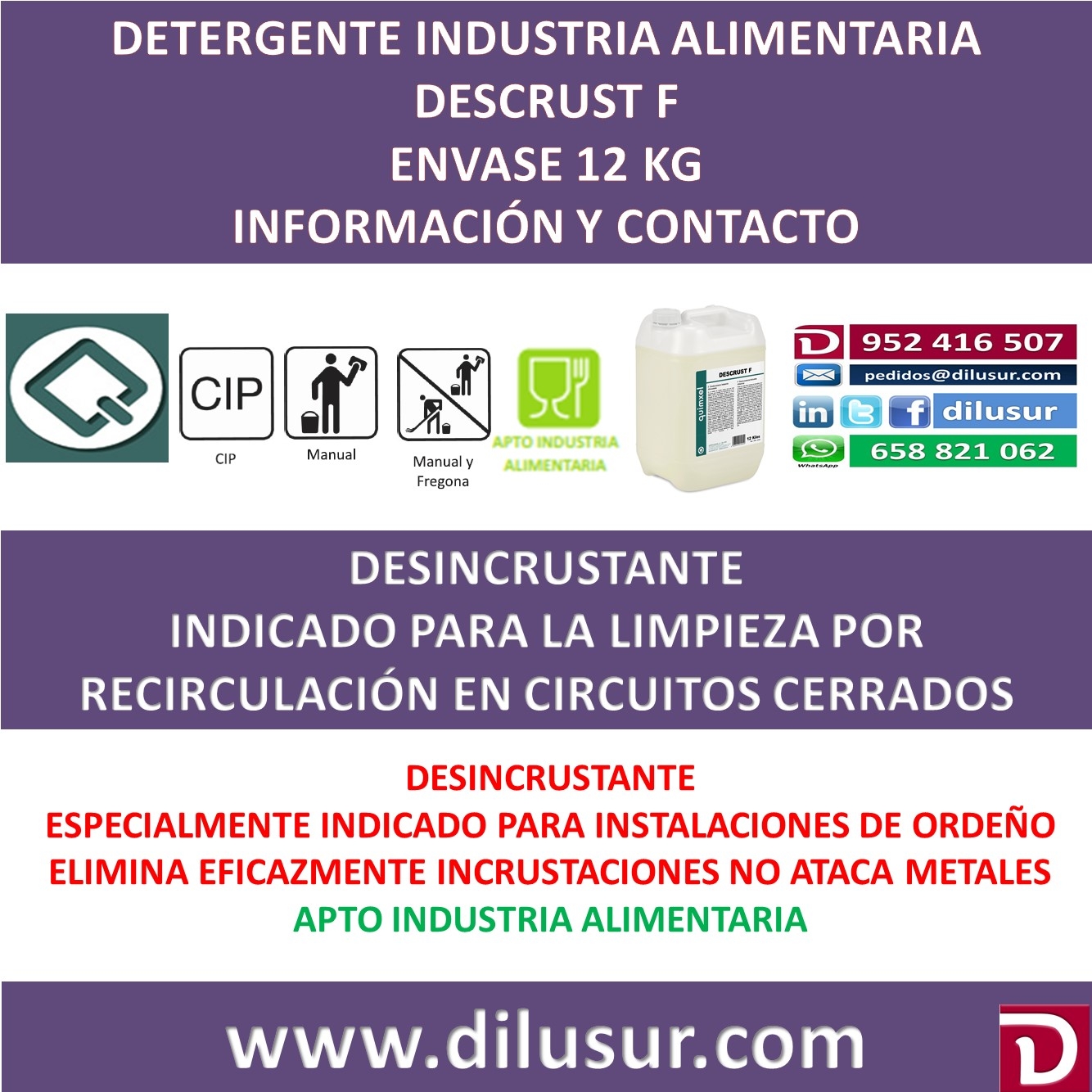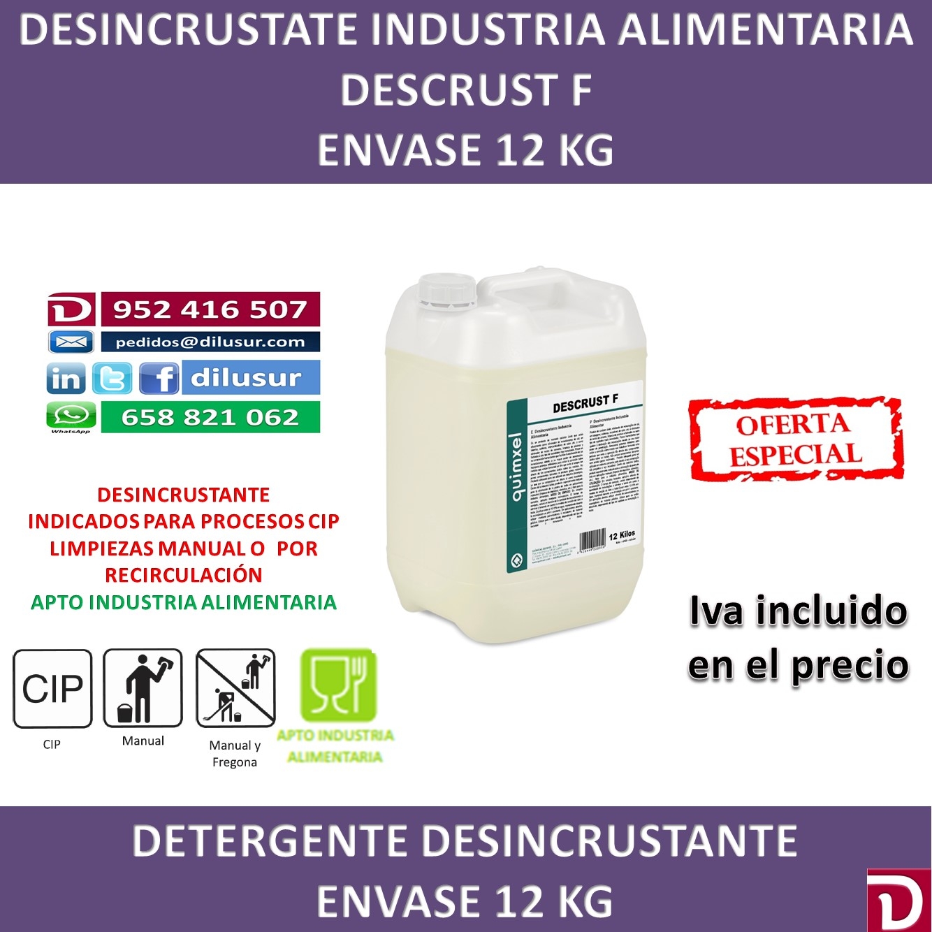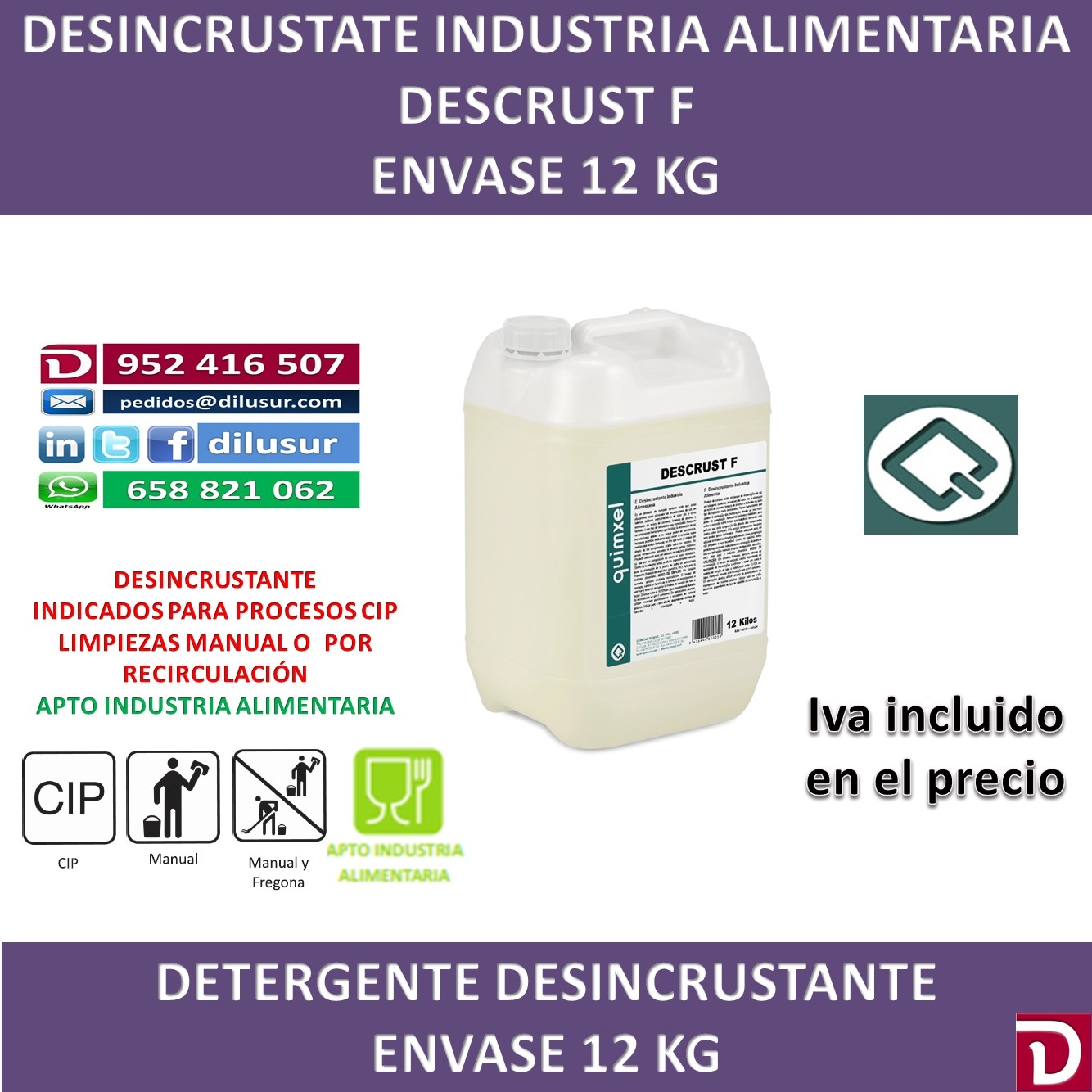 Desincrustante industria alimentaria, elimina cal en tuberías,calderas, fachadas y otro tipo de suecidad, eficaz ante la piedra de leche en aplicaciones manuales, depósitos, utensilios. no ataca al acero inoxidable, Envase 12 KG, Iva incluido