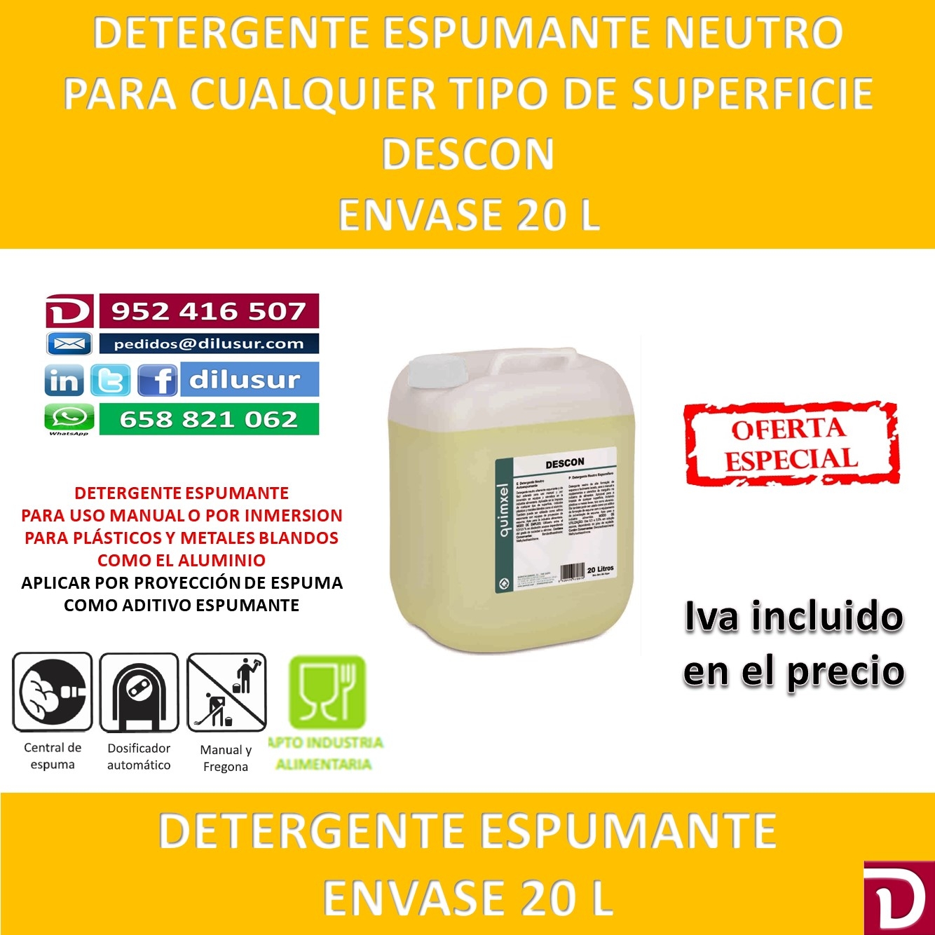 Producto altamente espumante y de fácil aclarado para uso manual o por inmersión en equipos y utensilios en la industria alimentaria. Aplicable en la limpieza de cualquier tipo de superficie, incluidos plásticos y metales blandos como el aluminio.