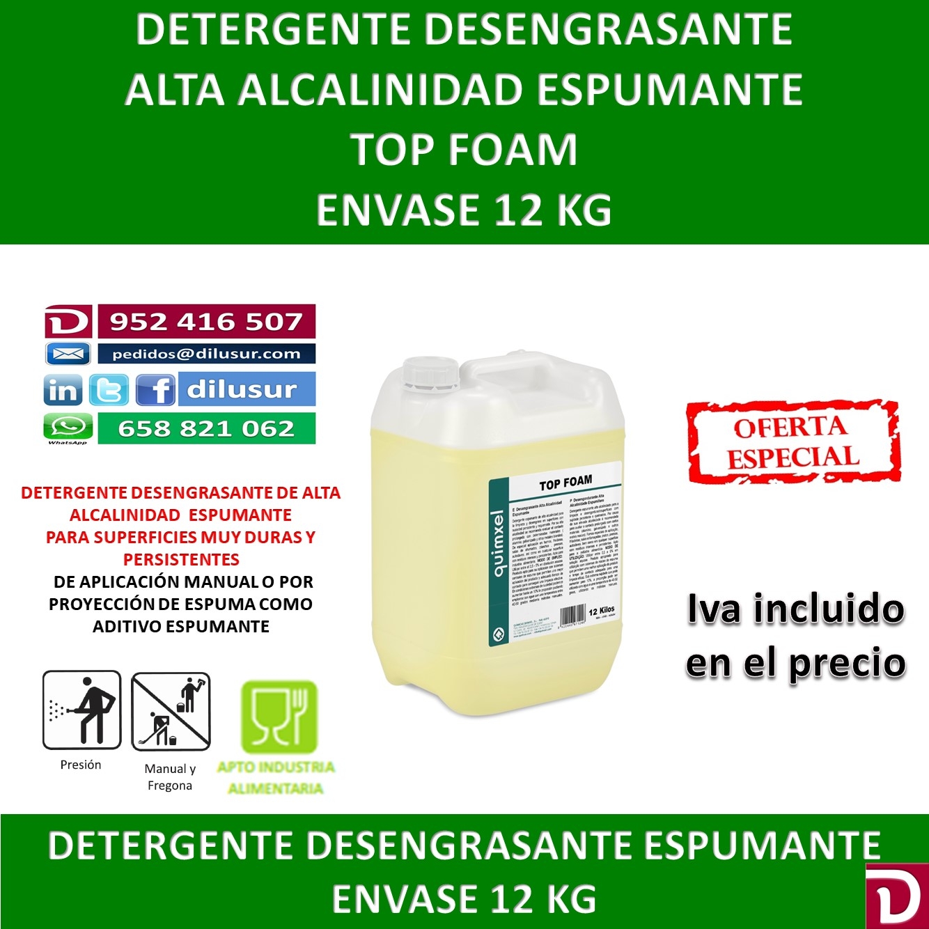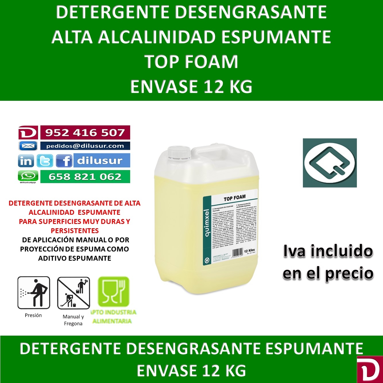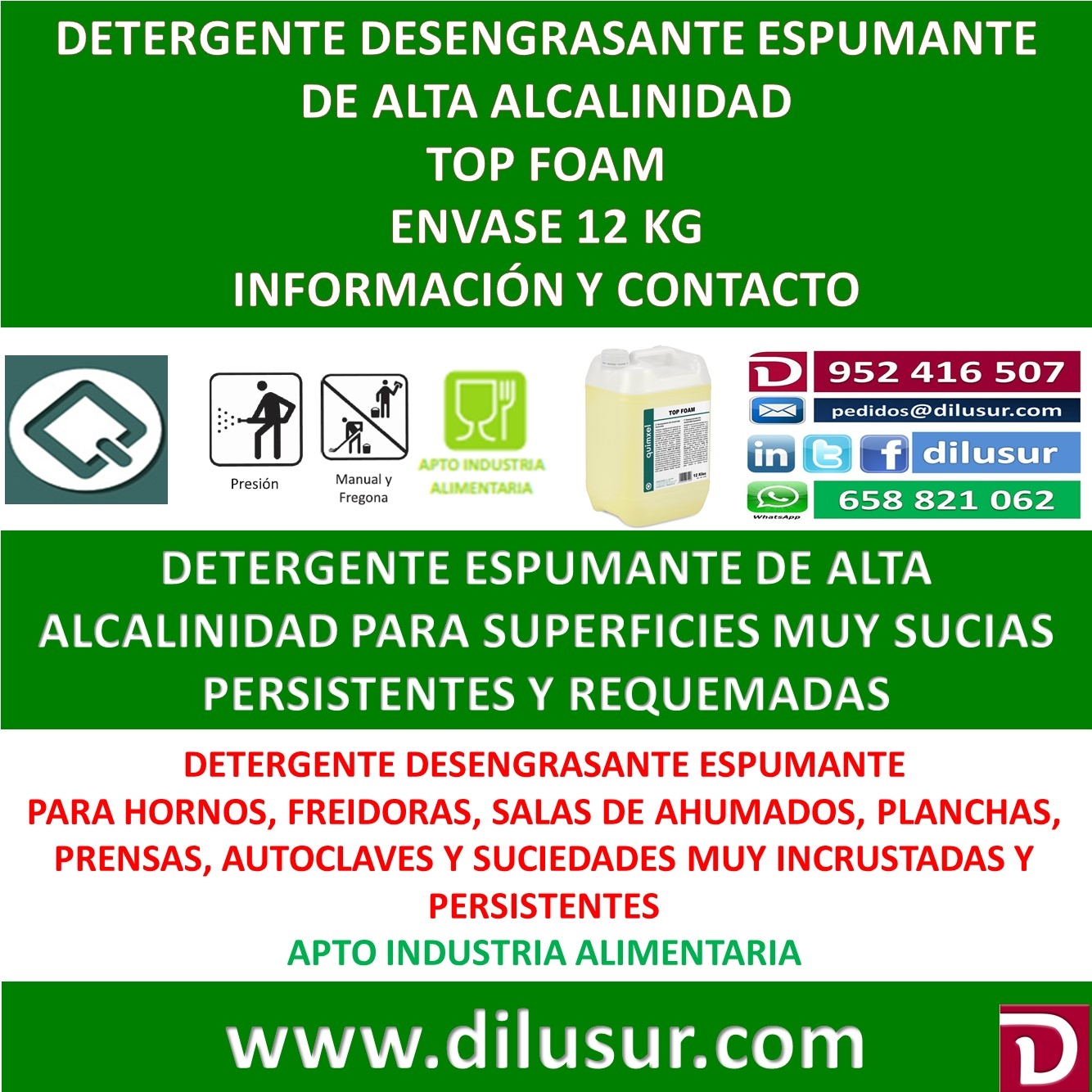 Desengrasante espumante de alta alcalinidad para superficies con suciedad persistente y requemada. De especial aplicación en hornos, freidoras, salas de ahumados. Apto industria alimentaria. Envase 12 KG. Iva incluido.