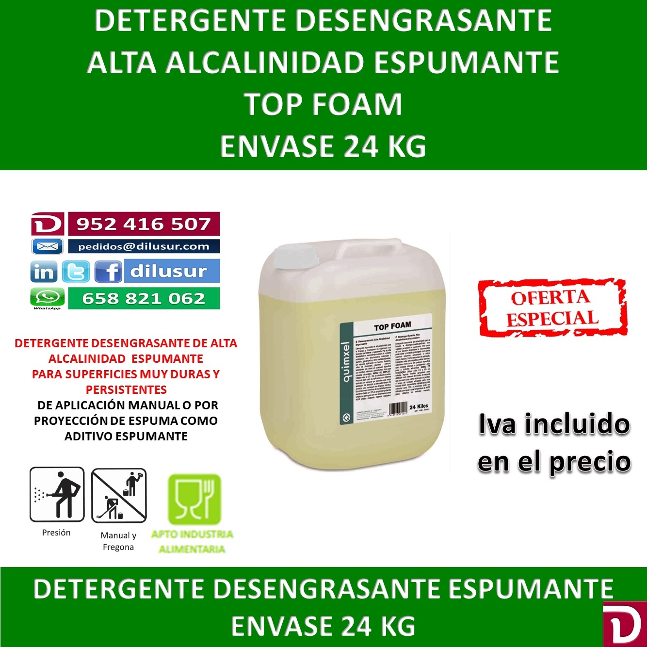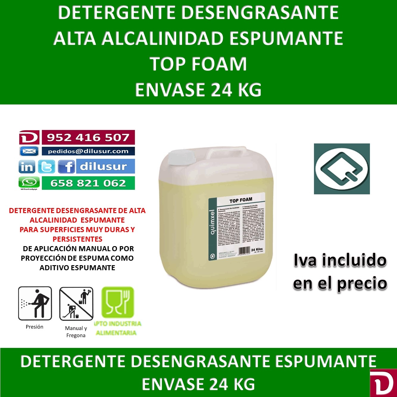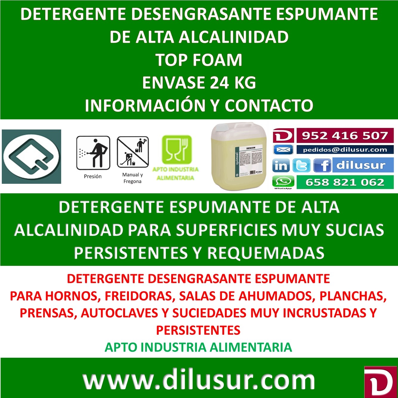 Desengrasante espumante de alta alcalinidad para superficies con suciedad persistente y requemada. De especial aplicación en hornos, freidoras, salas de ahumados. Apto industria alimentaria. Envase 24 KG. Iva incluido.