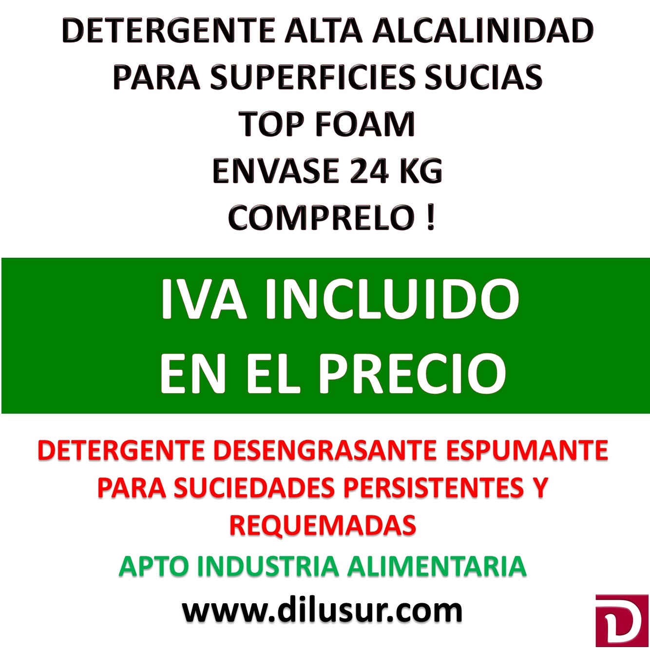 Detergente espumante de alta alcainidad para la limpieza y desengrase en superficis con suciedad persistente y requemada. Por su alta alcalinidad y concentración de producto se recomienda evaluar el contacto prolongado con determinados materiales, ( aluminio, galvanizado y otros metales blancos).