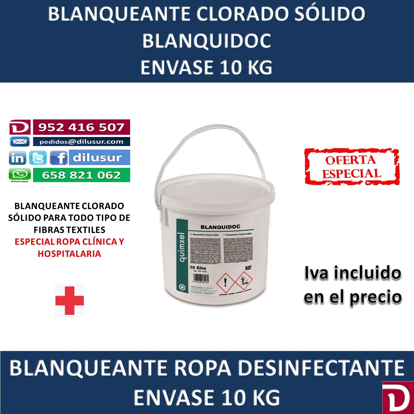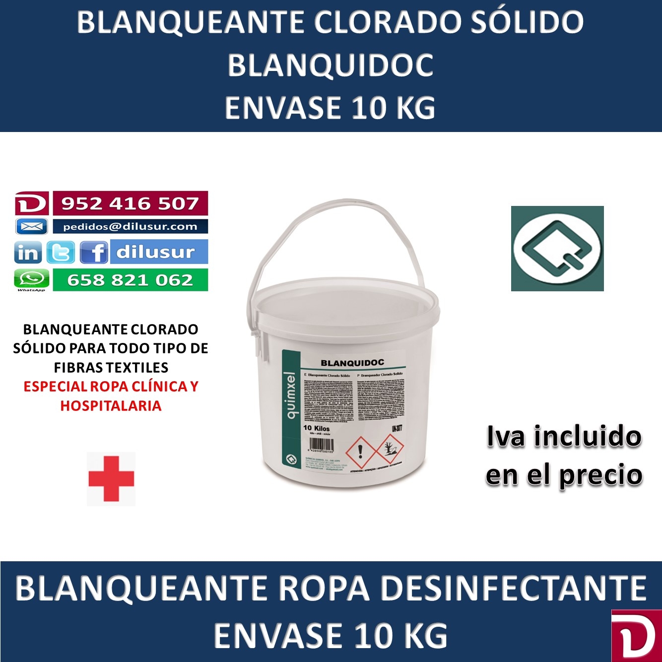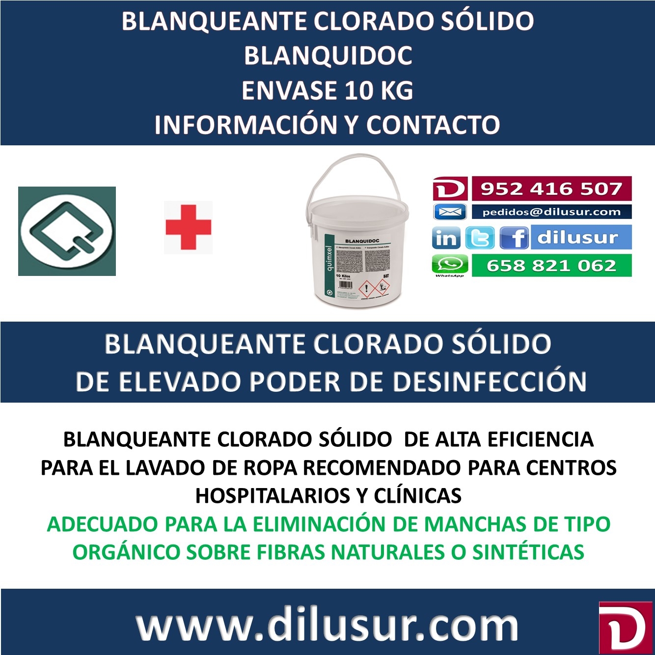 Blanqueante clorado sólido para todo tipo de fibras. Por su contenido en cloro activo es eficaz para eliminar manchas de tipo orgánico sobre fibras naturales o sintéticas. Para ropa clínica y hospitalaria. Envase 10 kg. Iva incluido