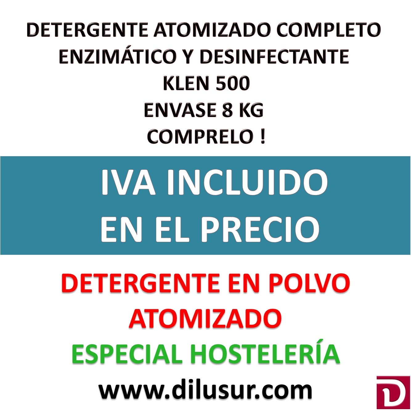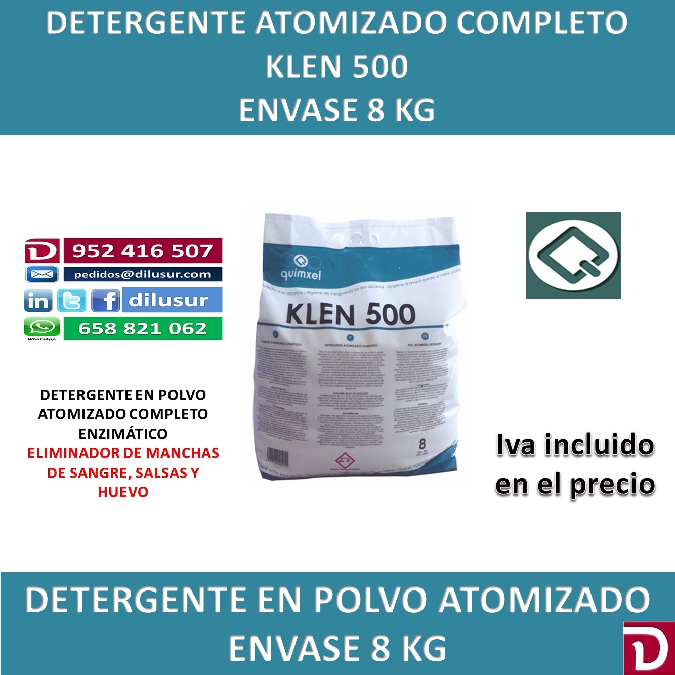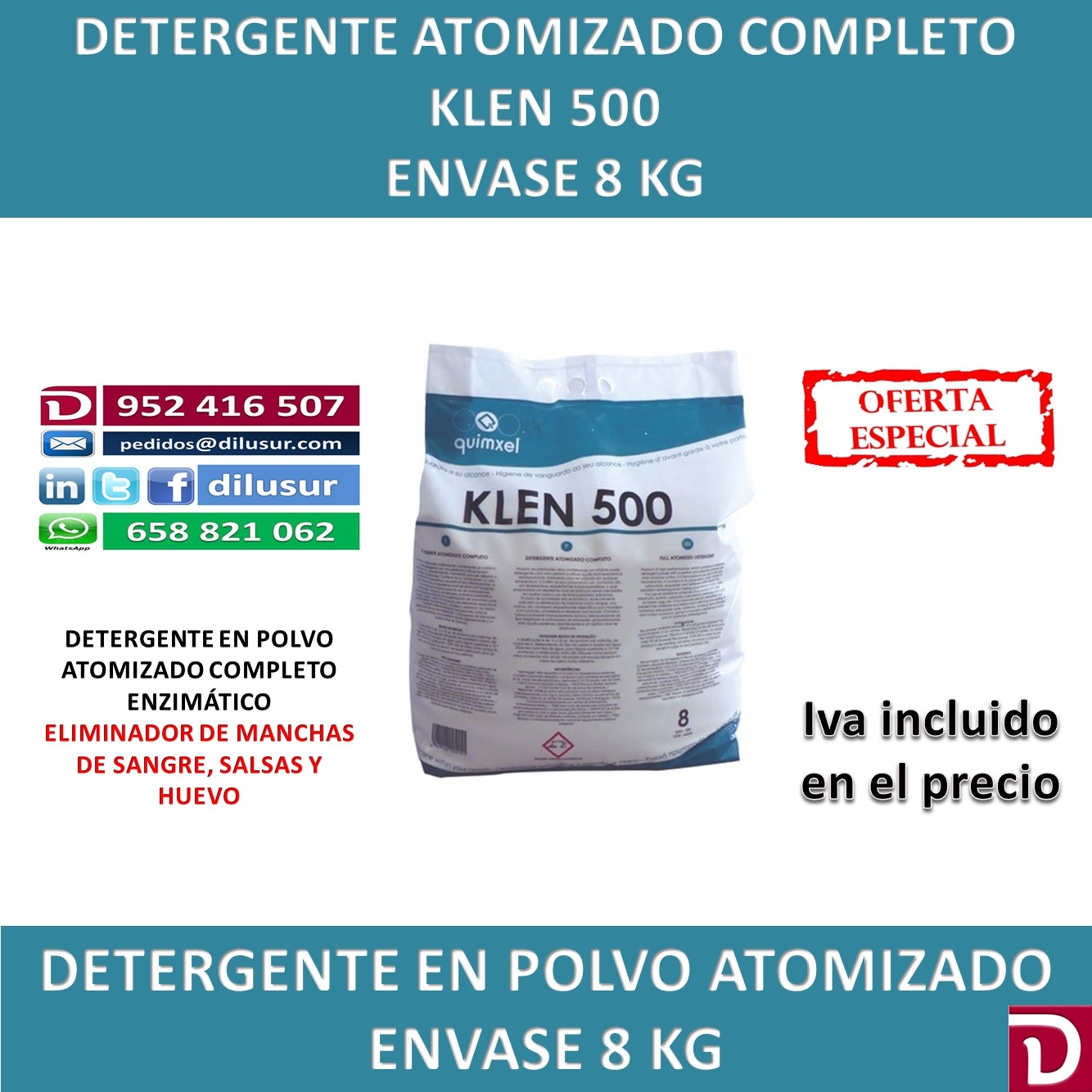 Detergente en polvo atomizado completo de altas prestaciones, eficaz blanqueante y desmanchante, enzimático, elimina eficazmente las manchas de huevo, sangre y salsas, evita el amarilleo y deterioro de los tejidos Envase 8 kg, Iva incluido