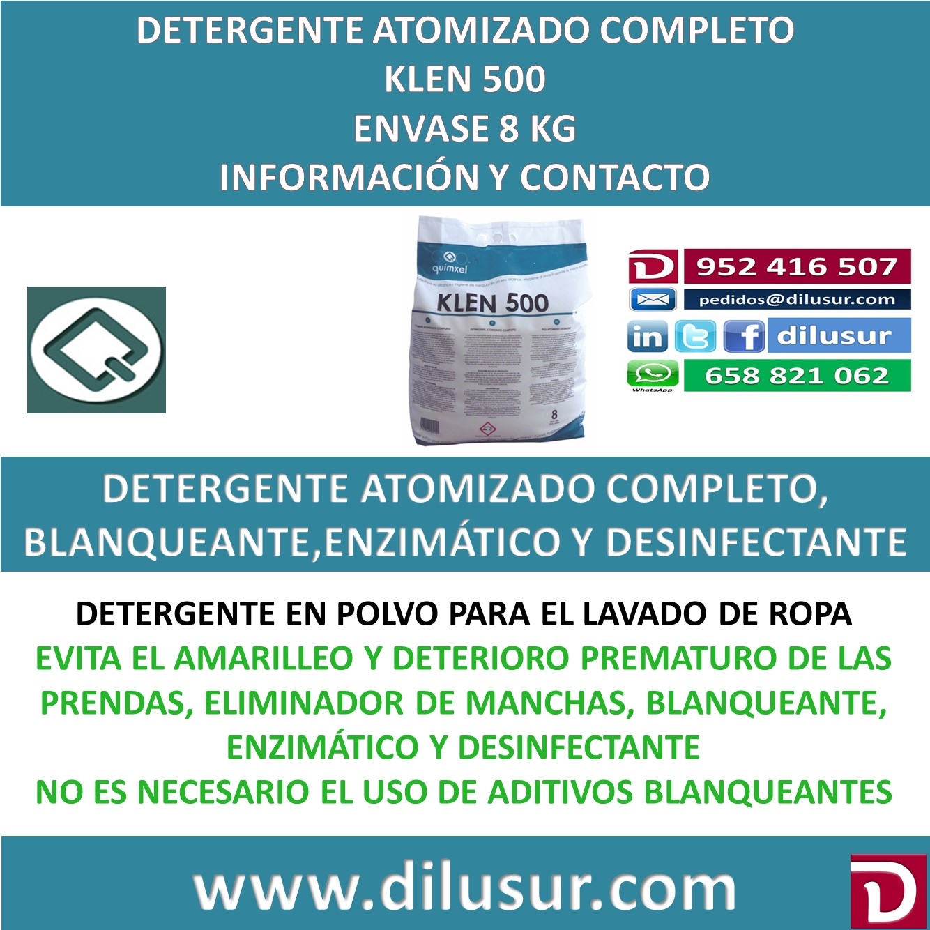 Producto de altas prestaciones, combinando un máximo poder detergente con una perfecta y eficaz acción blanqueante y desmanchante. Formulado para utilizarlo a cualquier temperatura, de alto contenido en tensioactivos, secuestrantes y blanqueantes. Proporciona un excelente nivel de blancura a la ropa, haciendo incluso innecesario el uso de blanqueantes adicionales.