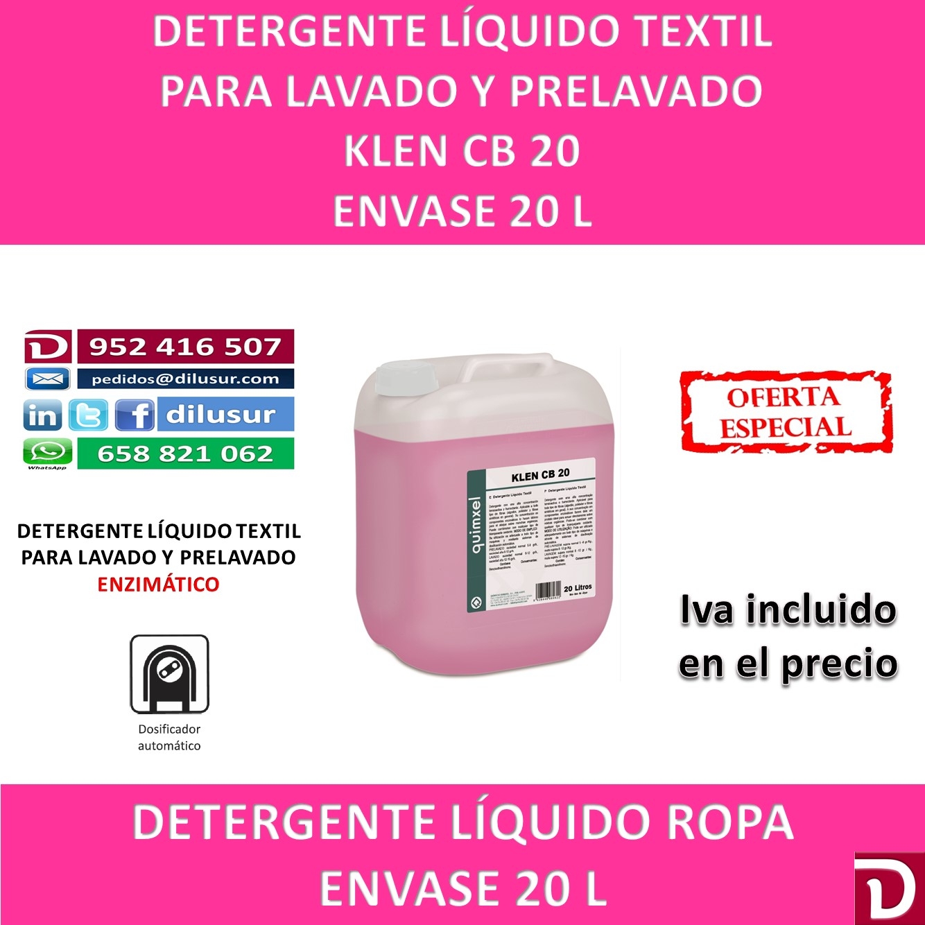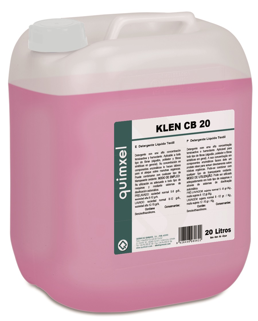 Detergente líquido textil de alta concentracion, para todo tipo de fibras, ( algodón, poliéster y fibras sintéticas en general). enzimático. Combina con cualquier tipo de blanqueante oxidante. Para todo tipo de máquinas. Envase 20 L. Iva incluido