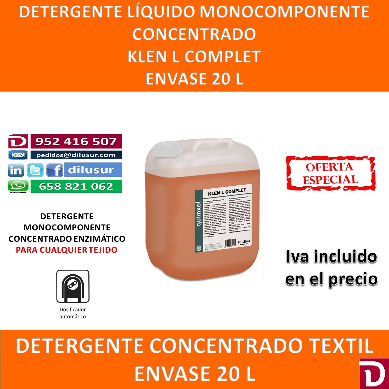 Detergente monocomponente concentrado de alta concentracion tensioactiva y humectante, enzimático, elimina cualquier resto orgánico, Puede combinarse con cualquier tipo de blanqueante. Para todo tipo de tejidos. Envase 20 L. Iva incluido