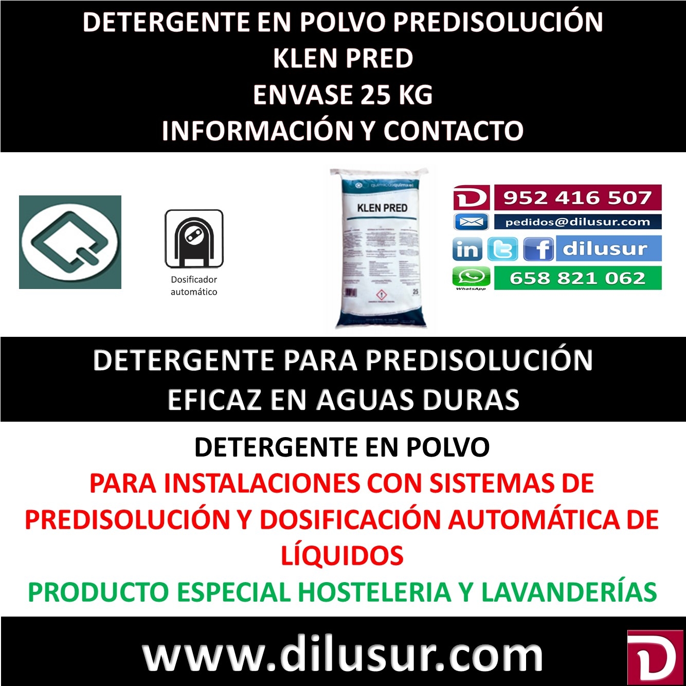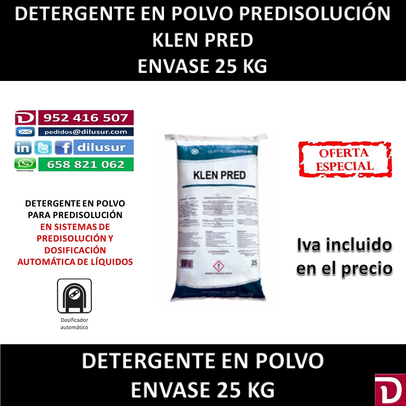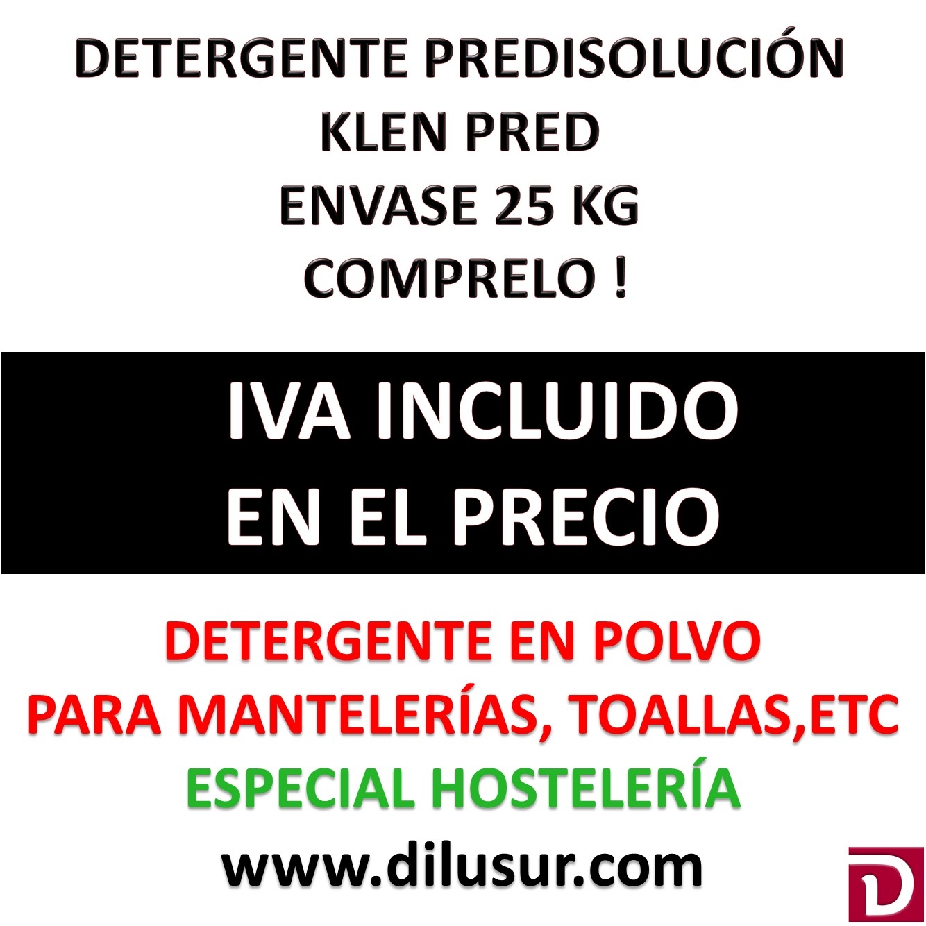 Detergente en polvo para predisolución, para todo tipo de roma, especialmete (mantelería, toallas), de elevado poder detergente, elimina todo tipo de manchas, compatible con cualquier tipo de blanqueante, para aguas duras. Envase 25 kg. Iva incluido