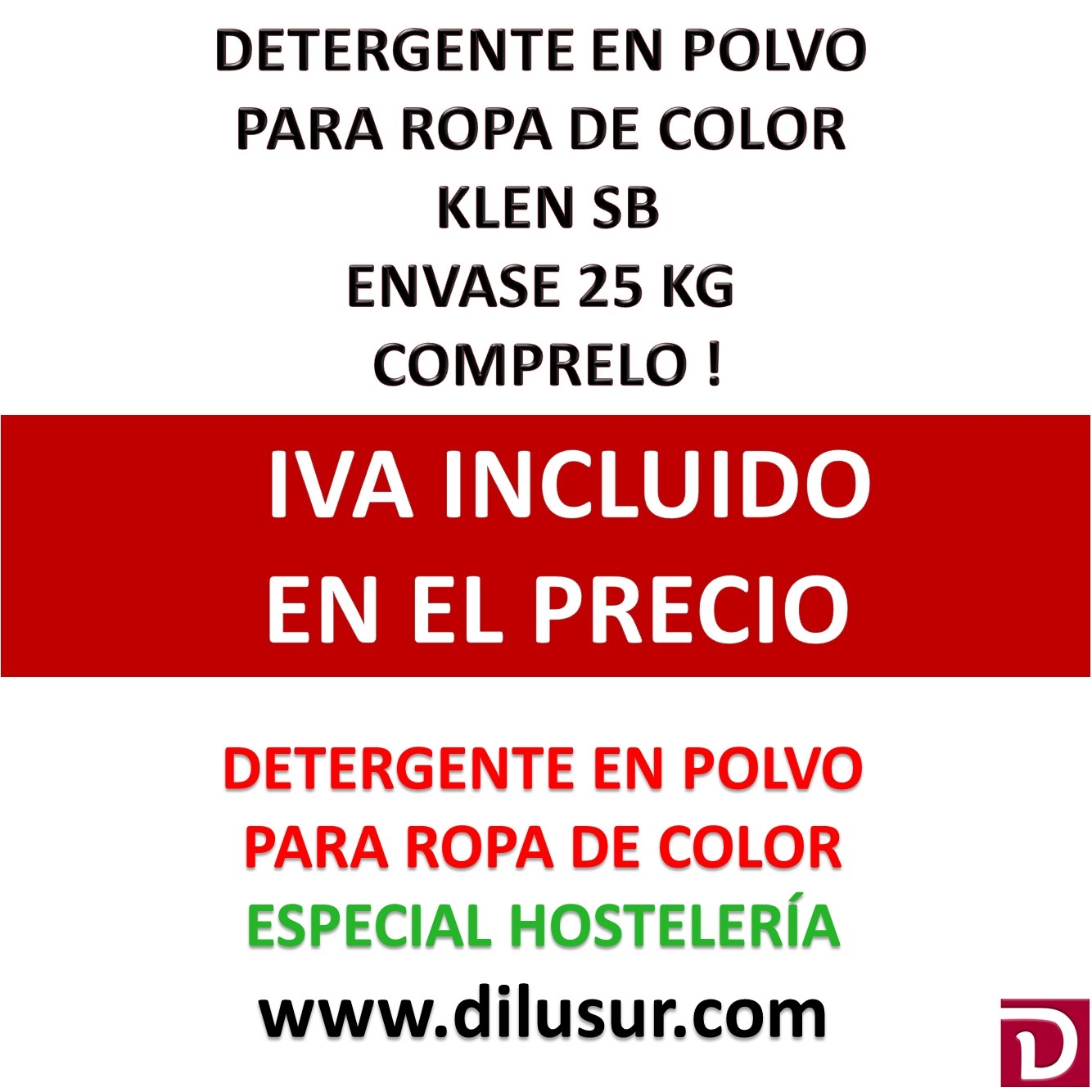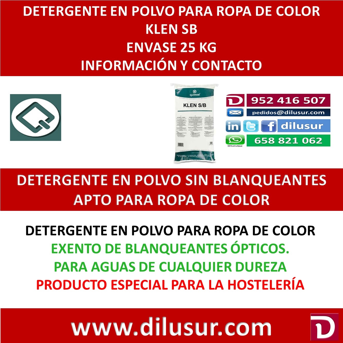 Detergente en polvo indicado especialmente para el lavado de tejidos de color , exento de blanqueantes optico, apto para todo tipo de tejidos y fibras. Envase 25 kg. Iva incluido