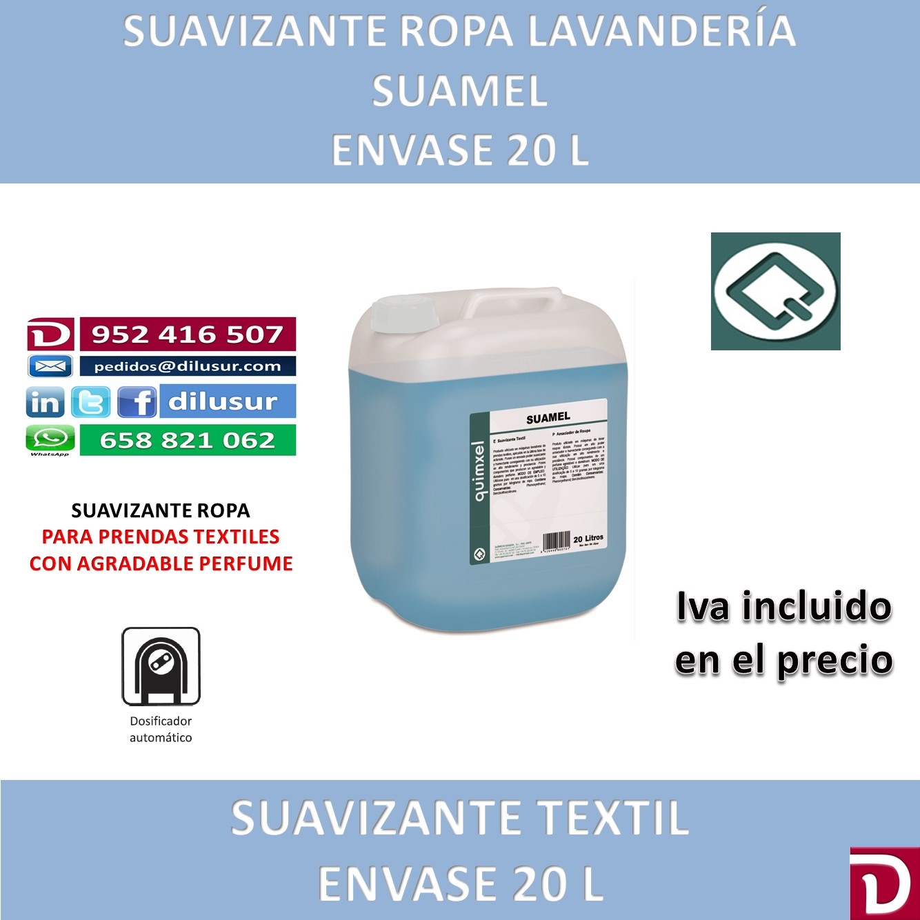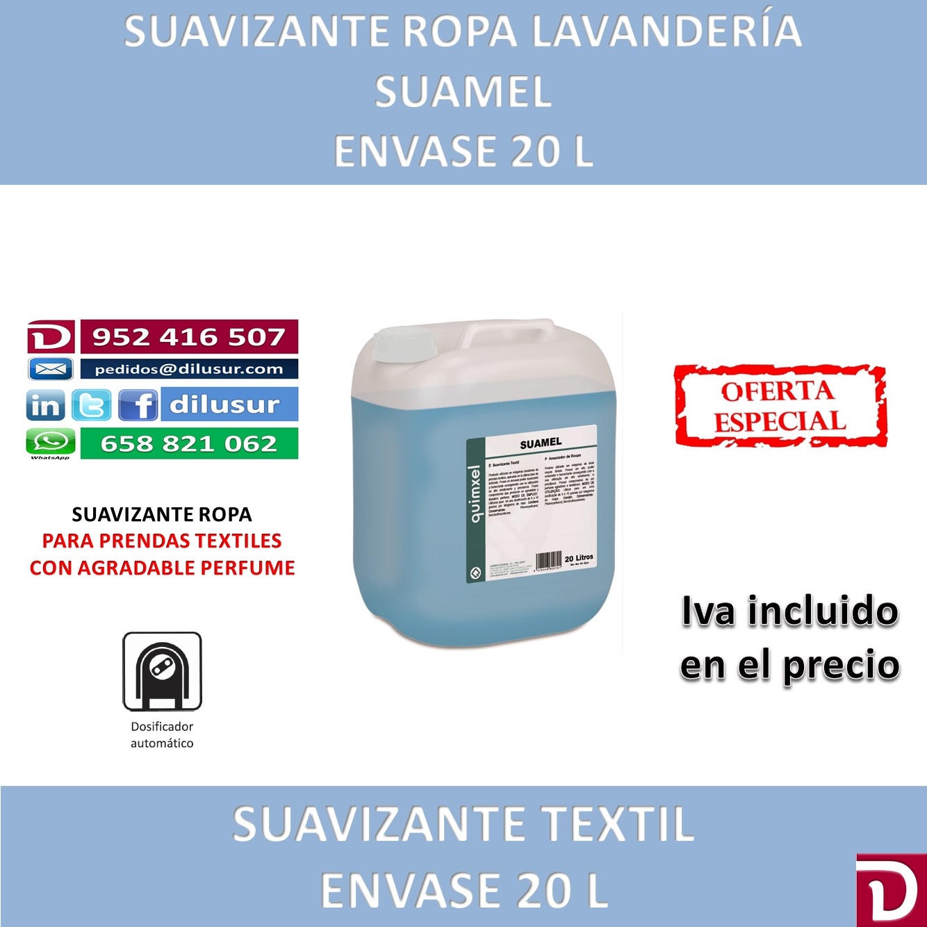 Suavizante de ropa utilizado en máquinas lavadoras de prendas textiles, aplicable en la última fase de aclarado, de elevado poder suavizante y humectante. Elimina la electricidad estática de la prenda, de agradable perfume. Envase 20 L. Iva incluido