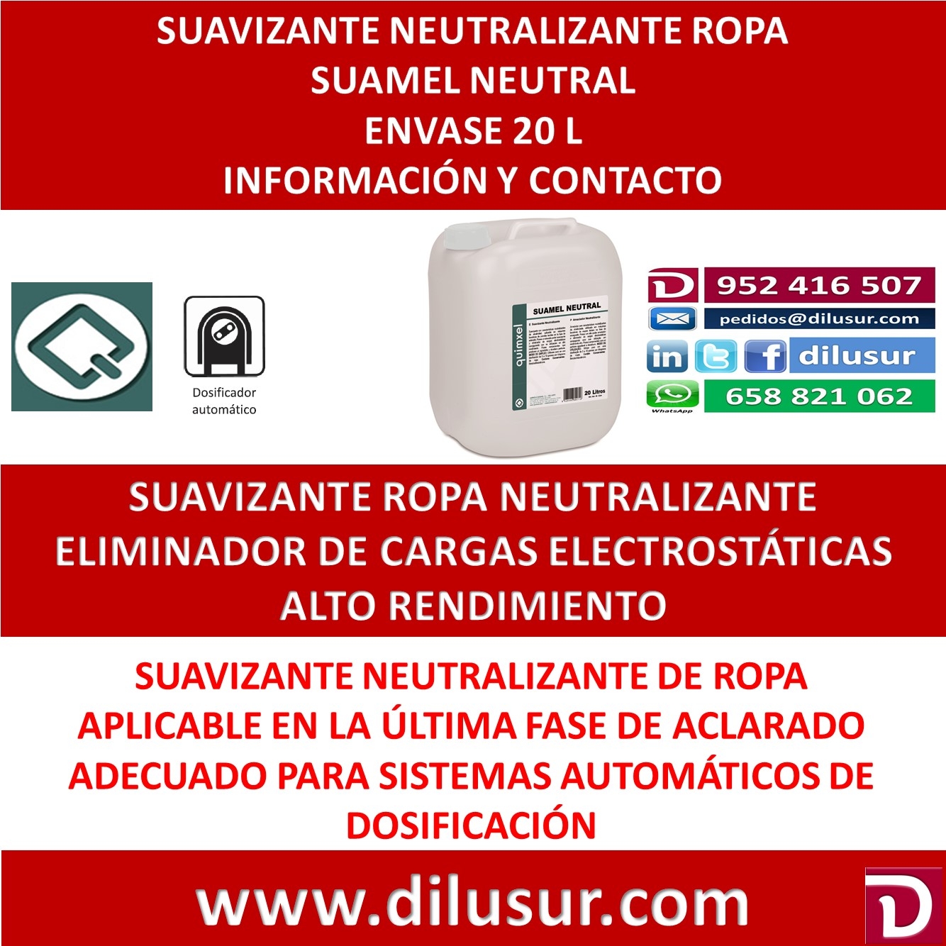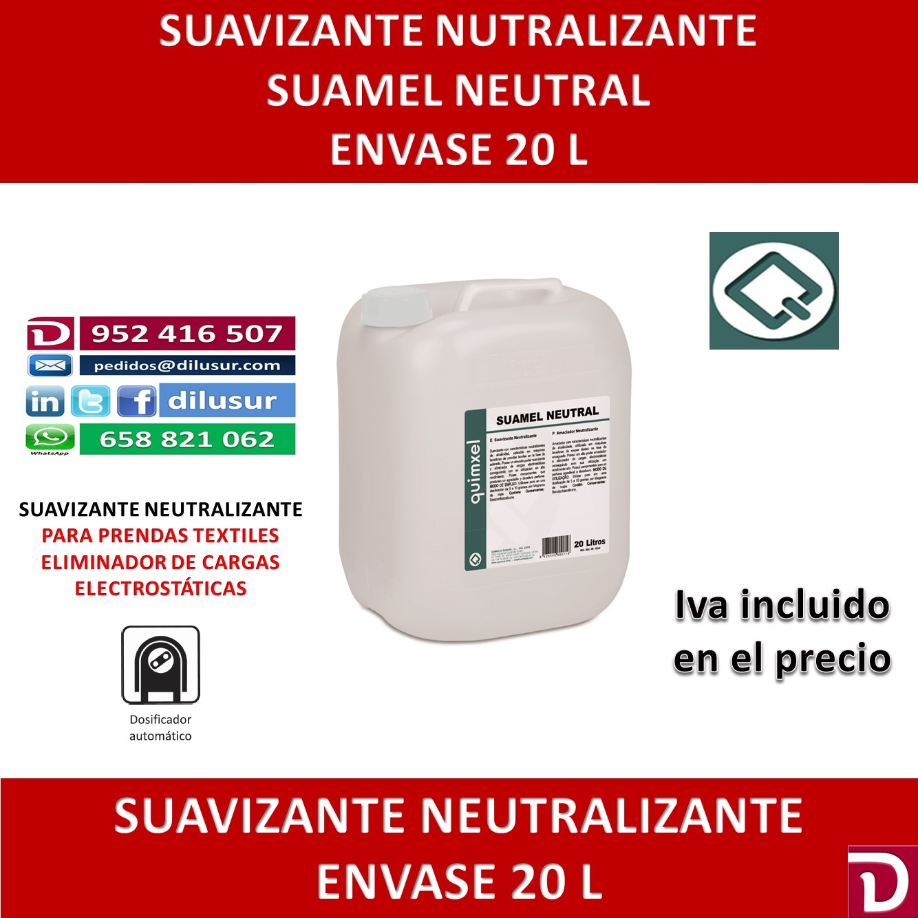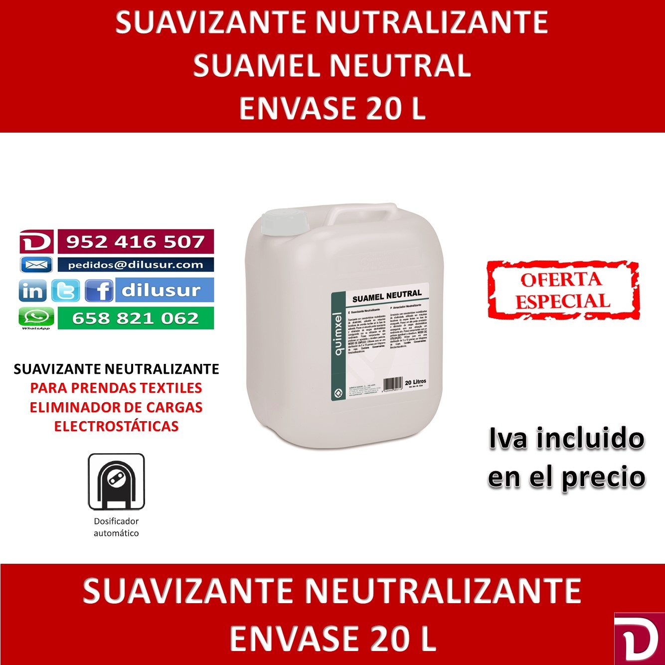 Suavizante neutralizante de alcalinidad, para máquinas lavadoras de prendas textiles. De elevado poder suavizante y eliminador de cargas electrostáticas, alto rendimiento. De agradable y duradero perfume. Envase 20 L. Iva incluido.