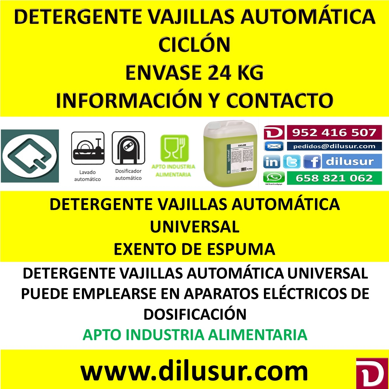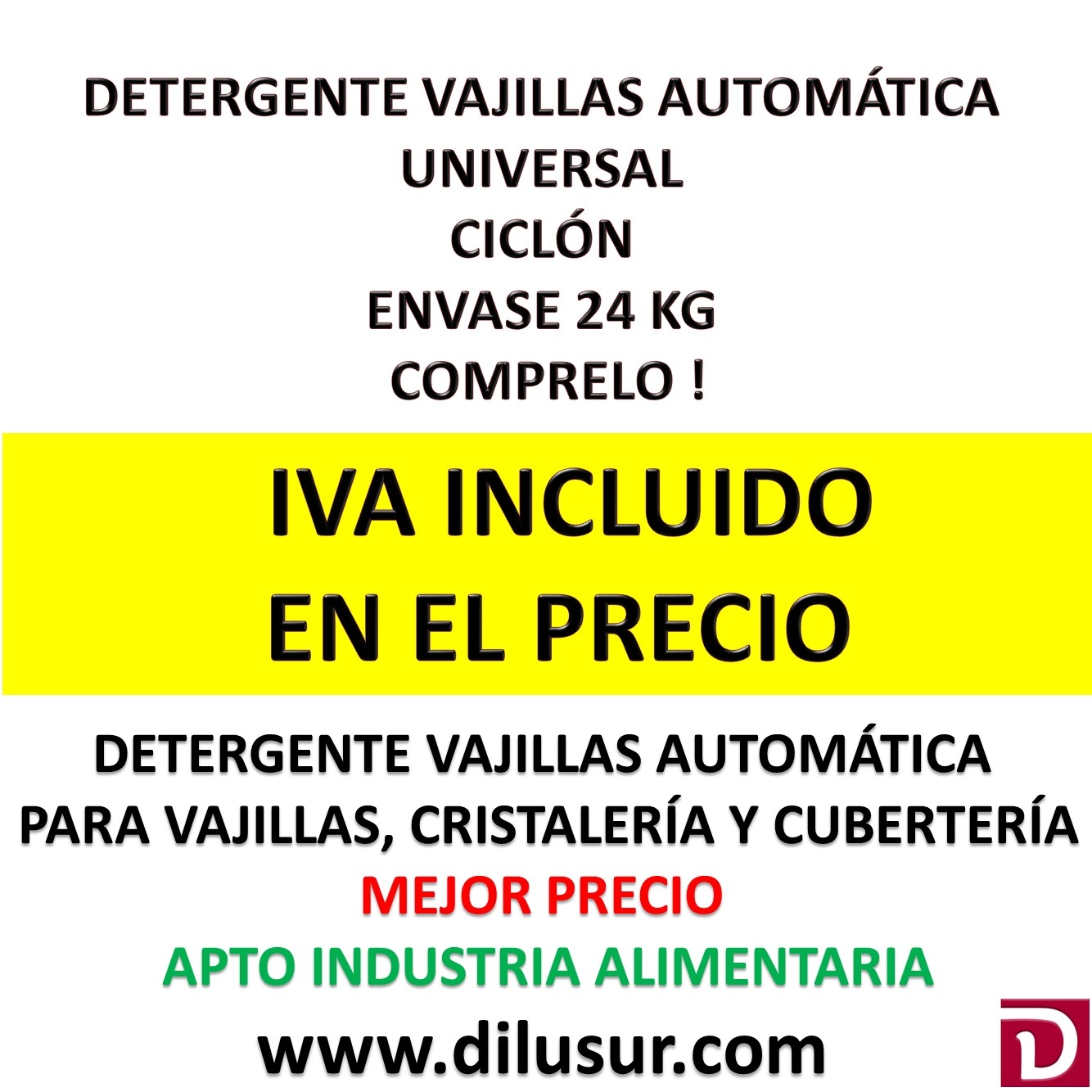 Detergente vajillas automáticas para el lavado de cristalerías, vajillas y cuberterías, Exento de espuma. Al mejor precio lider en ventas. Envase 24 kg. Iva incluido. Apto industria alimentaria.