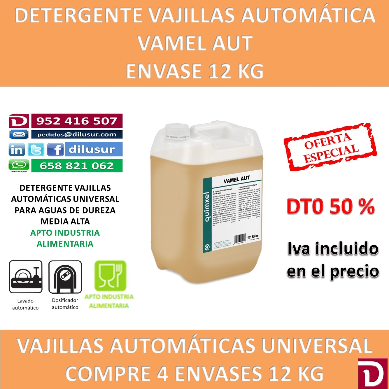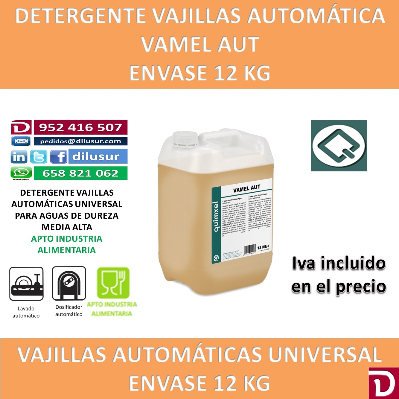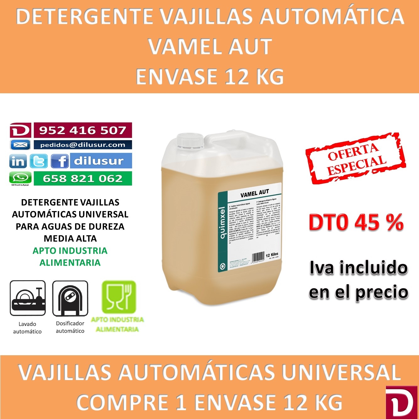 Detergente vajillas automáticas para aguas de dureza media alta, exento de espuma para eliminar la suciedad en cristalerías, vajillas y cuberterías. Envase 12 kg. Iva incluido. Apto industria alimentaria.