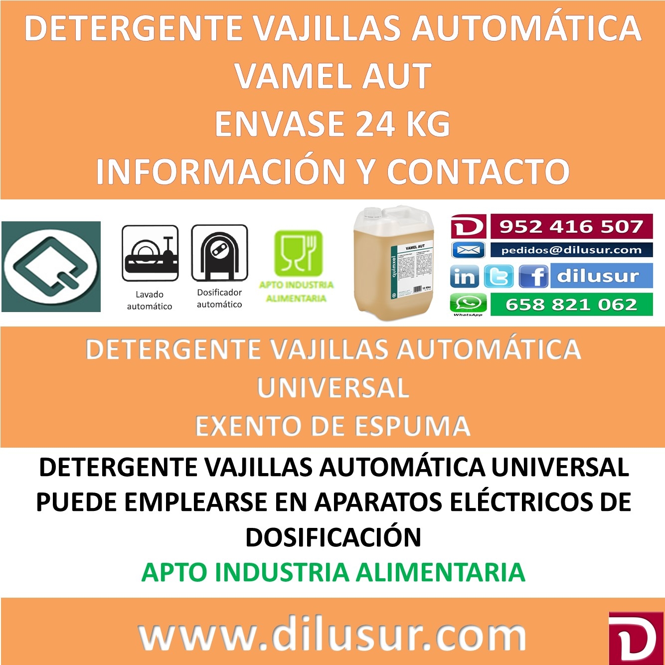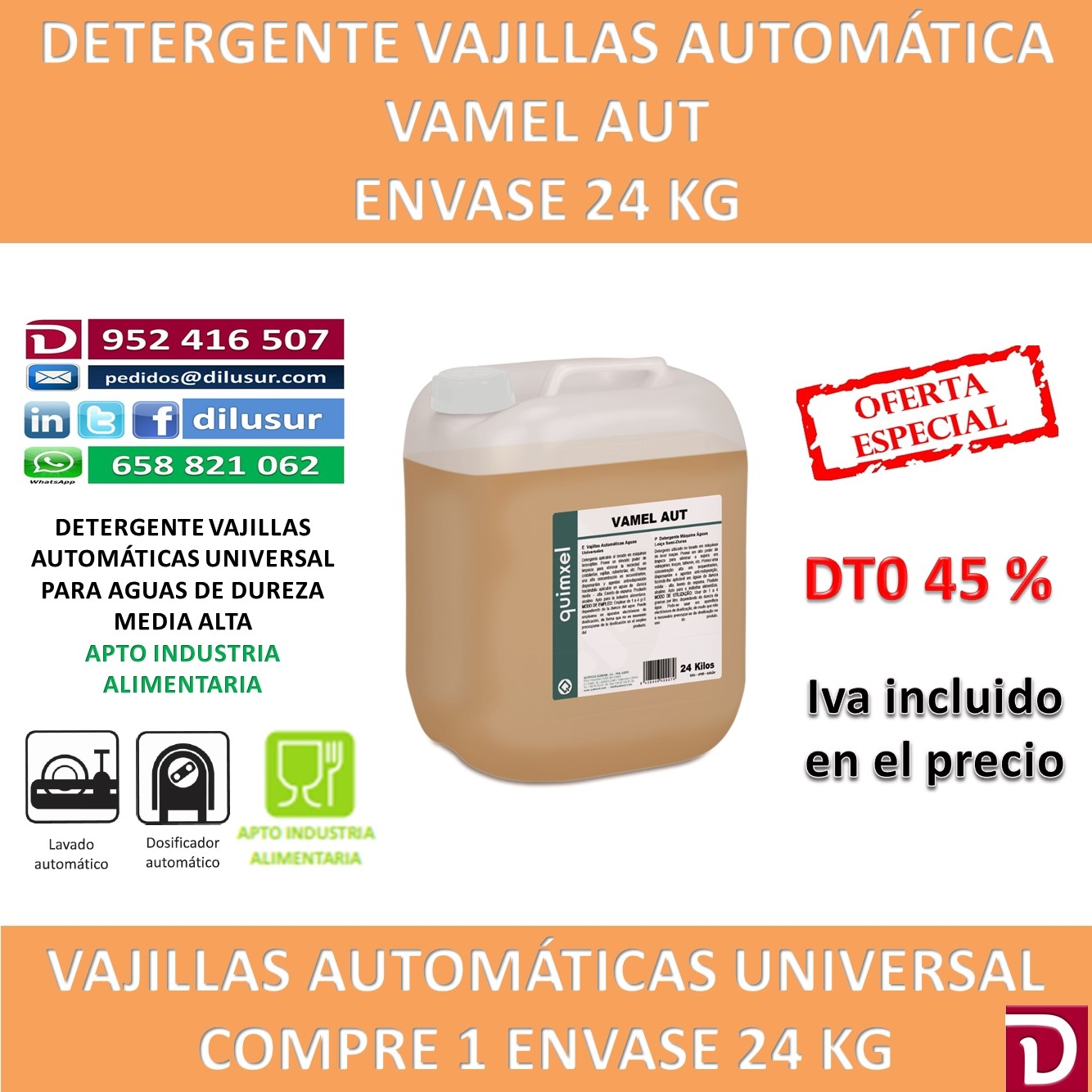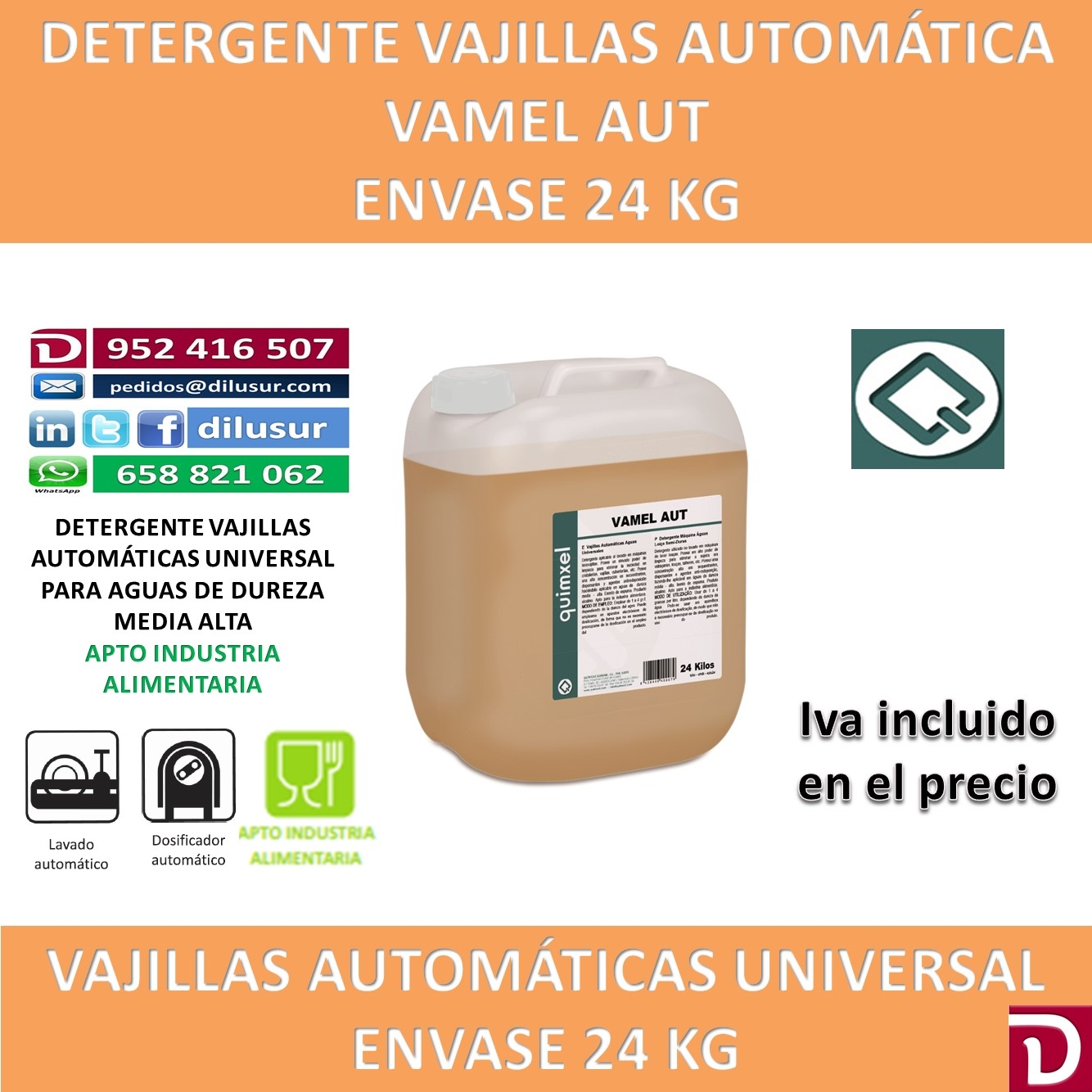 Detergente vajillas automáticas para aguas de dureza media alta, exento de espuma para eliminar la suciedad en cristalerías, vajillas y cuberterías. Envase 24 kg. Iva incluido. Apto industria alimentaria.