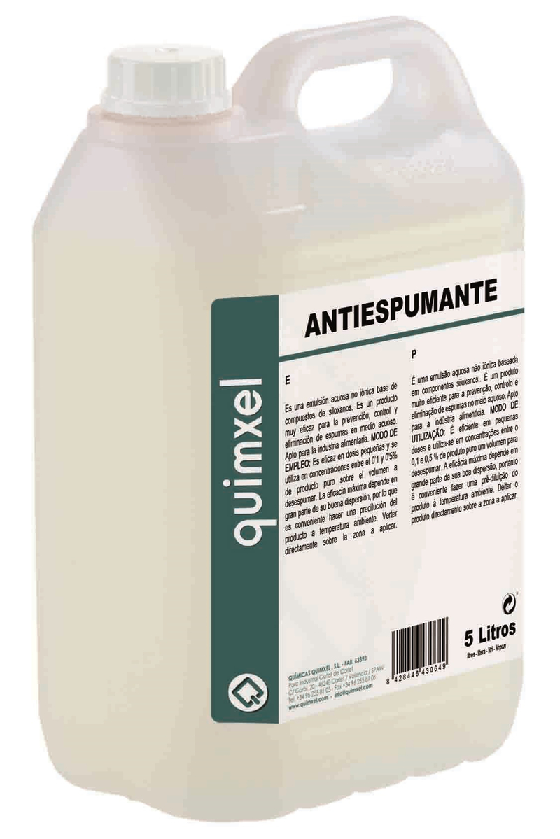Antiespumante, emulsión acuosa no iónica a base de compuestos de siloxanos. Eficaz para la prevención, eliminación de espumas en medio acuoso. Apto industria alimentaria. Envase 5 L, Iva incluido