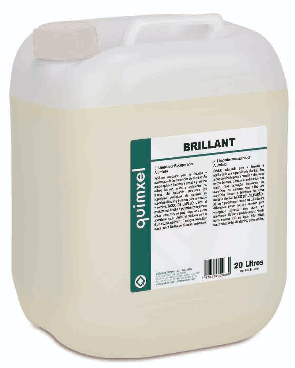 Limpiador recuperador de superficies de aluminio brillant, penetra y elimina oxidos blancos, grasas y sedimentos de humos. Transforma las superficies sucias en superficies limpias y brillantes. Envase 20 l l