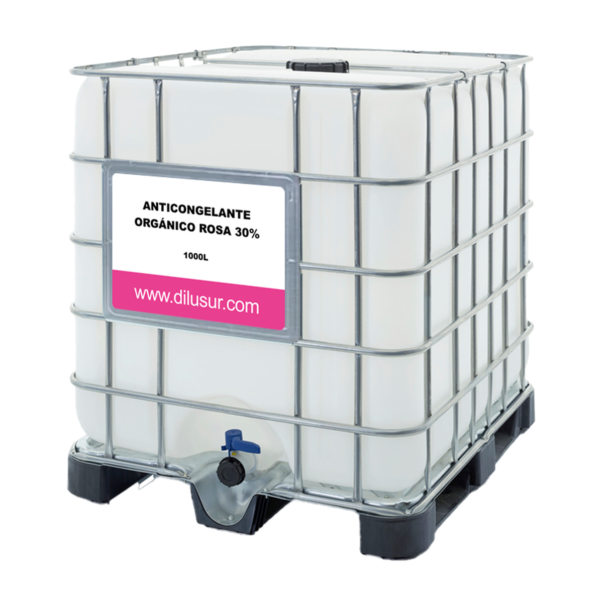 Anticongelante Rosa 30 % orgánico, universal para todo tipo de instalación de enfriamiento con radiador. La tecnología de anticongelantes orgánicos (OAT). Apto para todo tipo de marcas y vehiculos. Contenedor 1000 L. Iva incluido