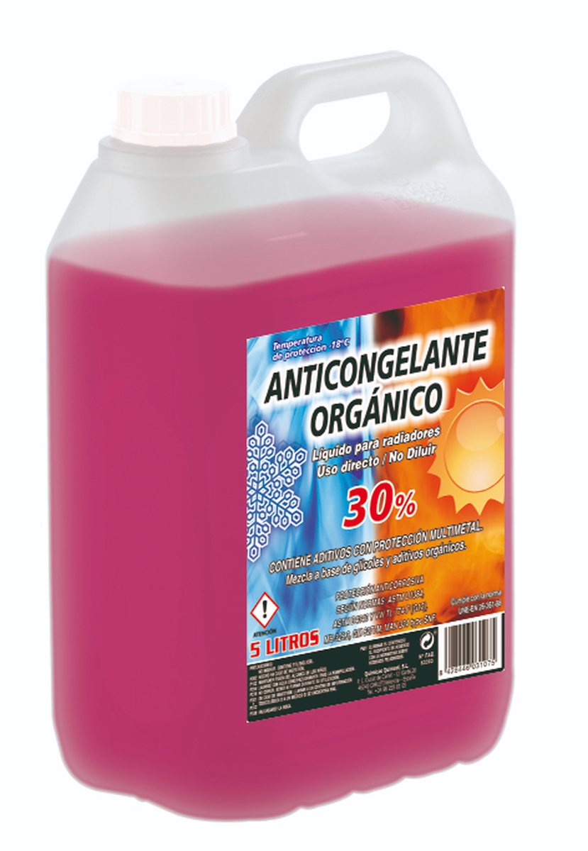 Anticongelante Rosa 30 % orgánico, universal para todo tipo de instalación de enfriamiento con radiador. La tecnología de anticongelantes orgánicos (OAT). Apto para todo tipo de marcas y vehiculos. Envase 5 L. Iva incluido