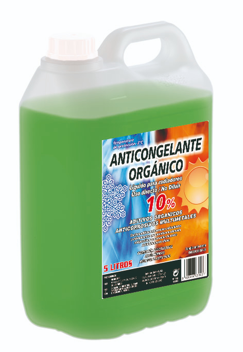 Anticongelante verde 10 % orgánico con normativa UNE-EN- 26-361-88, anticorrosivo norma ASTM D1384, ASTM D4340 para todo tipo de instalación de enfriamiento con radiador. Con tecnología (OAT). Envase 5 L. Iva incluido