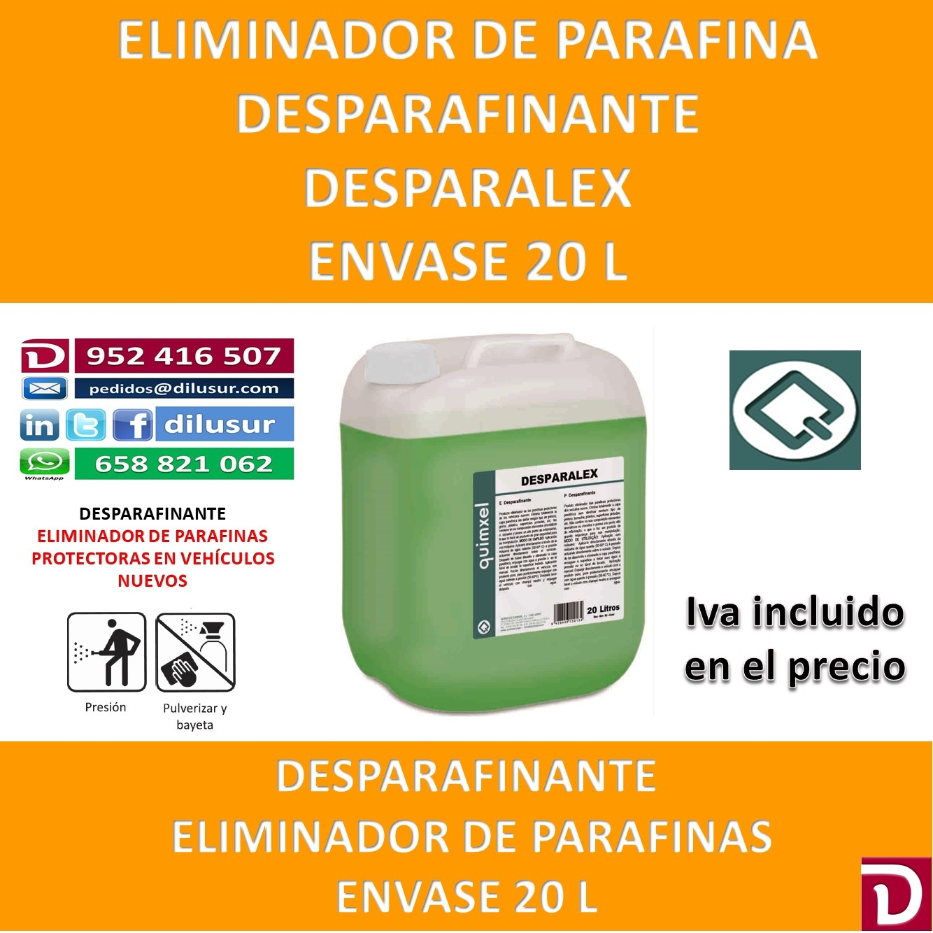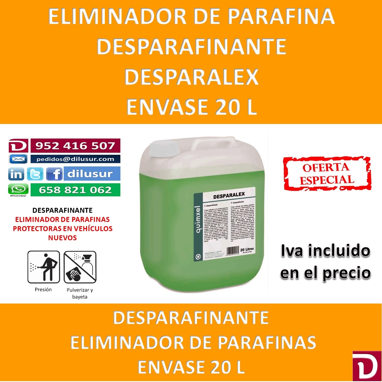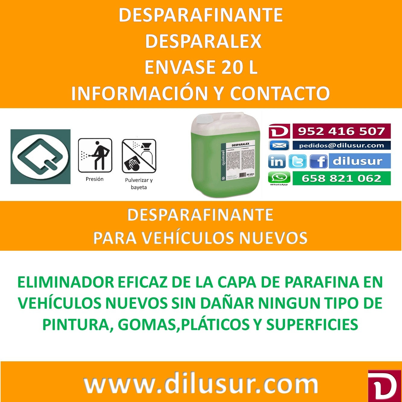 Desparafiante, eliminador de parafinas protectoras de los vehículos nuevos. No daña pinturas,gomas, plástico y superficies pintadas. Envase 20 L, Iva incluido