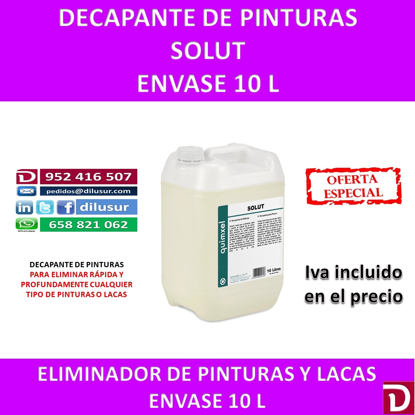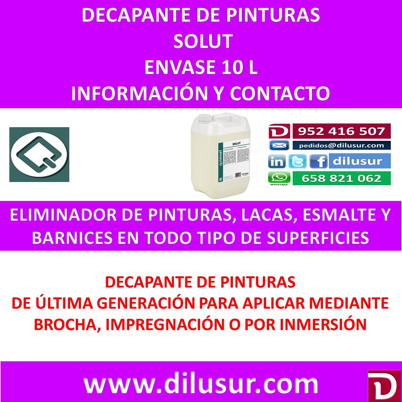 Decapante de pinturas, adecuado para la eliminación de cualquier tipo de pintura, barniz,esmalte,laa etc. De fácil aplicación por brocha, impregnacion o inmersión. Envase 10 L, Iva incluido