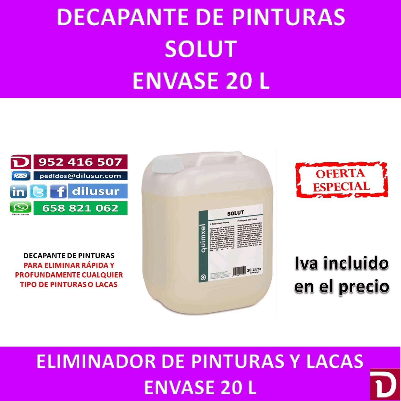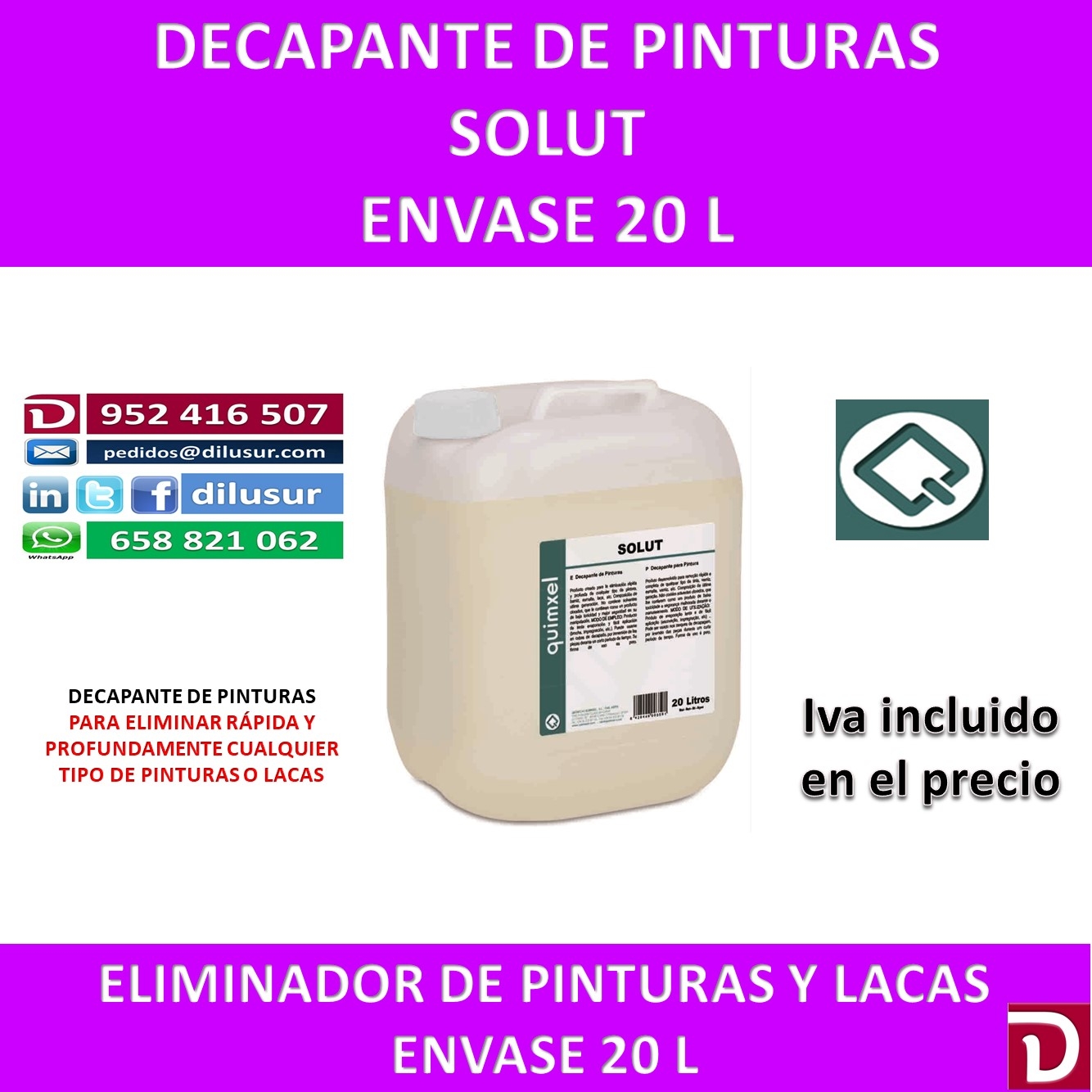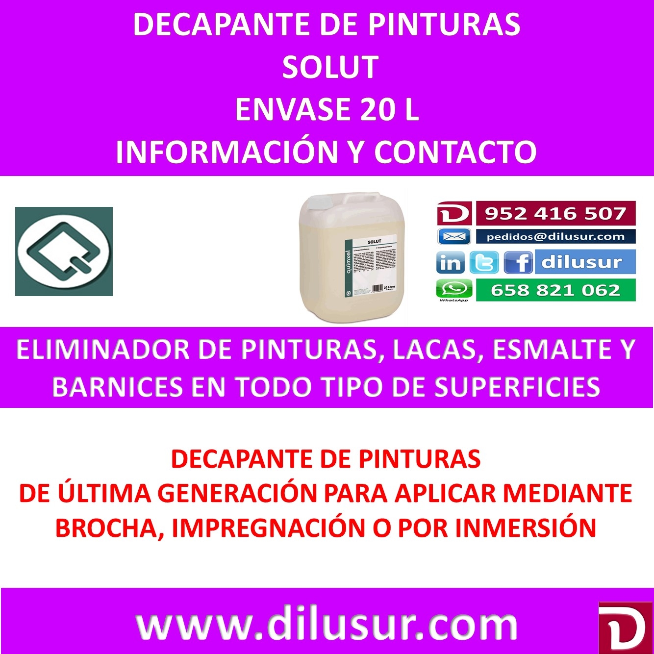 Decapante de pinturas, adecuado para la eliminación de cualquier tipo de pintura, barniz,esmalte,laa etc. De fácil aplicación por brocha, impregnacion o inmersión. Envase 20 L, Iva incluido
