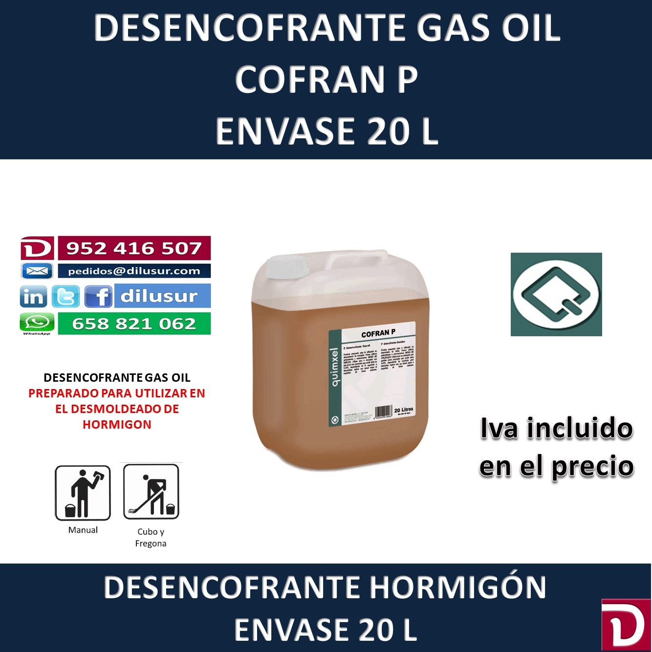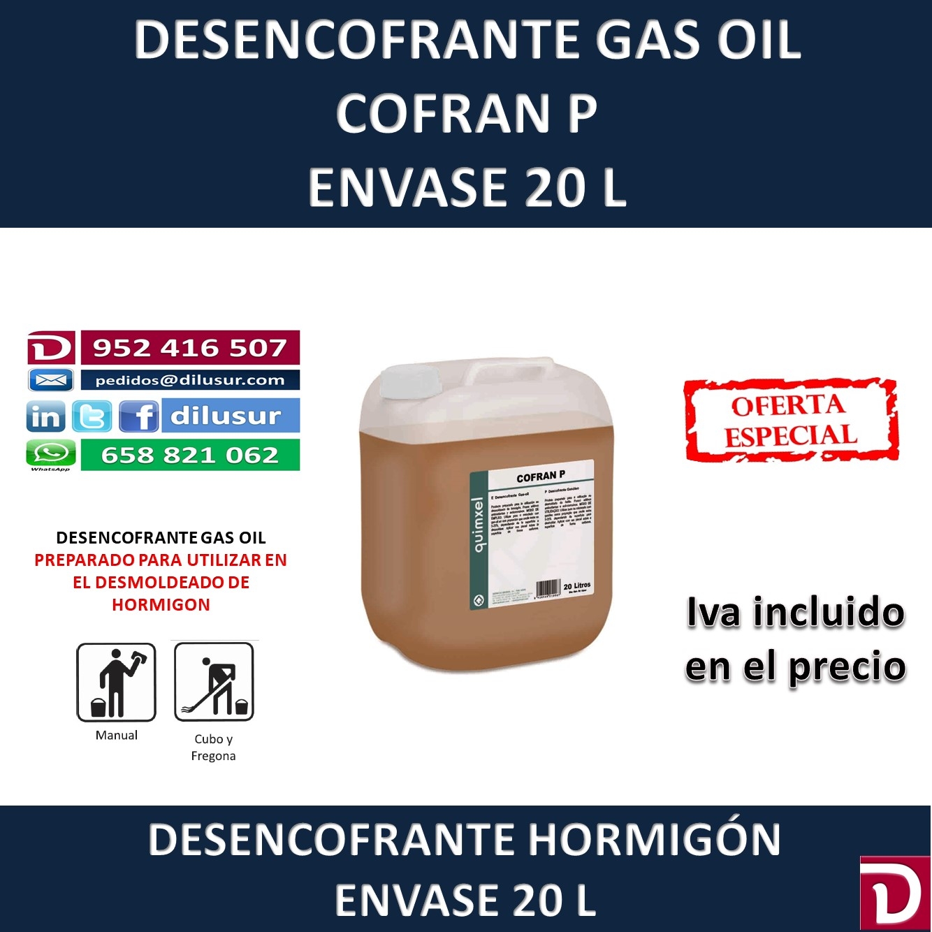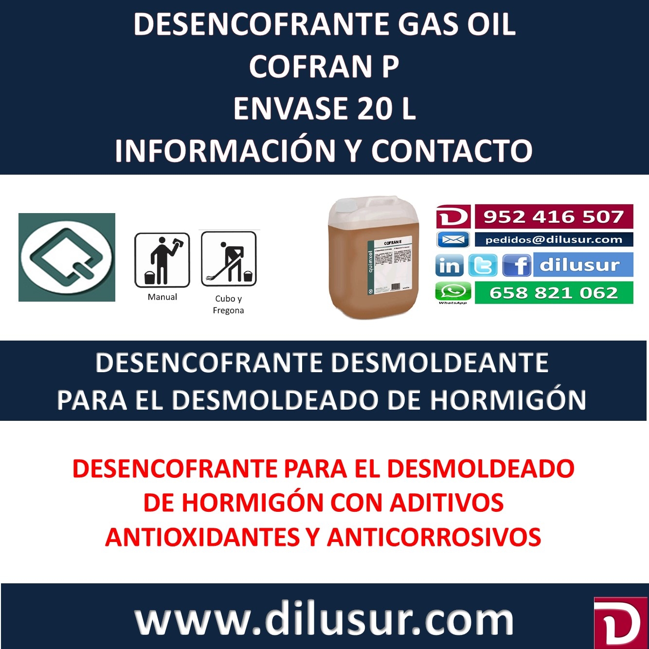 Desencofrante Gas oil, creado para utilizar en el desmoldeado de hormigón, antioxidante y anticorrosivo. Envase 20 L, Iva incluido