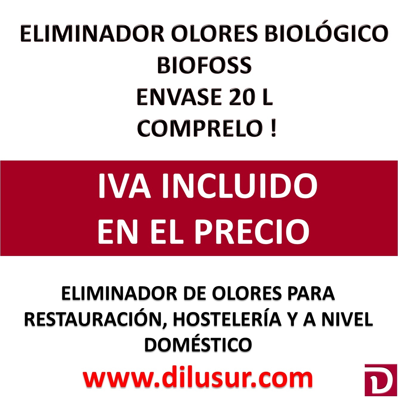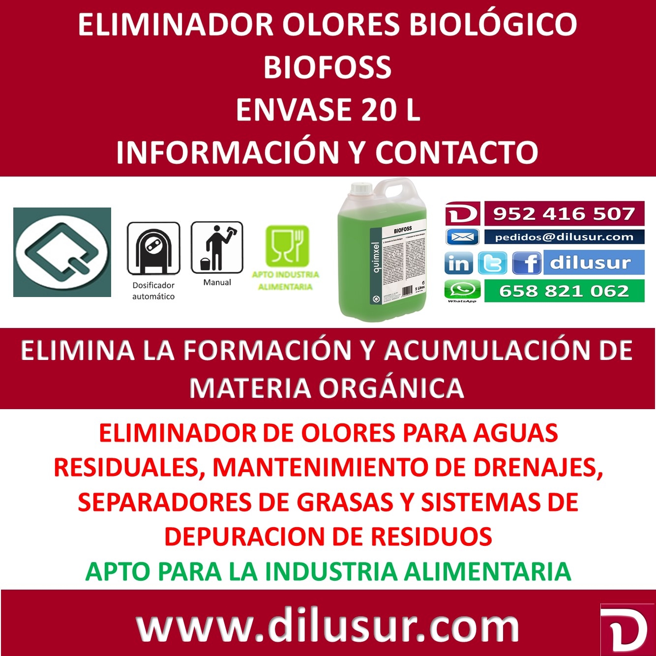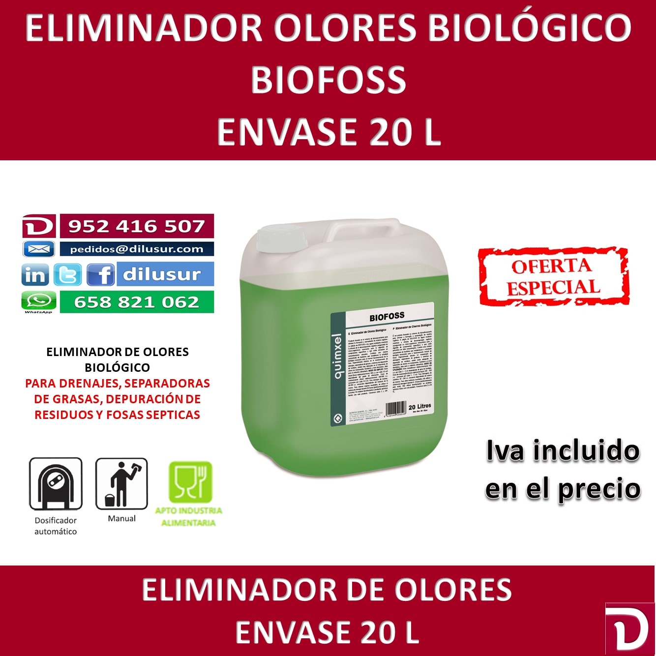 Eliminador de Olores biológico, elimina la formación y acumulación de materia orgánica. Contiene bacterias que restablecen la actividad biológica. Para drenajes, separadoras de grasas, sistemas de depuración, Envase 20 L, Iva incluido
