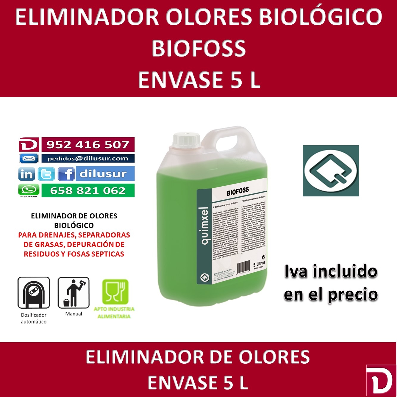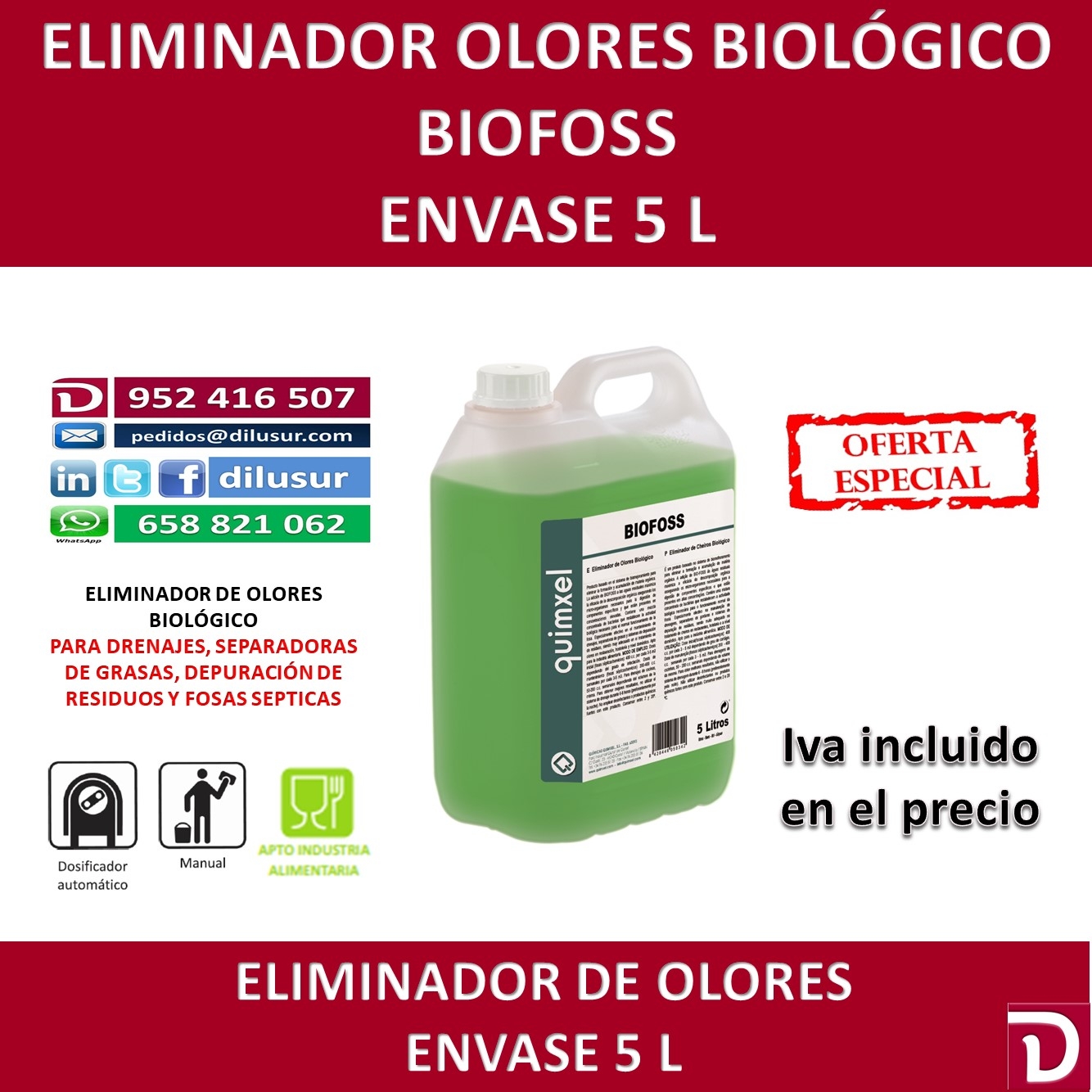 Eliminador de Olores biológico, elimina la formación y acumulación de materia orgánica. Contiene bacterias que restablecen la actividad biológica. Para drenajes, separadoras de grasas, sistemas de depuración, Envase 5 L, Iva incluido