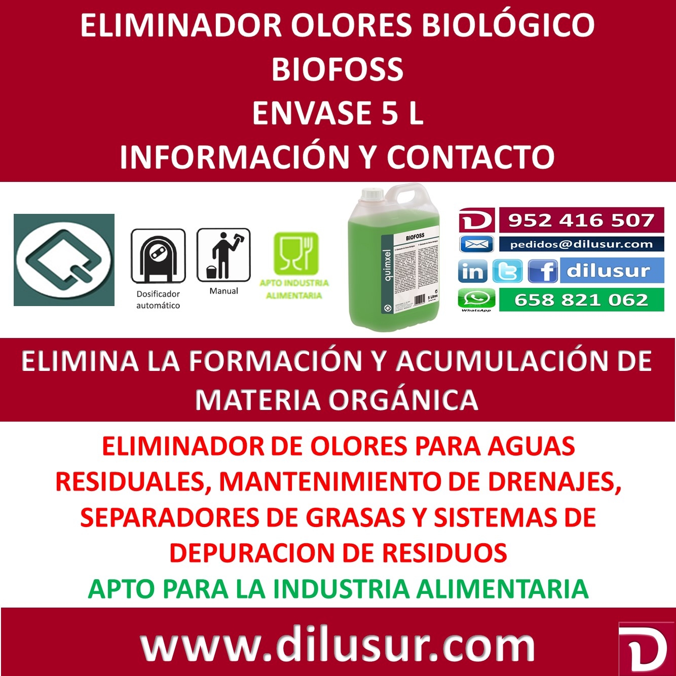 Contiene una mezcla concentrada de bacterias que restablecen la actividad biológica necesaria para el normal funcionamiento de la fosa. Especialmente efectivo en el mantenimiento de drenajes, separadoras de grasas y sistemas de depuración de residuos, siendo muy adecuado para el tratamiento de olores en restauración, hostelería y nivel doméstico. Apto para la industria alimentaria