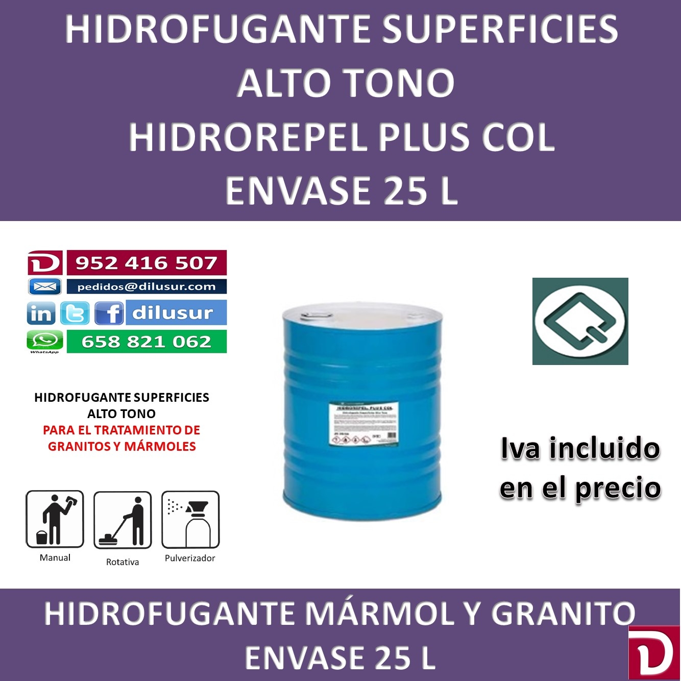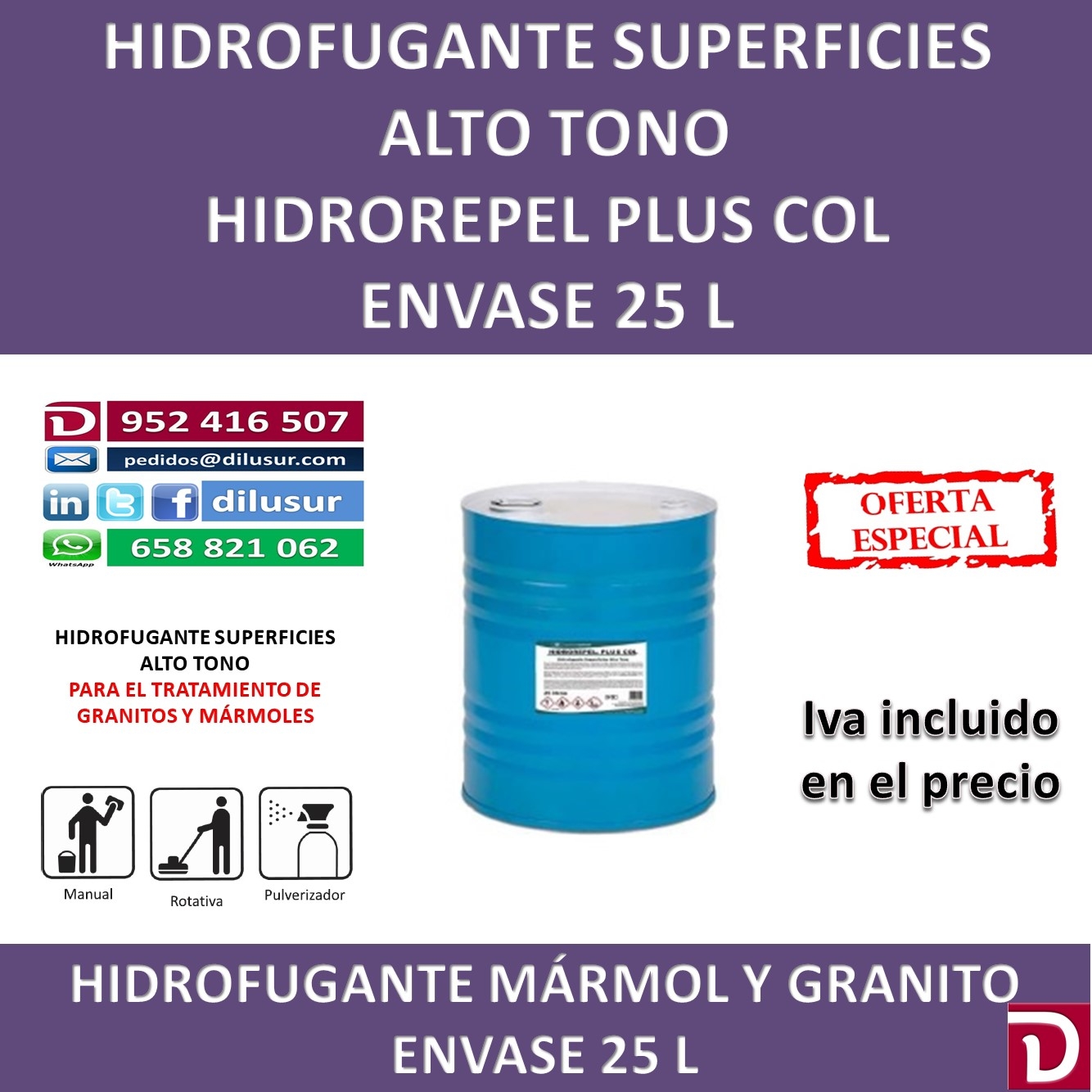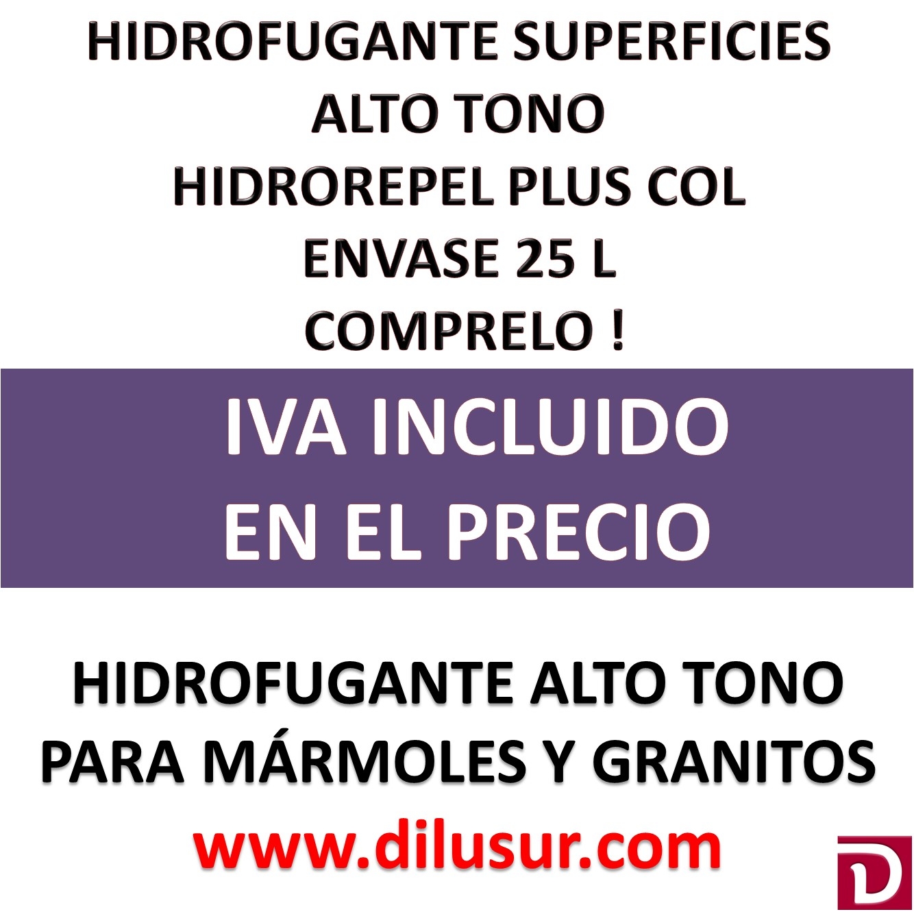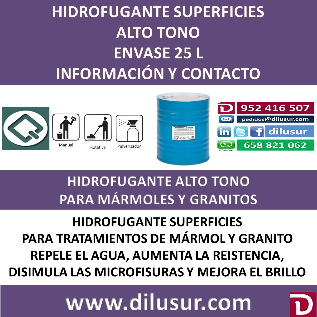 Hidrofugante superficies alto tono, para el tratamiento de granitos y mármoles, disimula las microfisuras en las superficies, repelente de agua y resistente al envejecimiento, realza el brillo. Envase 25 L. Iva incluido