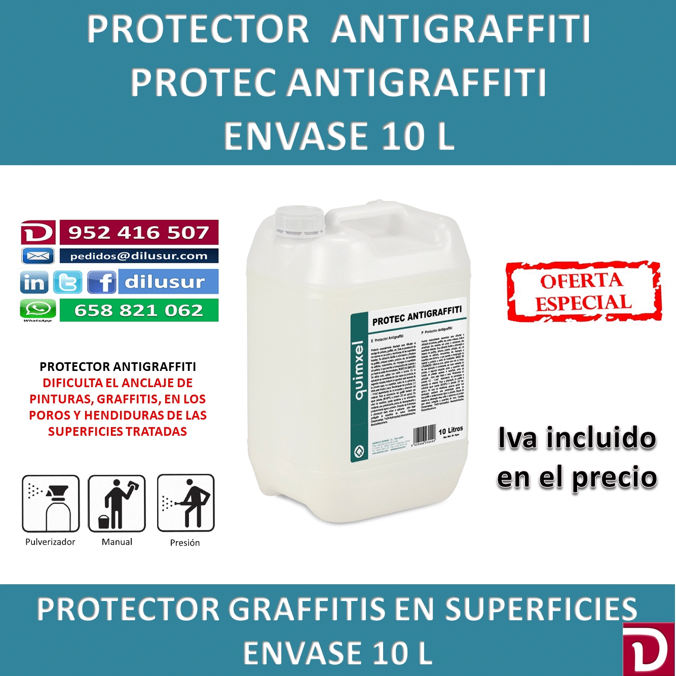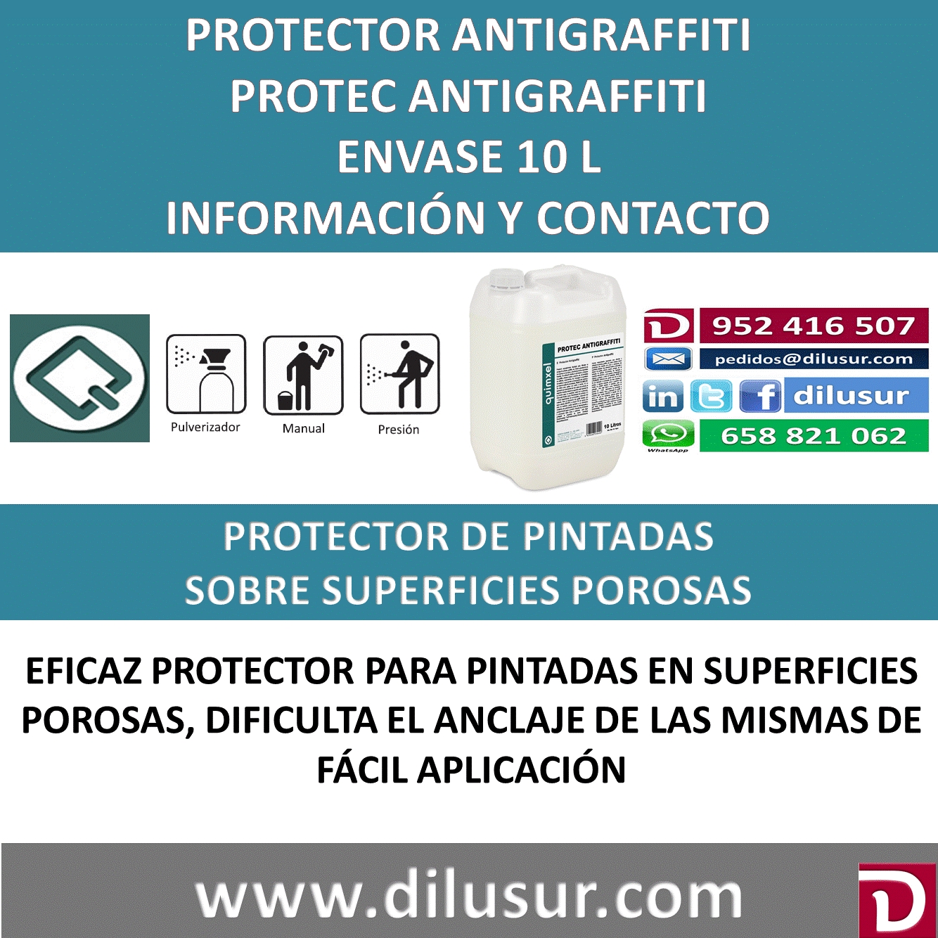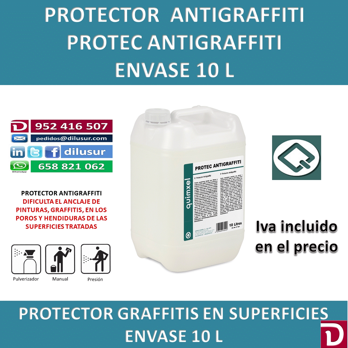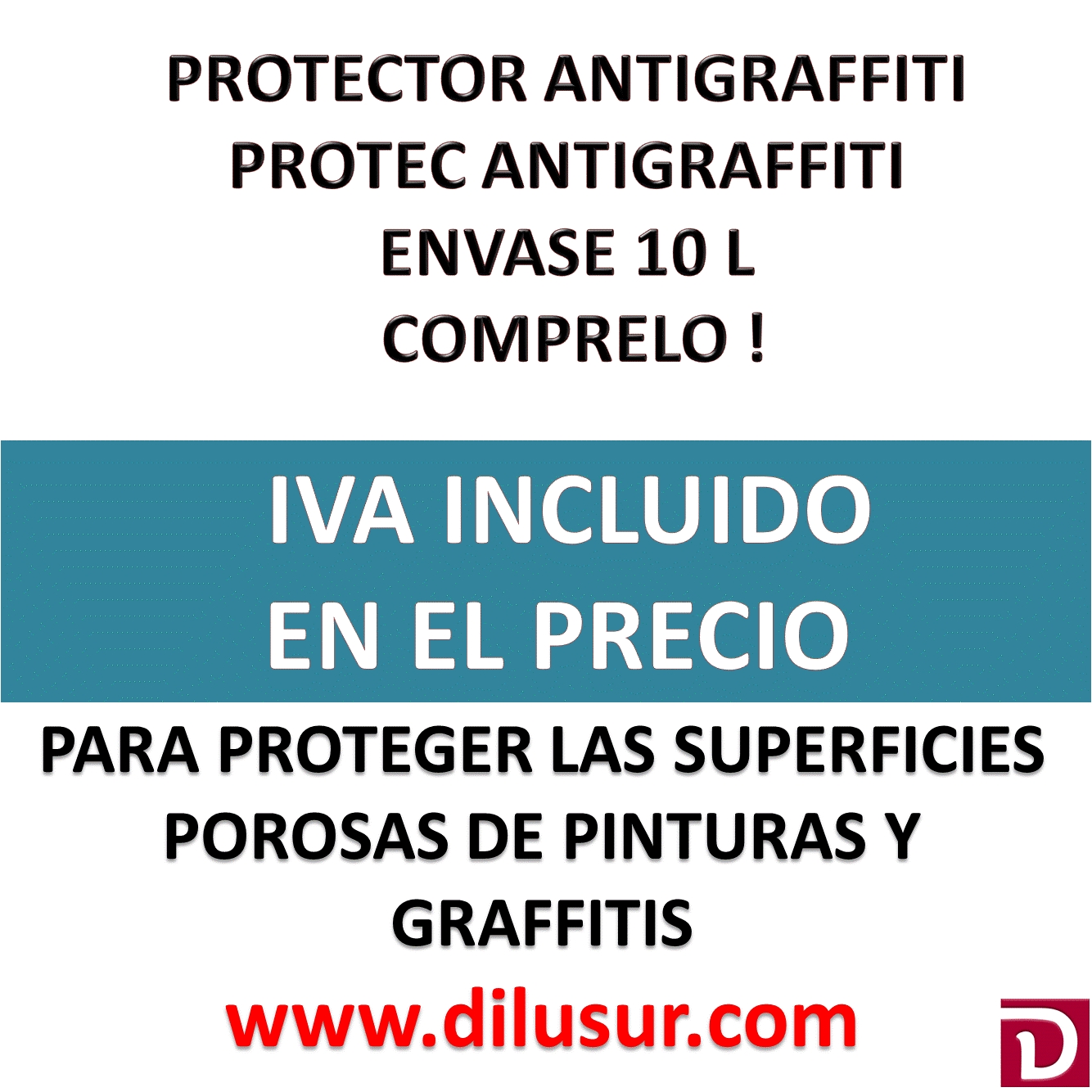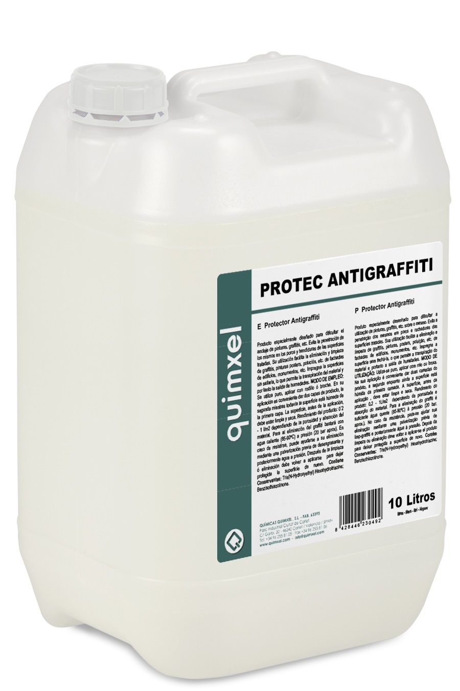 Protec Antigraffiti, especialmente diseñado para dificultar el anclaje de pinturas, graffitis, etc. Evita la penetración de los mismos en poros y hendiduras de las superficies tratadas. Envase 10 L, Iva incluido