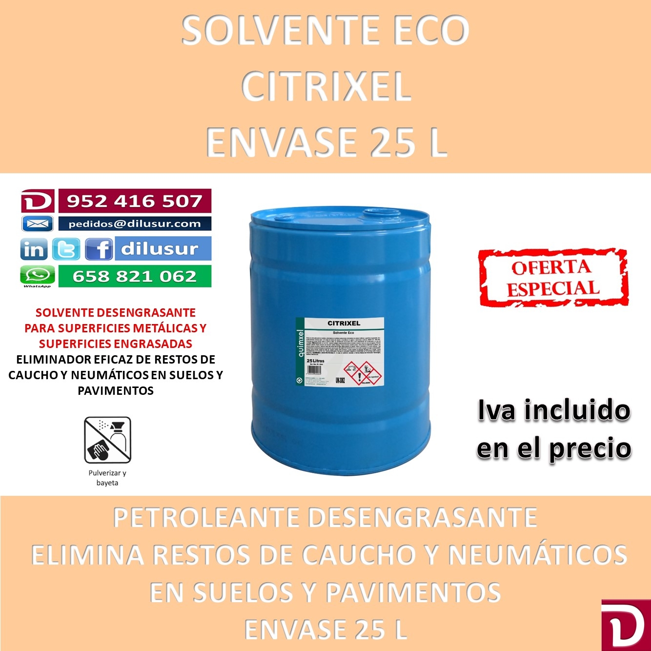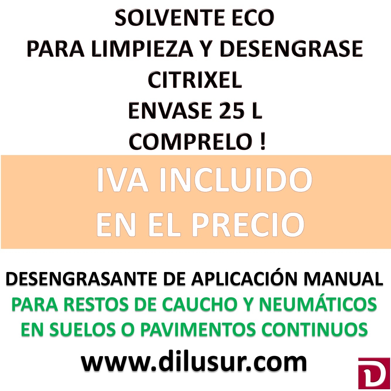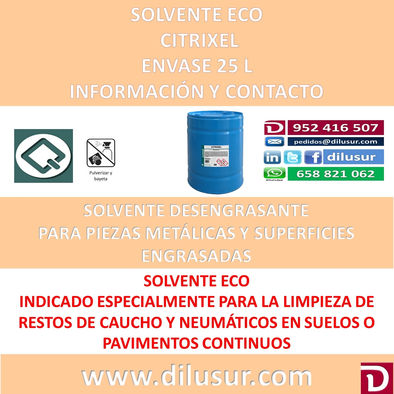 Solvente Eco, para limpieza y desengrase en multiples aplicaciones, piezas metálicas superficies engrasadass. Especialmente indicado para la limpieza de restos de caucho y neumáticos en suelos y pavimentos continuos. Envase 25 L, Iva incluido
