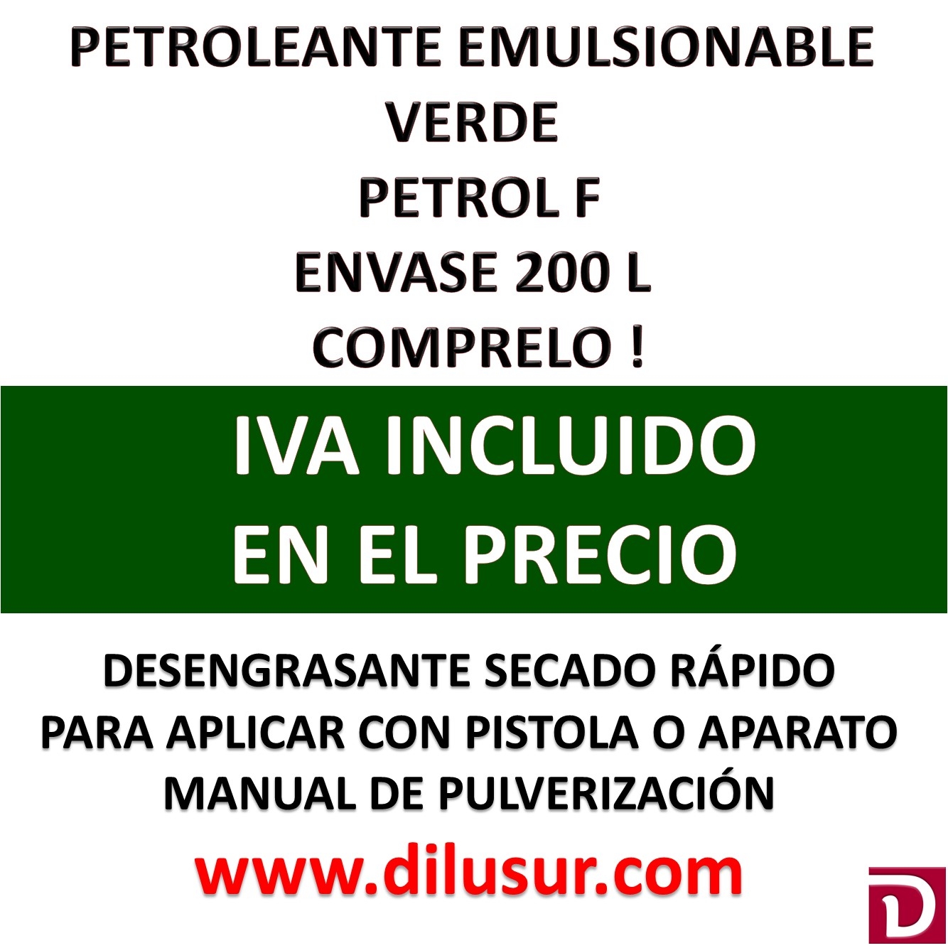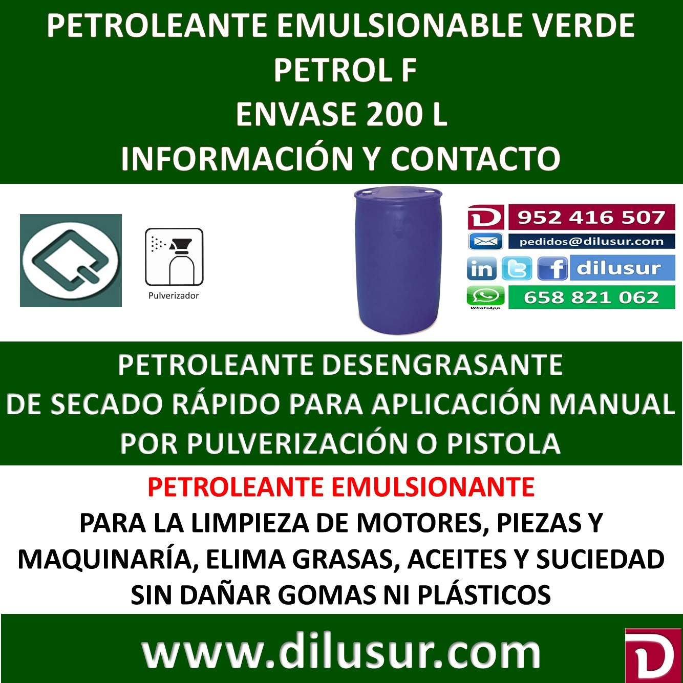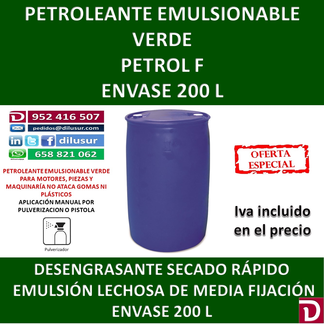 Petroleante emulsionable verde para limpieza de motores, pieza y maquinaria por pulverizacion. No daña gomas ni plásticos, de fijación media. Envase 200 L. Iva incluido